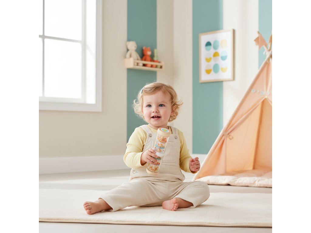 Dažďová palica Baby Raini Dažďová palica pre bábätká s upokojujúcim zvukomDažďová palica Baby Raini vydáva príjemný „dažďový“ zvuk pri otáčaní. Bábätko sleduje pohyb a počúva šelestenie, čím sa prirodzene rozvíja pozornosť a koordinácia.Rýchly prehľad efekt: upokojujúci zvuk dažďa odporúčaný vek: od 12 mesiacov rozvíja: zmysly, koordináciu, pozornosť vhodné: na jemnú hru a upokojenieDodatočné parametre
