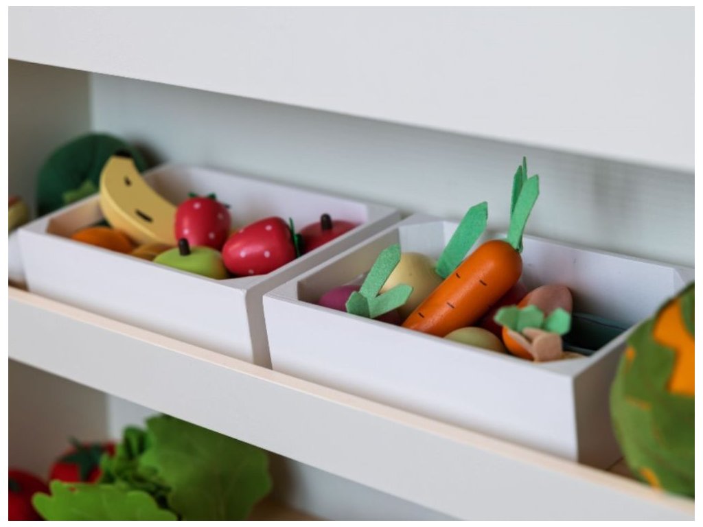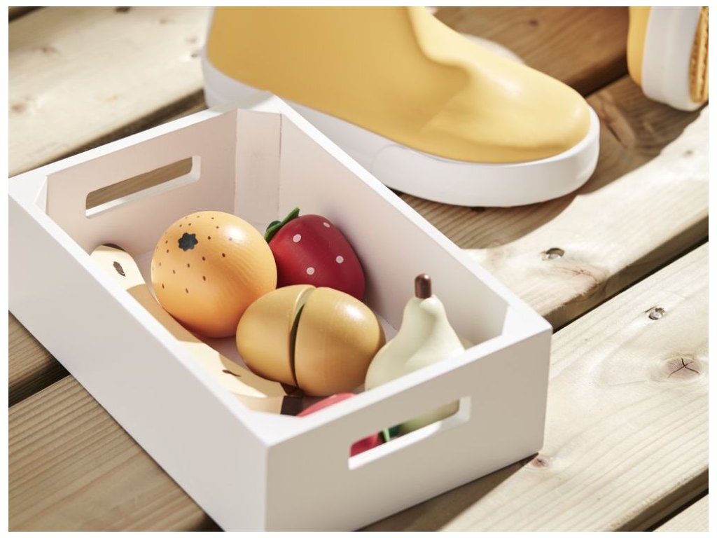 drevené ovocie v debničke Drevené ovocie uložené v praktickej drevenej debničke je drevenou hračkou, ktorá dodá hre v detskej kuchynke alebo obchodíku nový rozmer. So zmesou dreveného ovocia môžu deti variť, chystať pokrmy, predávať ich a dokonca aj porciovať. Kiwi a pomaranč môžu deti rozkrojiť na polovice a pomocou suchého zipsu opäť spojiť. V debničke deti nájdu banán, kiwi, jahody, jablko, hrušku a pomaranče, jednoducho samé vitamínové bomby na zdravé varenie. Technické parametre: Obsah balenia: drevená debnička, banán, kiwi (z 2 polovíc), jahody, jablko, hruška a pomaranče (z 2 polovíc). Počet dielov v balení: 13 ks. Rozmer debničky: 18 x 12 x 5,5 cm. Rozmery: 11,5 cm (banán), 4,5 x 4,5 x 5 cm (ostatné ovocie). Hmotnosť: 399 g. Materiál: lipová preglejka, drevo zo stromu Schima, polyester. Farba: viacfarebné (farba na vodnej báze). Certifikáty: CE. Odporúčaný vek: od 3 rokov. Údržba a čistenie: Čistite vlhkou handričkou. Utrite do sucha čistou handričkou. Upozornenie: Nevhodné pre deti do 3 rokov. Hračka obsahuje malé časti, hrozí nebezpečenstvo udusenia.Dodatočné parametre