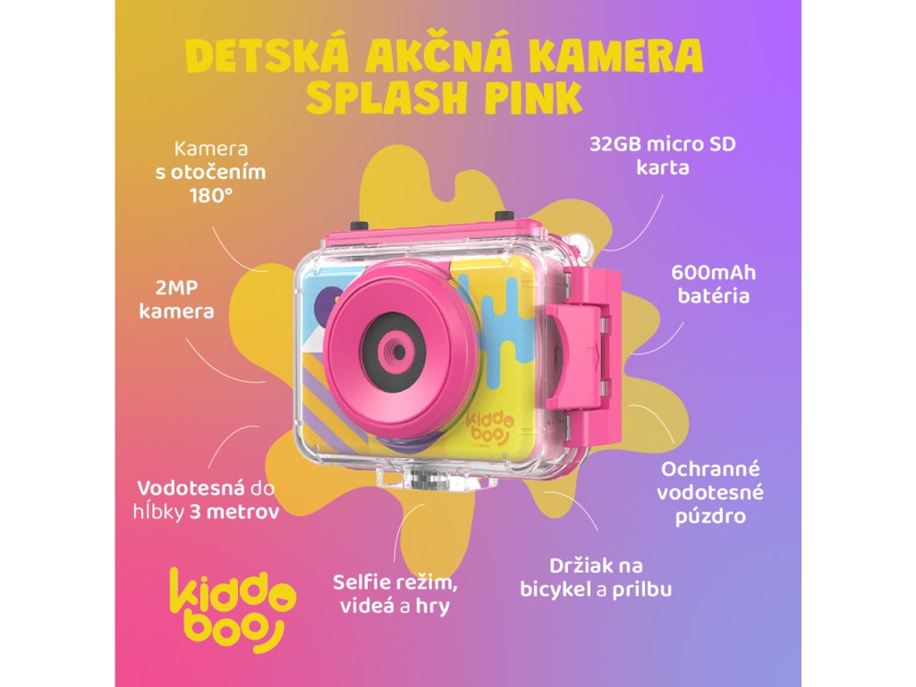 Detská akčná kamera Splash Pink Kamera pre malých dobrodruhov Objavte svet fotografie a videa s Kiddoboo detská akčná kamera Splash Pink – ideálnym spoločníkom pre deti od 6 rokov. Táto ružová akčná kamera je navrhnutá špeciálne pre malých objaviteľov, ktorí chcú zachytiť svoje dobrodružstvá na súši, v piesku aj pod vodou. Má jednoduché ovládanie, bezpečný dizajn a obsahuje aj pár hier.Prečo si ju deti zamilujú?Kamera s otočením 180° – umožňuje jednoduché selfie a záznam z rôznych uhlovVodotesná do hĺbky 3 metrov – vďaka ochrannému puzdru je ideálna na plávanie a vodné hry2MP kamera – zachytáva kvalitné fotografie a videá32GB micro SD karta – dostatok miesta na všetky spomienky600mAh batéria – poskytuje dlhú výdrž pre nepretržitú zábavuPríslušenstvo, ktoré čaká vo vnútri:Ochranné vodotesné puzdroDržiak na bicykelPútko na krkDržiak na prilbuKiddoboo Splash Pink je viac než len kamera – je to nástroj, ktorý podporuje kreativitu, dobrodružstvo a zábavu. Ideálny darček pre deti, ktoré chcú objavovať svet a zachytiť svoje nezabudnuteľné momenty. Tu nájdete návodDodatočné parametre