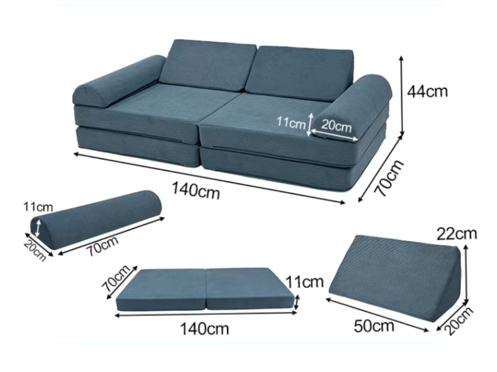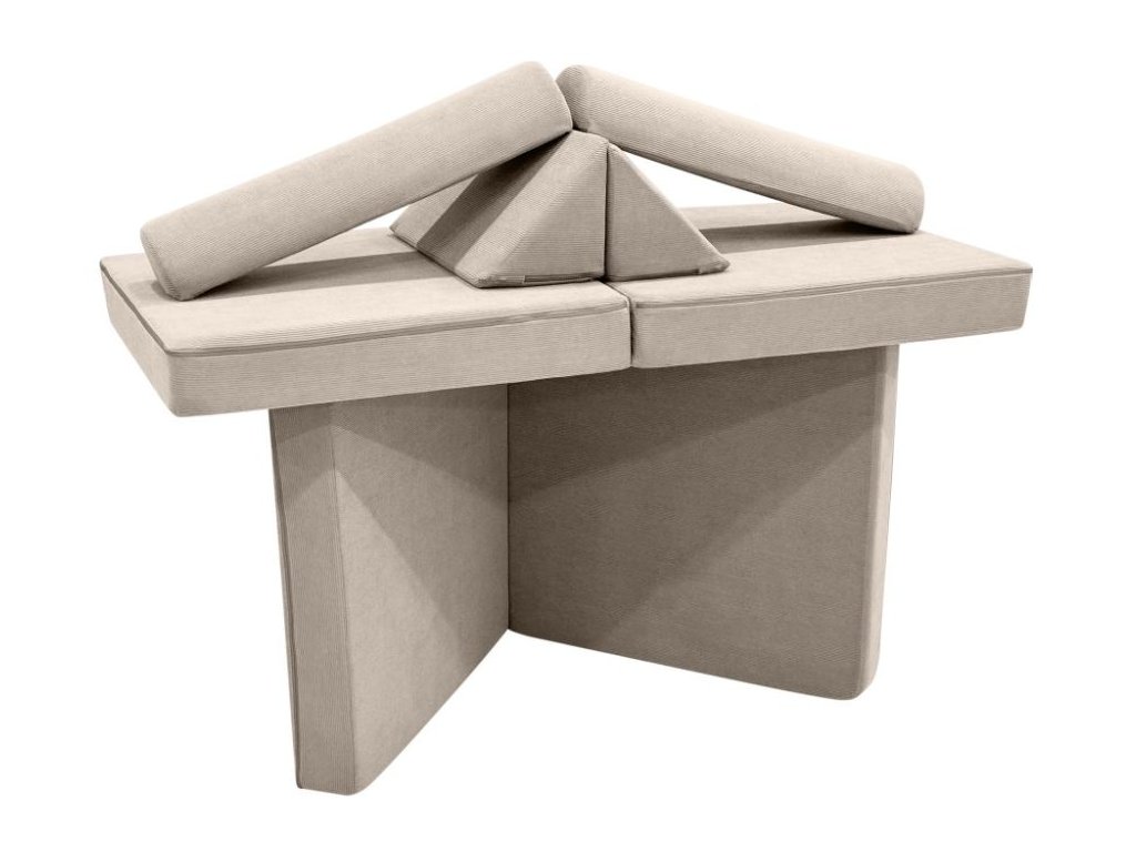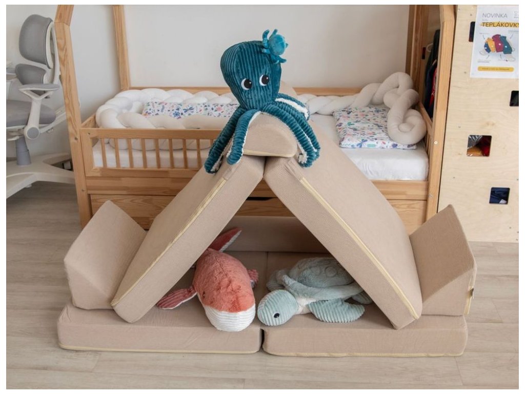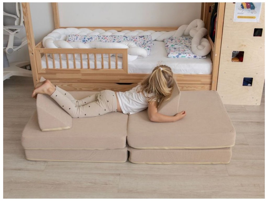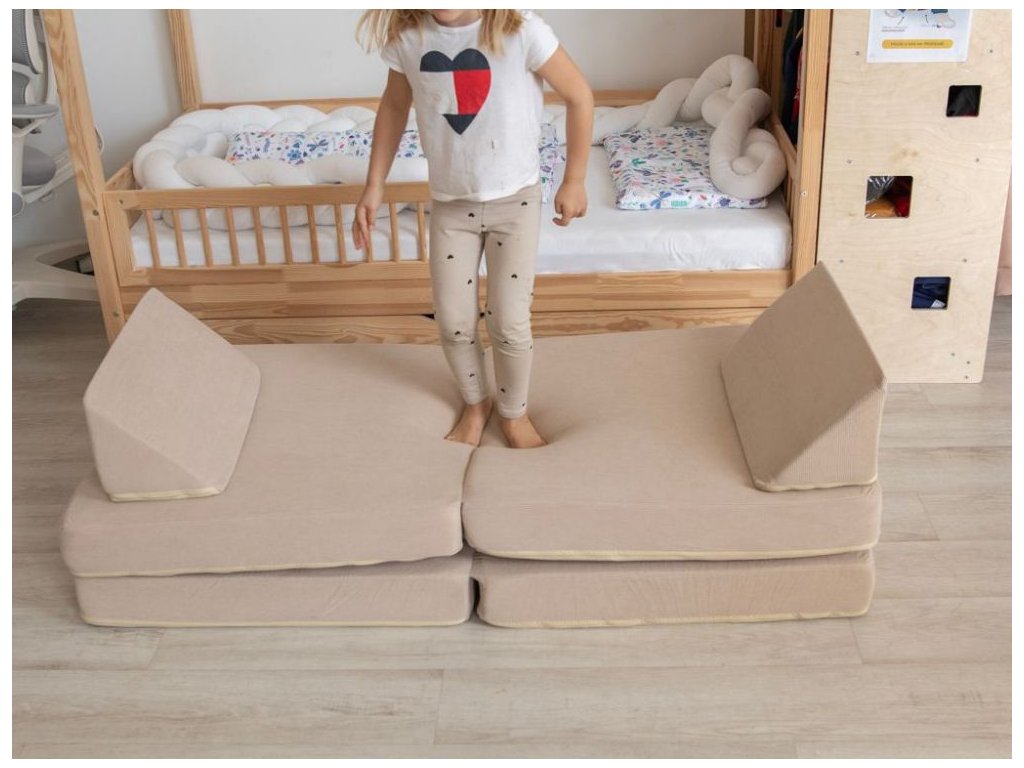 Rozkladacia a úžasná multifunkčná pohovka, v neutrálnej bážovej farbe, je parádnym doplnkom do každého interiéru. Pohodlná pohovka sa jednoduchým premiestnením jednotlivých dielov ľahko premení na kreslo, puf, matrac, bunker, domček, prekážkovú dráhu, jednoducho záleží len na detskej fantázii a aktuálnych potrebách, na čo túto úžasnú sedačku premenia a koľko dielov k tomu použijú. Deti milujú bunkre, najrôznejšie skrývačky a domčeky, týmto všetkým môže tento detský nábytok byť. Pohovka, či už rozložená alebo zložená, ponúkne deťom pohodlie pri leňošení a ponúka množstvo možností na hranie. Poťah každého dielu sedačky je opatrený zipsom, aby bolo možné poťah v prípade potreby zložiť a vyčistiť. Prečo vybrať túto detskú pohovku: Pohodlná a multifunkčná - vnútorná výplň s vysokou hustotou a príjemný poťah doprajú deťom pohodlie. Množstvo možností - pohovku je možné rôzne polohovať, rozkladať, skladať, premeniť ju na kreslá, ležadlá, domček alebo bunker, na opičiu dráhu alebo preliezačku. Pohovka aj kreslá - pohodlnú pohovku jednoducho premeníte na 2 samostatné kreslá. Bunker aj domček - z jednotlivých dielov pohovky deti postavia domček, bunker alebo skrýšu. Je len na detskej fantázii koľko dielov použijú a akú bude mať ich úkryt podobu. Množstvo podôb - pohovka vďaka možnosti rozkladania môže mať množstvo podôb a byť v daný okamih tým, čo deti na leňošenie alebo na hranie potrebujú - sedačkou, kreslom, ležadlom, domčekom, bunkrom, opičou dráhou. Neutrálna farba - vďaka neutrálnej béžovej farbe je pohovka vhodná do každého interiéru, do izby dievčatiek aj chlapcov. Snímateľný poťah - poťah je možné v prípade znečistenia zo všetkých dielov pohovky zložiť a vyčistiť podľa pokynov na údržbu. Technické parametre: Rozmer: 44 x 70 x 142 (výška x šírka x dĺžka). Rozmer balenia: 41 x 41 x 76 cm. Hmotnosť: 8,6 kg. Hmotnosť balenia: 10,6 kg. Materiál: menčester. Farba: béžová. Odporúčaný vek: 0 - 12 rokov. Bezpečnostné normy: CE, EN71 O-TEX. Upozornenie: Pohovka bude dodaná v stlačenej podobe, potrvá cca 3-4 dni, než získa správnu podobu a veľkosť. eliNeli je česká značka drevených hračiek a nábytku s jedinečným farebným dizajnom a so zahraničnou výrobou. Produkty eliNeli rozvíjajú kreativitu a pohybový potenciál detí, skvele zapadnú do interiéru a vracajú sa k tradičnému materiálu — k drevu. Unikátna na značke je dizajnová kombinácia prírodných a neskorých letných až jesenných farieb, ktoré sa hodia do minimalistického scandi interiéru, a ktoré inde nenájdete. To všetko za veľmi dostupné ceny. Viac o produktoch eliNeli nájdete na: https://www.elineli.eu/sk/. Pozrite sa, aké je jednoduché premeniť detskú pohovku na bunker:Dodatočné parametre