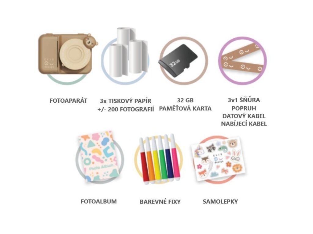 Digitálny foťák a kamera pre deti Detský hnedý 48megapixelový digitálny fotoaparát s detailom medvedíka, určený deťom od 4 rokov, pomôže dievčatkám s uchovaním najkrajších spomienok. S 32GB pamäťovou kartou môžu deti urobiť až 2000 skvelých fotografií, zachycujúcich tie najdôležitejšie okamihy, alebo okolo 4 hodín záznamu v rozlíšení 1080P, ktorý prináša ostrý a plynulý obraz. Fotografie si môžu uložiť alebo čiernobielo vytlačiť na tlačový papier ukrytý vo fotoaparáte. Tlač funguje na princípe prenosu tepla, takže nie sú potrebné žiadne drahé atramentové kazety. Ďalším príslušenstvom sú samolepky, dátový kábel, popruh, pero alebo napríklad fotoalbum. Funkcie, vďaka ktorým fotografie nadobudnú nový rozmer sú napríklad funkcia portrétu a filtrov. Fotoaparát je vhodné doplniť sadou náhradného fotopapiera alebo ochranným silikónovým puzdrom. Deti určite vymyslia množstvo skvelých príležitostí na použitie fotoaparátu, napríklad vonku, na výlete, na oslave, môžu obdarovať svojich najbližších zachytenými momentkami. Prečo vybrať tento detský fotoaparát: Funkcia 3v1 – fotografovanie, nahrávanie videí a okamžitá tlač. Video v rozlíšení 1080P - prináša ostrý a plynulý obraz. Jedinečný dizajn - neutrálna farba a atraktívne oblé tvary s roztomilým detailom medvedíka. Pamäťová karta 32GB - je súčasťou dodávky. Kreatívna činnosť pre deti - v ponuke funkcia na úpravu portrétov a filtre. Okamžitá termálna tlač - žiadne atramentové kazety, tlačí sa pomocou tepla na špeciálny papier, možnosť vystaviť si alebo nalepiť fotografie napríklad do fotoalbumu. Jednoduché ovládanie – prehľadné menu, jednoduchá navigácia. Náhradný fotopapier - fotiť a tlačiť fotografie môžu deti bez obáv, že im dôjde fotopapier. V našej ponuke totiž nájdete aj Náhradný fotopapier, vďaka ktorému bude fotenie a tlač nekončiacou zábavou. Možnosť prikúpiť obal (ochranné puzdro) - na jednoduché prenášanie a vyššiu ochranu môžete detský fotoaparát doplniť Silikónovým obalom. Technické parametre: Obsah balenia: 1x fotoaparát, 1x USB kábel, 1x MicroSD karta 32 GB , 1x ochranná fólia na displej fotoaparátu, termopapier, 1x háčik a popruh, 1x sada nálepiek, 1x farebné pero, 1x detský fotoalbum, 1x ochrana displeja, 1x návod. Rozmer fotoaparátu: 9,2 x 12,8 x 5,9 cm (výška x šírka x dĺžka). Rozmer balenia: 6,3 x 16 x 16 cm (výška x šírka x dĺžka). Hmotnosť fotoaparátu: 165 g. Hmotnosť balenia: 173 g. Materiál: ABS, silikón. Nabíjanie: s priloženým USB káblom. Funkcie: fotenie fotografií, nahrávanie videa, tlač fotografií, funkcia portrétov a filtre, prehliadanie fotoalbumu, mazanie fotografií a nastavenie jazyka. Odporúčaný vek: od 4 rokov, 4+. Normy a certifikáty: CE, RoHS, EN71-1,2,3. Čistenie a údržba: Digitálny fotoaparát čistite len mierne navlhčenou handričkou. Udržujte fotoaparát mimo dosahu priameho slnečného žiarenia a zdrojov tepla, chráňte ho pred vlhkosťou a zabráňte kontaktu s vodou, nie je určený na použitie vo vode ani pod vodou. Chráňte digitálny fotoaparát pred pádom na tvrdé povrchy. Upozornenie: Pre optimálny výkon použite 5V nabíjačku na dobitie zariadenia, keď je batéria takmer vybitá. Reštartujte fotoaparát pomocou resetovacieho tlačidla, ak nefunguje správne. Aby ste predišli poškodeniu batérie, používajte zariadenie len na určený účel. Neprenášajte súbory fotografií ani videá z iných fotoaparátov do tohto fotoaparátu. Foťák by mal byť používaný len pod dohľadom dospelej osoby.Dodatočné parametre