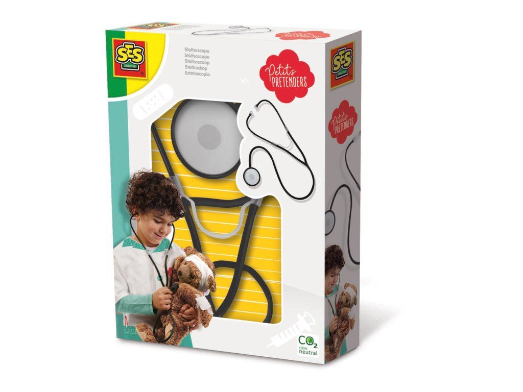 Skutočný lekár má vždy stetoskop! Vypočujte si búšenie srdca vašich pacientov s týmto funkčným stetoskopom SES. Nechajte vašich kamarátov, aby si vypočuli vaše srdiečko. Kto má vyššiu tepovú frekvenciu? Sada obsahuje: 1 stetoskop. Rozmery balenia: 15 x 20 x 4 cm. Vek: 3+Dodatočné parametre