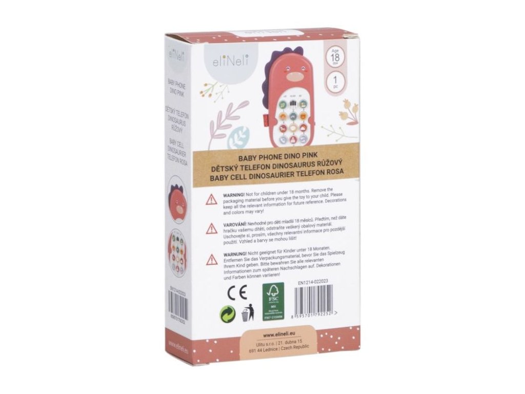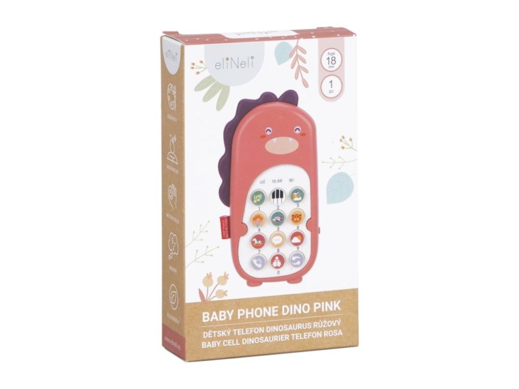 eliNeli je česká značka drevených hračiek a nábytku s jedinečným farebným dizajnom a so zahraničnou výrobou. Produkty eliNeli rozvíjajú kreativitu a pohybový potenciál detí, skvele zapadnú do interiéru a vracajú sa k tradičnému materiálu — k drevu. Unikátna na značke je dizajnová kombinácia prírodných a neskorých letných až jesenných farieb, ktoré sa hodia do minimalistického scandi interiéru, a ktoré inde nenájdete. To všetko za veľmi dostupné ceny. S detským telefónom, s vlastným mobilom, si deti budú pripadať dôležito a dospelo. Konečne môžu zavolať babičke alebo svojmu kamarátovi, alebo skôr sa na to aspoň hrať. Parádny telefón v podobe roztomilého dinosaura obsahuje celkom 12 tlačidiel a každé z nich prináša inú zábavu. Niektoré len vydávajú zvuky, iné hrajú pesničky a niektoré dokonca deti naučia anglicky. Ružový detský telefón (mobil) v podobe dinosaura je vybavený 12 obrázkovými tlačidlami s rôznymi funkciami. Ružový mobilný telefón deti zabaví, zahrá im pesničku a ešte ich naučí pár anglických slovíčok a výrazov: tlačidlo 1 - telefón vibruje a hrá pesničku, tlačidlo 2 - telefón hrá bez vibrácie, tlačidlo 3 - telefón hrá pesničky na dobrú noc, tlačidlo 4 - anglické slovíčka (téma rodina), tlačidlo 5 - anglické slovíčka (téma dopravné prostriedky), tlačidlo 6 - anglické slovíčka (téma zvieratká), tlačidlo 7 - zvukové tlačidlo, tlačidlo 8 - zvukové tlačidlo (SMS), tlačidlo 9 - zvuky počasia, tlačidlo 10 - telefón zvoní, tlačidlo 11 - anglické riekanky, tlačidlo 12 - telefón zahrá dve rýchle pesničky. Technické parametre: Rozmery: 14,2 x 2,4 x 8 cm. Materiál: plast. Farba: ružová. Certifikáty: CE, 2009/48/ES, EN 71-1, EN 71-2 a EN 71-3. Odporúčaný vek: od 18 mesiacov. Viac o produktoch eliNeli nájdete na: https://www.elineli.eu/sk/. Často kladené otázky: Je hračka bezpečná pre deti? Detský telefón eliNeli je testovaný, vhodný a bezpečný pre deti a vydrží vašim deťom dlho. Spĺňa požiadavky smernice o bezpečnosti hračiek 2009/48/ES a normy o nezávadnosti a bezpečnosti hračiek EN 71-1, 2, 3, kedy sa testujú mechanické a fyzikálne vlastnosti, horľavosť aj migrácia určitých látok. Detský telefón otestoval a Certifikát o zhode (Osvedčenie o zhode - CE) udelil technický a skúšobný ústav. U detského telefónu dinosaurus od eliNeli máte istotu, že je pre vaše deti vhodný a bezpečný, je testovaný, na náter sú použité netoxické, zdravotne nezávadné laky a farby.Dodatočné parametre