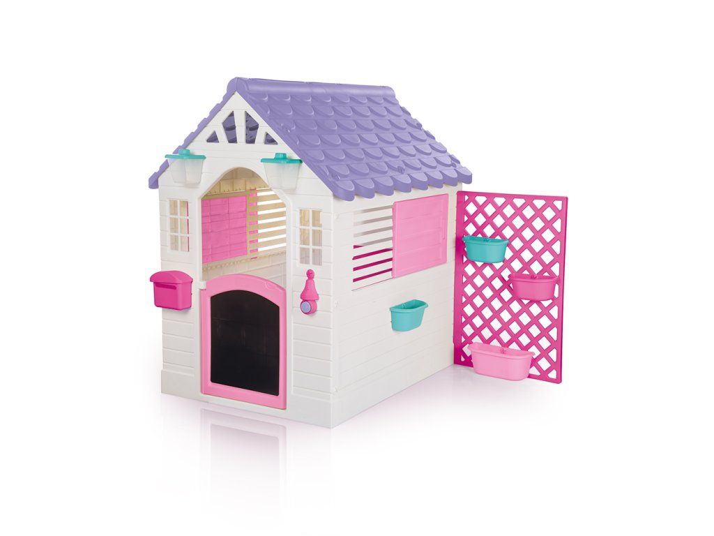 Vstúpte do úžasného záhradného domčeka s kvetinovou stenou. Krásny domček s prepracovanými detailmi v bielej farbe doplnený fialovou strechou, ružovými a modrými doplnkami. Strecha má efekt skutočných strešných tašiek. Zabavte deti v letných dňoch na záhrade alebo za daždivého počasia umiestnite domček dnu do herne. Záhradný domček s posuvnými okenicami a stenou so zavesnými kvetináčmi, kde si deti môžu vypestovať vlastné kvety. Domček má na vchodových dverách tabuľu, na ktorú je možné kresliť kriedou (kriedy nie sú súčasťou). V stene domčeka je vstup pre domáce zvieratká. Na jednej strane vedľa dverí je umiestnená schránka na listy a na druhej strane funkčné zvonček. Deti budú môcť objavovať všetky zábavné funkcie, až pozvú svojich kamarátov na návštevu. Tento záhradný domček podporuje detskú predstavivosť, manuálnu zručnosť a fyzický rozvoj. Vhodné pre použitie vonku aj vnútri. Potrebné batérie: 3 x 1,5V LR44 AG13 (sú súčasťou). Rozmery domčeka: 127 x 107,5 x 140 cm. Rozmery balenia: 127 x 140 x 107,5 cm. Vek: 2 +Dodatočné parametre