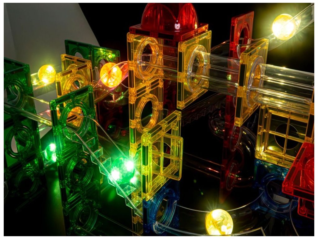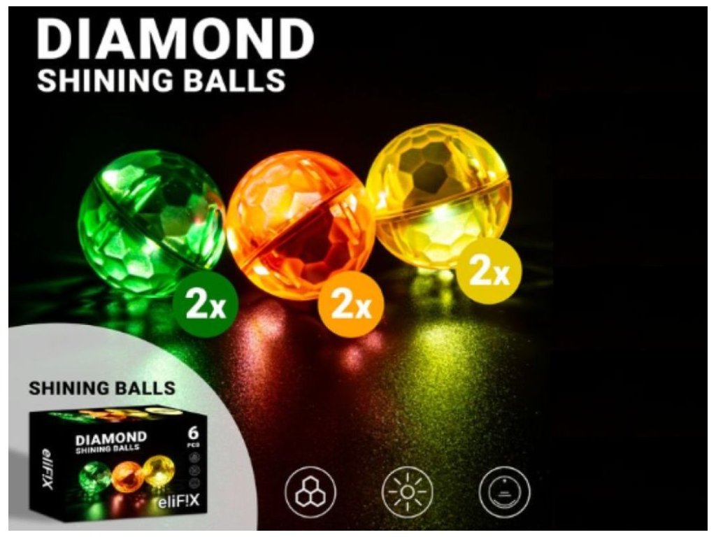 Svietiace guľôčky na svetelnú hru Sada obsahuje 6 svietiacich guľôčok s diamantovým dizajnom, ktoré sa pri pohybe automaticky rozsvietia a pri zastavení zhasnú. Vďaka tejto úžasnej vlastnosti si deti užijú zábavné hranie aj v tme - dráha sa rozžiari pohybujúcim sa svetlom a premení sa na kúzelný zážitok. Guľôčky sú ideálne na večernú hru. Svietiace guľôčky vhodne doplnia guľôčkové dráhy Elifix. Technické parametre: Obsah balenia: 6 svietiacich guľôčok. Rozmer balenia: 11,5 x 7,5 x 4 cm. Materiál: ABS. Odporúčaný vek: od 3 rokov.