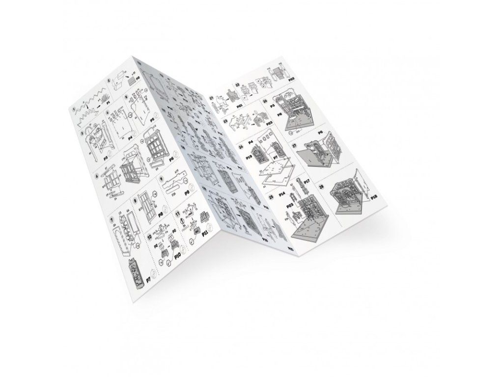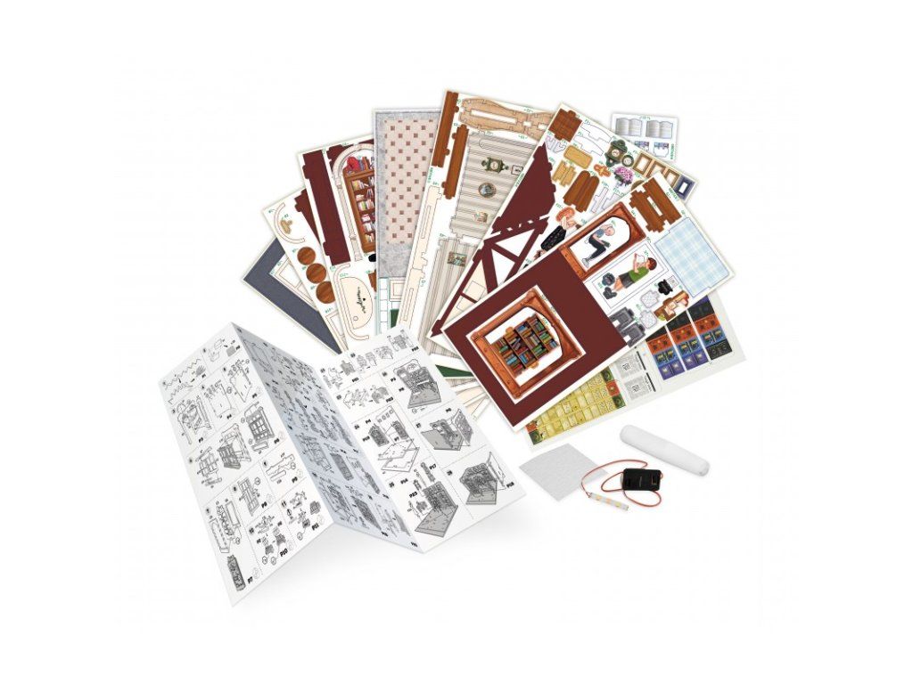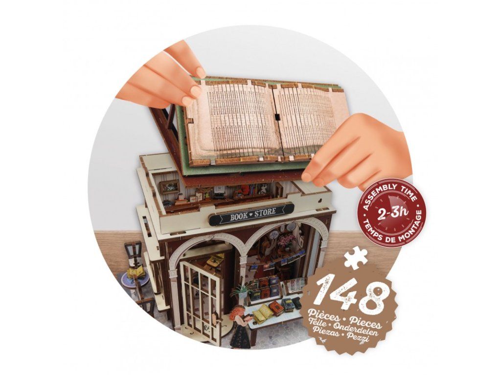 Zostavte drevené diely a postavte si vlastné miniatúrne kníhkupectvo. Vytvorte si útulnú a pokojnú atmosféru plnú kníh pomocou detailne spracovaných prvkov – lepte, strihajte a umiestňujte nábytok, doplnky, rastliny aj knihy presne podľa vašej predstavy. Vďaka očíslovaným dielom a prehľadnému návodu je skladanie jednoduché a zábavné.