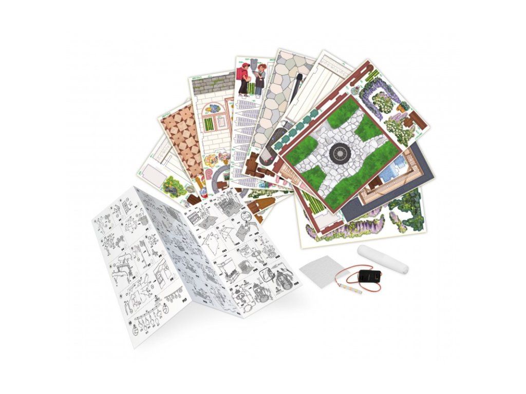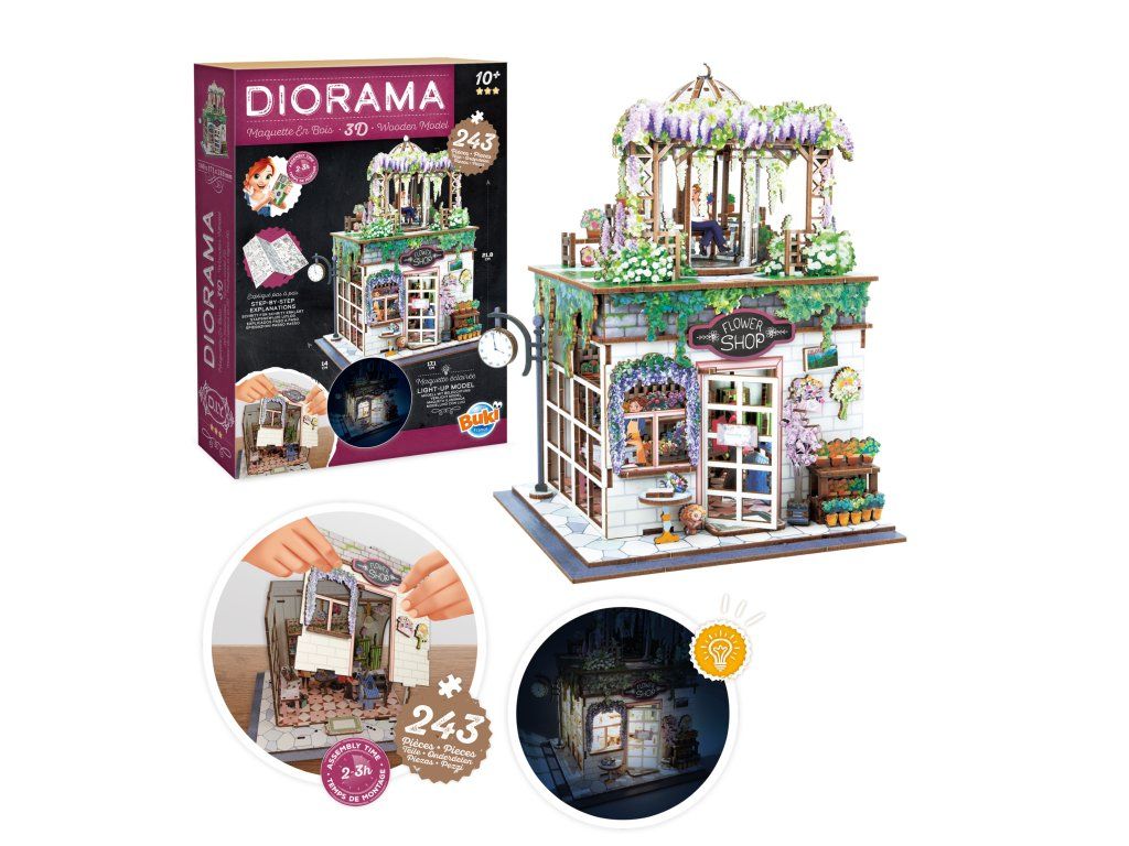 Zostavte drevené diely a postavte si vlastné miniatúrne kvetinárstvo. Vytvorte si príjemnú a sviežu atmosféru plnú farieb pomocou detailne spracovaných prvkov – lepte, strihajte a umiestňujte nábytok, doplnky, rastliny aj kvety presne podľa vašej predstavy.