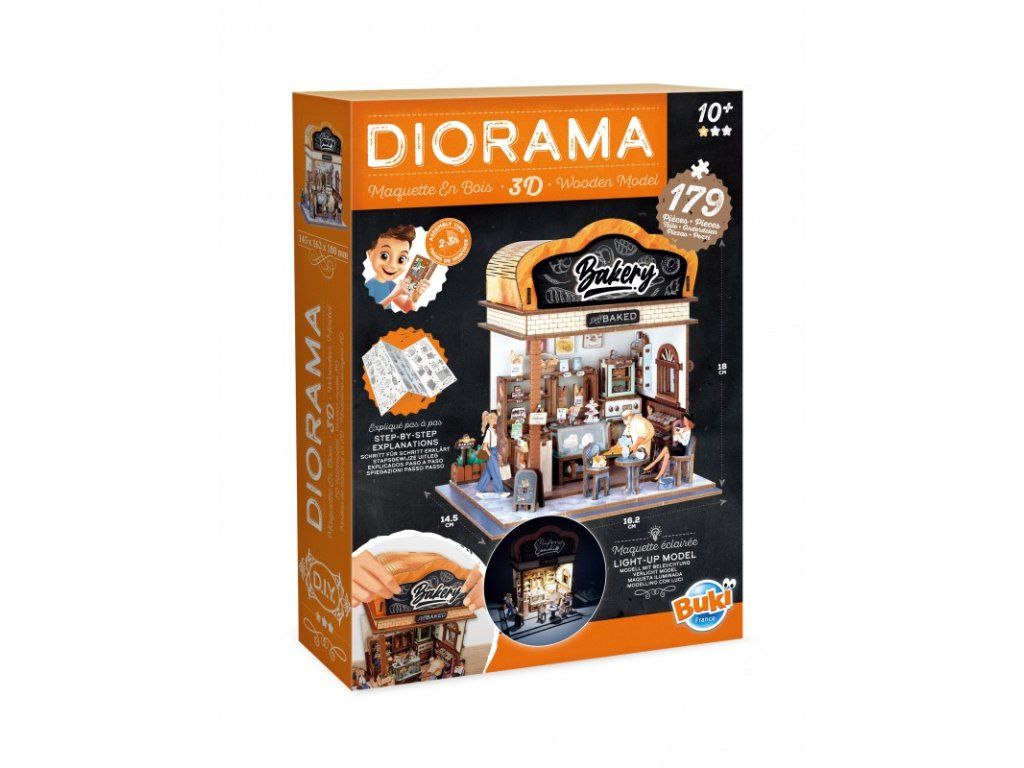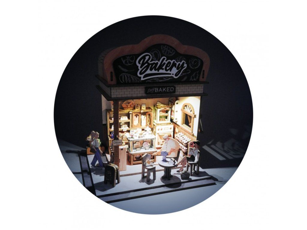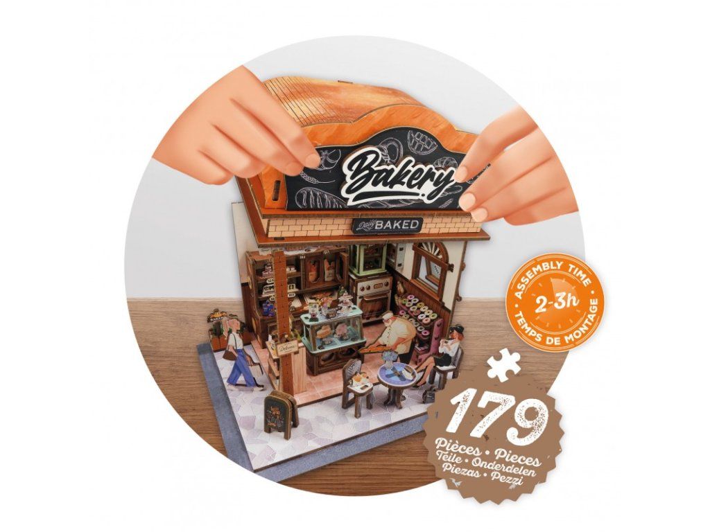 Zostavte drevené diely a postavte si vlastnú miniatúrnu pekáreň. Vytvorte si príjemnú a teplú atmosféru pomocou detailne spracovaných prvkov – lepte, strihajte a umiestňujte nábytok, doplnky, chutné pochúťky aj zákazníkov presne podľa vašich predstáv. Vďaka očíslovaným dielom a prehľadnému návodu je skladanie jednoduché a zábavné.