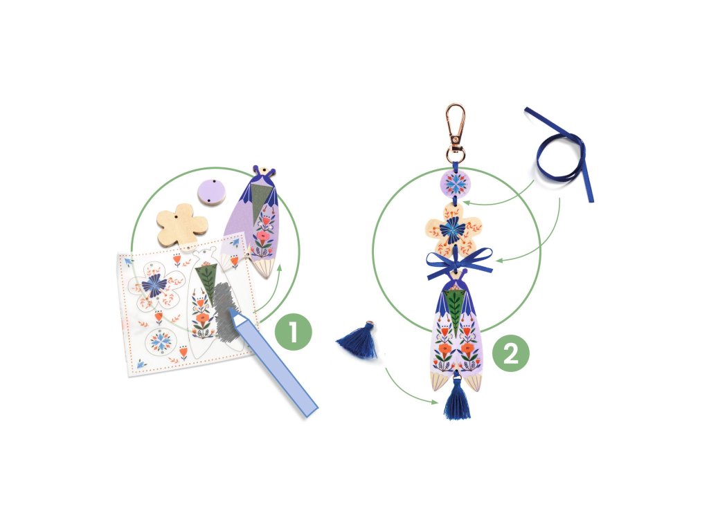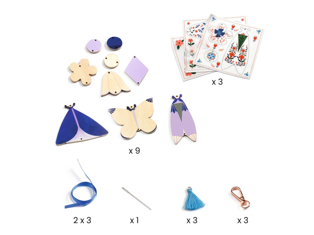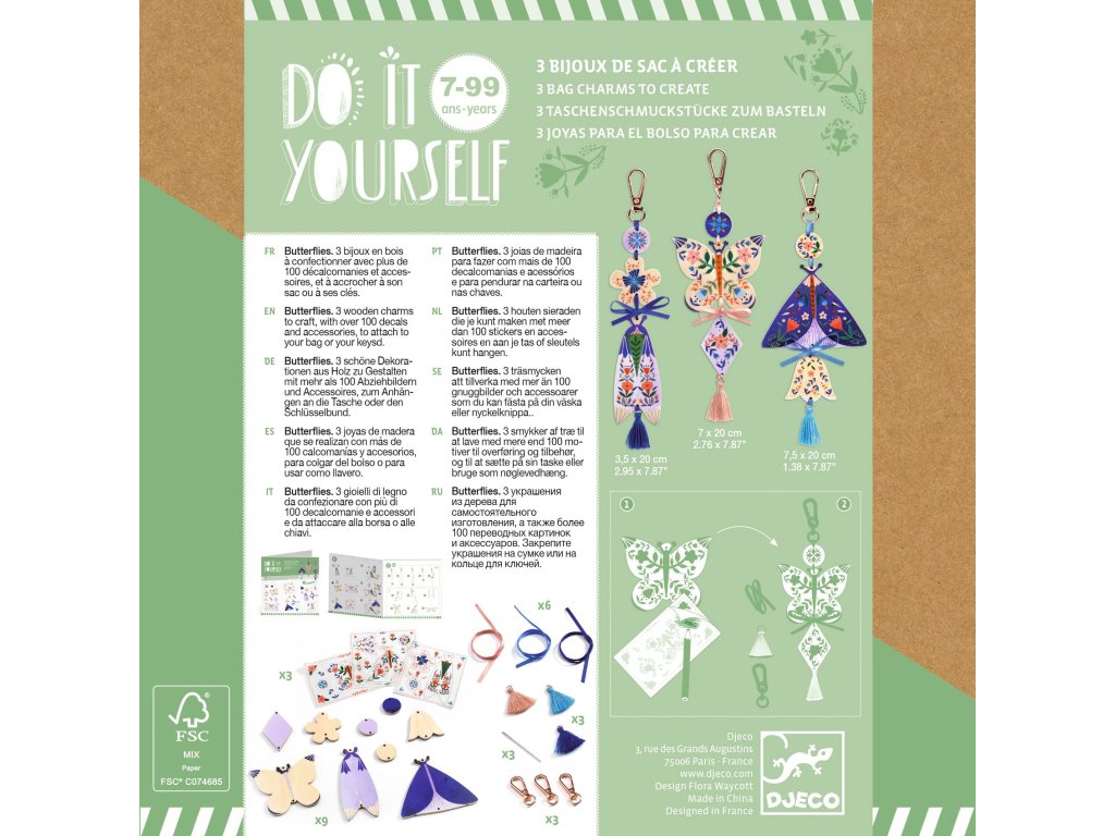 DIY – Vytvor si sám: 3 Motýlie prívesky na taškuMagická sada na tvorenie pre deti, ktoré milujú farby, lesk a originálne doplnkyS kreatívnou sadou DIY Motýlie prívesky na tašku od značky Djeco si deti vytvoria až 3 jedinečné prívesky, ktoré môžu nosiť na školskej taške či ako malé osobné talizmany a kľúčenky. Každý prívesok má svoj vlastný dizajn a postup tvorenia, vďaka čomu vznikajú tri úplne odlišné, farebné a efektné motýlie doplnky. Sada je navrhnutá tak, aby deti postupovali podľa obrázkového návodu, no zároveň mali priestor pre vlastnú fantáziu – volia farby, kombinujú vrstvy, lepidlá a dekorácie tak, aby výsledný prívesok bol presne podľa ich štýlu. Výsledkom sú pevné a krásne lesklé prívesky, ktoré deti môžu nosiť každý deň. Každý prívesok sa upevňuje na kovovú karabínku, aby sa dal ihneď pripnúť na tašku či batoh.Čo deti rozvíjajú pri tvorení:jemnú motoriku (lepenie, vrstvenie dielikov)trpezlivosť a zameranie na detailvizuálne vnímanie farieb a kompozíciekreativitu a vlastný štýlPrečo si vybrať kreatívnu sadu Motýlie prívesky od Djeco:deti si vytvoria 3 reálne použiteľné doplnkyideálny darček pre deti od 7 rokovvýborné na tvorivé popoludnie, oslavy či spoločné tvoreniekvalitné materiály a ilustrácie typické pre Djecojasný obrázkový návodmotivuje k estetickému cíteniu a samostatnej tvorbeObsah balenia:9 základných drevených dielikov motýľov3 hárky ilustrovaných dielov na vrstvenie3 kovové krúžky / karabínky na upevnenie6 stužiekihla3 strapceobrázkový návod krok za krokomDodatočné parametre