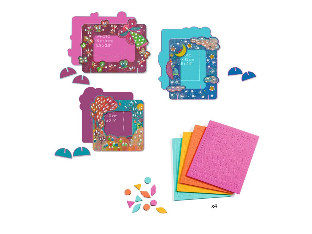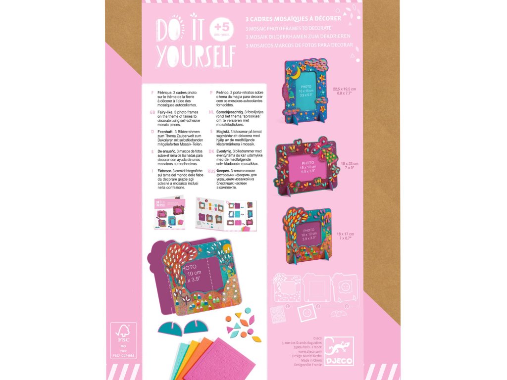 DIY – Vytvor si sám: Fotorámiky z mozaiky – VílyKreatívna DIY sada s fotorámikmi pre tvorivé detiS touto originálnou kreatívnou sadou od Djeco si deti môžu vytvoriť až 3 vlastné mozaikové foto rámiky s krásnym vílím motívom, do ktorých si vložia svoje obľúbené fotografie. Sada kombinuje tvorivé lepenie, skladanie a dekorovanie pomocou farebných a trblietavých mozaikových samolepiek, takže výsledné rámiky sú nielen krásne, ale aj osobné. Rámiky sú navrhnuté tak, aby deti postupovali podľa obrázkového návodu a zároveň mali priestor pre vlastnú fantáziu pri farebnom zdobení. Hotové rámiky stoja samostatne vďaka zadným podporkám.Sada obsahuje:3 kartónové foto rámiky v rôznych veľkostiachzadné kryty + podporky pre stabilné postavenie rámikov4 hárky samolepiacich mozaikových dielikovobrázkový návod krok za krokomDeti ozdobia každý rámik lepením mozaikových dielikov podľa návrhu alebo vlastnej fantázie. Po dokončení vložia fotografiu a rámik postavia pomocou podporky. Hotové dielka sú krásne ako dekorácia, spomienka alebo darček pre rodičov či kamarátov.Prečo si vybrať túto kreatívnu sadu:obsahuje 3 rámiky s rôznymi rozmermi na rôzne fotkyskvelá aktivita pre deti od 5 rokovzábavné kombinovanie farieb, tvarov a leskuvýsledné rámiky sa dajú použiť aj ako darčekkvalitné ilustrácie a materiály typické pre Djecorozvíja tvorivé schopnosti pri hravom procese tvorbyDodatočné parametre