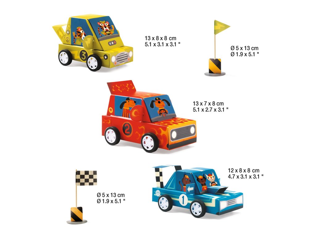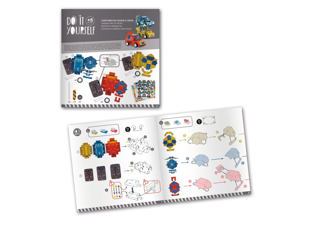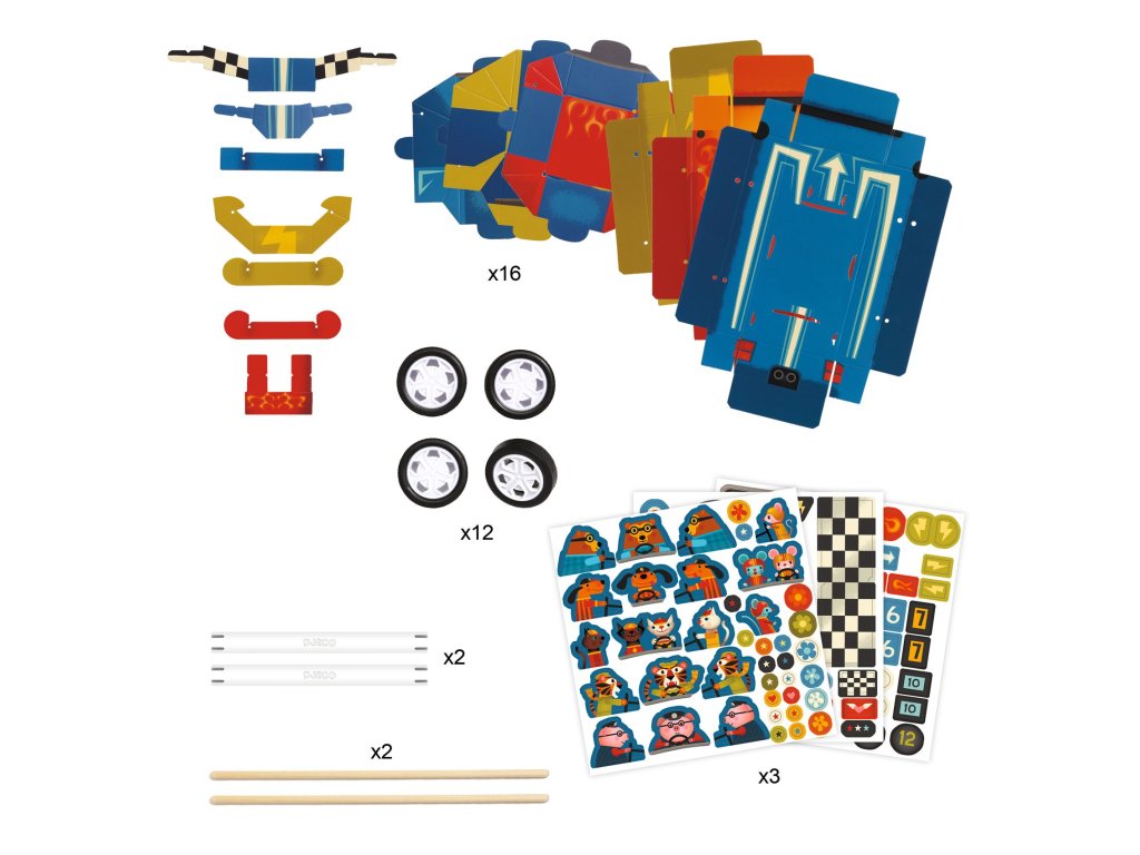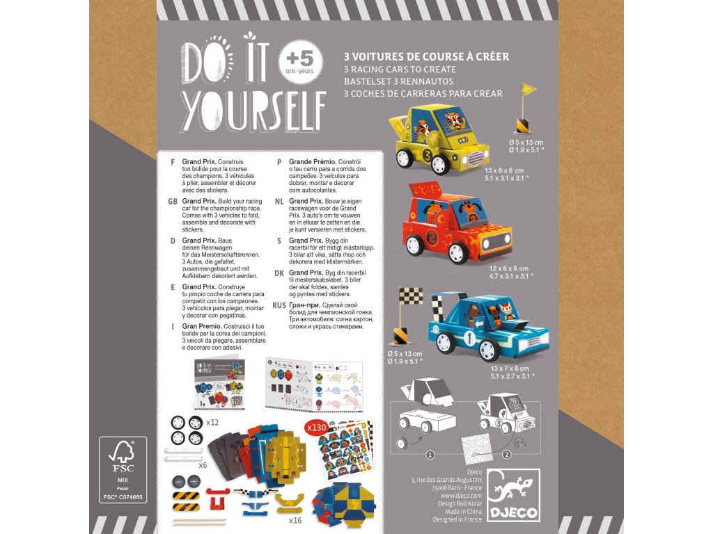 DIY – Vytvor si sám: Grand Prix – 3 pretekárske autáKreatívna DIY sada pre malých pretekárov a konštruktérovS kreatívnou sadou DIY – Grand Prix 3 pretekárske autá od Djeco si deti môžu vytvoriť až 3 papierové pretekárske autá, ktoré si samy poskladajú, dotvoria samolepkami a pripravia na hru. Táto sada kombinuje tvorivé lepenie, skladanie aj dizajnovanie – deti si najskôr zostavia karosérie, potom ich ozdobia podľa vlastnej fantázie a nakoniec nasadia kolesá na osky. Hotové autá sa dajú používať ako funkčné hračky.Čo všetko obsahuje sada a čo si deti vytvoria:Sada obsahuje všetko potrebné pre tvorbu 3 pretekárskych áut:4 ilustrované hárky s vyrezanými dielmi karosérií12 kolies a 6 osiek pre funkčné otáčanie kolies2 bambusové paličky3 hárky samolepiekobrázkový návod krok za krokomPoskladané autá sa dajú ihneď používať pri hre alebo poslúžia ako dekorácie.Prečo si vybrať túto kreatívnu sadu:kompletná DIY sada pre 3 originálne pretekárske autáspojenie tvorivej aktivity s hroujednoduchý obrázkový návodvhodné pre deti od 5 rokovkvalitný materiál s certifikátom FSC® (ekologicky šetrný papier)Dodatočné parametre