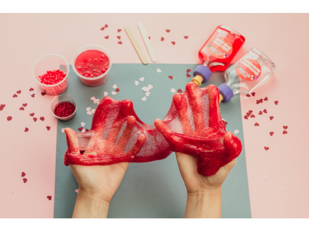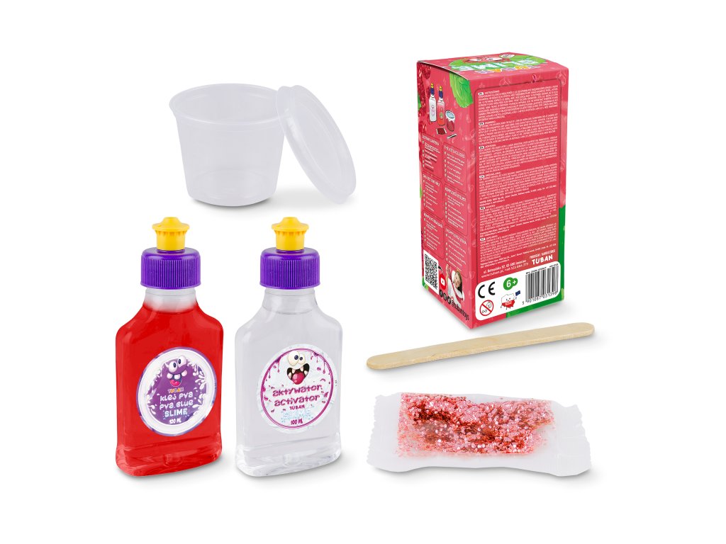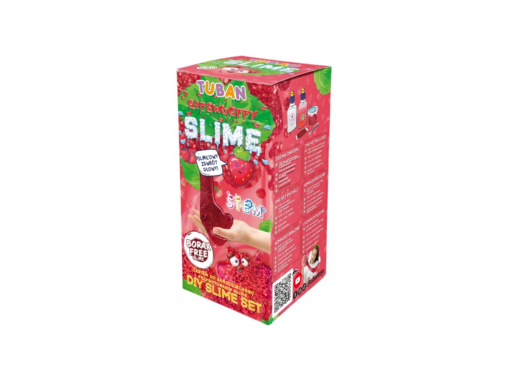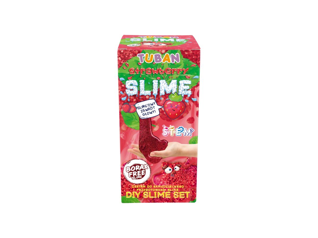 DIY Slime Sada na výrobu slizu Jahoda Vyrobte si svoj vlastný sliz s vôňou jahody Skvelá aktivita pre deti, ktoré radi experimentujú. V tejto sade nájdete všetko, čo na výrobu kvalitného slizu potrebujete. Vďaka jahodovej aróme a krásnej farbe zaujme sliz všetky vaše zmysly. Hra so slizom je ideálna na rozvoj jemnej motoriky, zmyslového vnímania a podporuje u detí kreativitu.Sada obsahuje:100 ml PVA lepidla s jahodovou arómou,100 ml aktivátora,1 g červených minerálnych trblietok,špachtľu,nádobu.Zábavný, edukačný, aj relaxačný Pre deti môže byť manipulácia so slizom upokojujúca a relaxačná. Je to skvelý spôsob, ako si oddýchnuť a znížiť stres po náročnom dni. Objavte všetky DIY slizy a hotové Jiggly slimes rôznych farieb a vôní.Sliz je vyrobený z bezpečných a netoxických materiálov, ktoré sú šetrné k životnému prostrediu, neobsahujú borax. Po hre odporúčame sliz uložiť do priloženej nádobky a dobre uzavrieť.Senzorická hra umožňuje deťom objavovať svet okolo seba prostredníctvom zmyslov Hranie s rôznymi textúrami, farbami a vôňami nielenže stimuluje ich zmyslové vnímanie, ale taktiež podporuje ich kognitívny vývoj, jemnú motoriku a emocionálnu inteligenciu. S produktmi značky Tuban môžu deti preskúmavať rôzne senzorické podnety a objavovať nové spôsoby učenia a zábavy.Dodatočné parametre