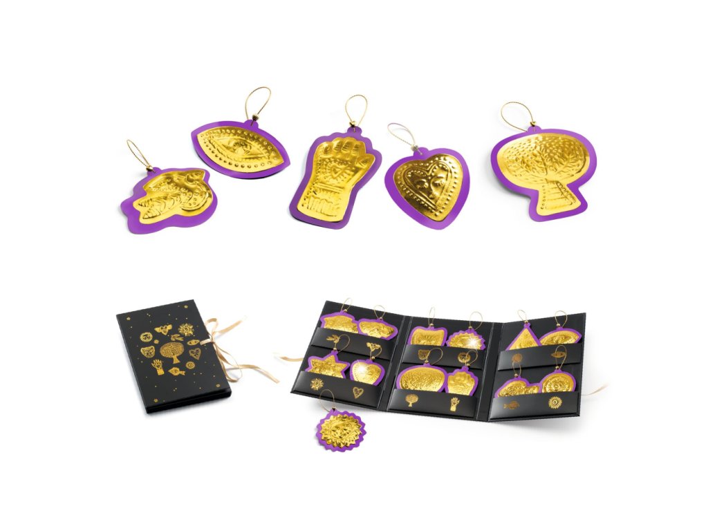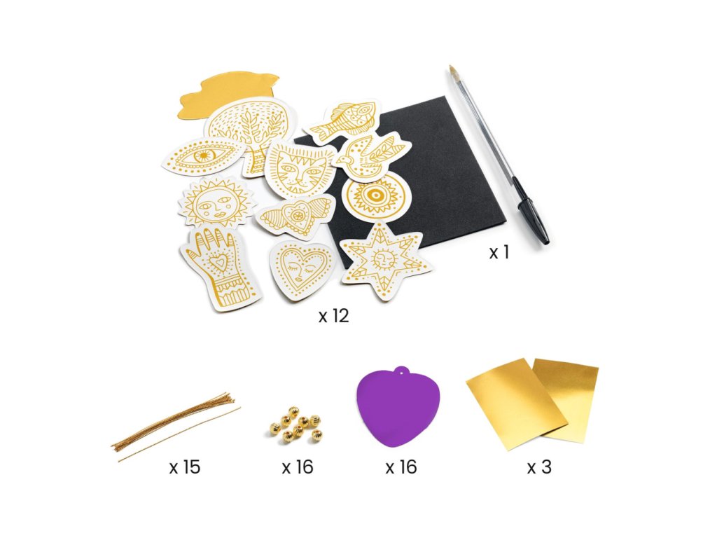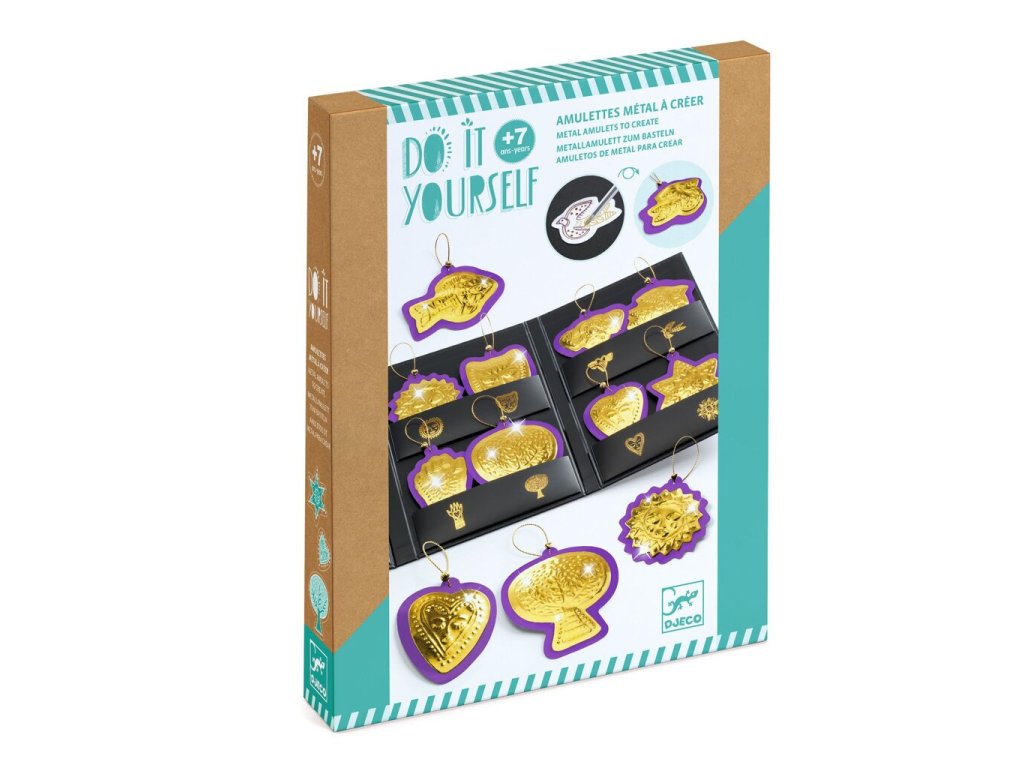 DIY Vyrob si sám Amulety Kreatívna sada na zhotovenie 12 kovových amuletov. Dieťa perom obtiahne motívy na rubovej strane zlatých kovových samolepiek, čím ich do kovu “vyryje”. Vyrýva na penovej podložke. Samolepky potom nalepí na fialové siluetové papieriky, cez ktoré prevlečie zlatú šnúrku a korálku, aby si mohlo amulety zavesiť. Sada obsahuje aj album na prehľadné uschovanie všetkých amuletov. Tvorbou prevedie obrázkový návod. 3 bonusové kovové samolepky, papieriky, šnúrky a korálky umožňujú dieťaťu navrhnúť si vlastné motívy amuletov.Na výrobu sady bol použitý papier a lepenka s ekologickým certifikátom FSC®.Kolekcia Vytvor si sám (DIY) má blízko k úžitkovému umeniu a umožňuje deťom zhotoviť umelecké výrobky, ktoré si môžu nielen hrdo vystaviť, ale ich aj používať.Obsah: 12 kovových samolepiek s motívmi na amulety, 3 kovové samolepky na vytvorenie vlastného dizajnu, 15 siluetových papierikov, 15 šnúrok, 15 korálok, 1 pero, 1 penová podložka, 1 album, obrázkový návod.Rozmery albumu: 48,5 x 21 cm.Dodatočné parametre