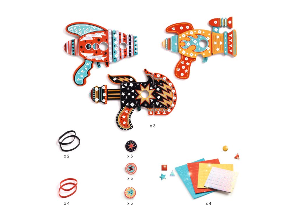 DIY Vyrob si sám Gumipušky Vyrobte si gumipušky na zábavu! Kreatívna sada z kolekcie DIY (Vytvor si sám) obsahuje 3 gumipušky na ozdobenie mozaikovými dielikmi. Hor sa ovládnuť vesmír, ale štýlovo! Gumipušky z pevnej lepenky nestrieľajú kamienky, ale žetóny. Dieťa ozdobí gumipušky samolepiacimi penovými mozaikovými dielikmi. Dieliky majú metalický lesk. To bude paráda!Sada je vyrobená z papiera a lepenky s ekologickým certifikátom FSC®. Kolekcia DIY (Vytvor si sám) má blízko k úžitkovému umeniu a umožňuje deťom zhotoviť umelecké výrobky, ktoré si môžu nielen hrdo vystaviť, ale ich aj používať.Obsah: 3 žetónové gumipušky z hrubej lepenky, 15 žetónov, 6 gumičiek, 4 hárky samolepiacich penových mozaikových dielikov, 1 obrázkový návodRozmery: 22 x 18 cmDodatočné parametre