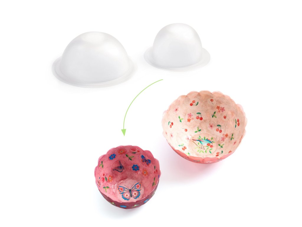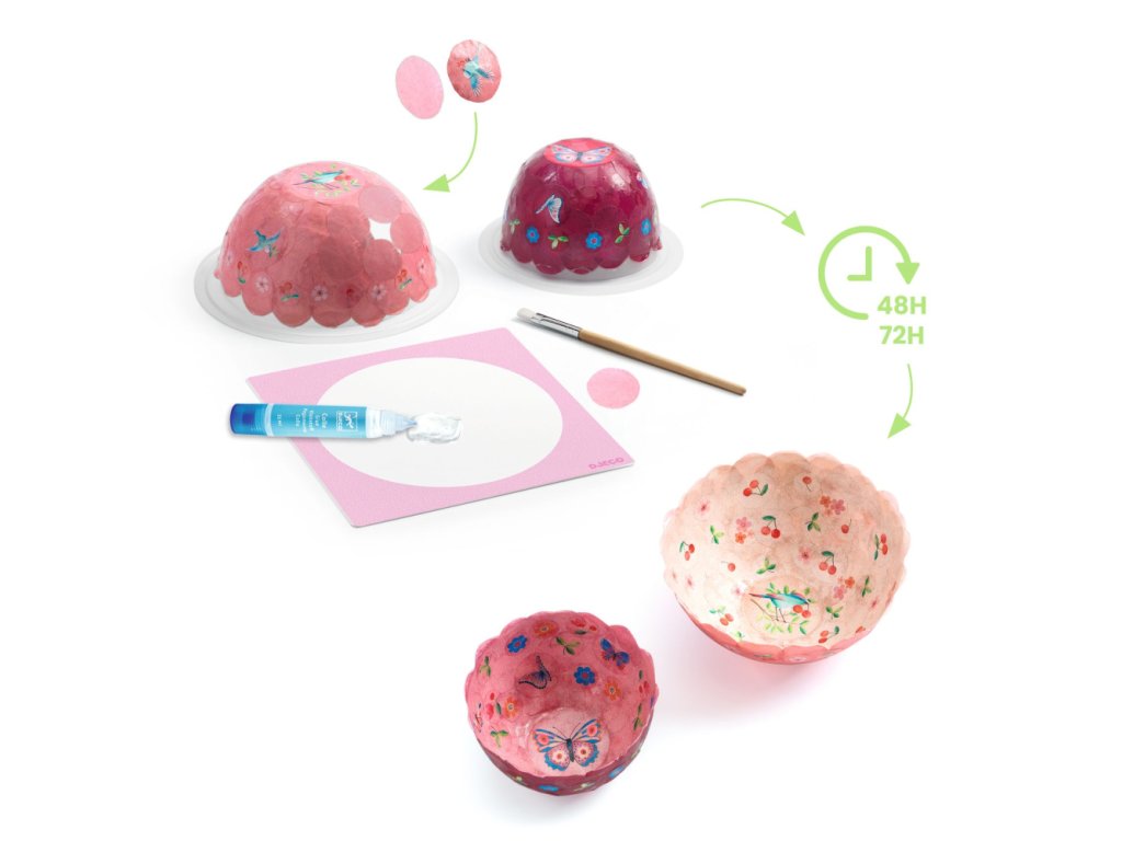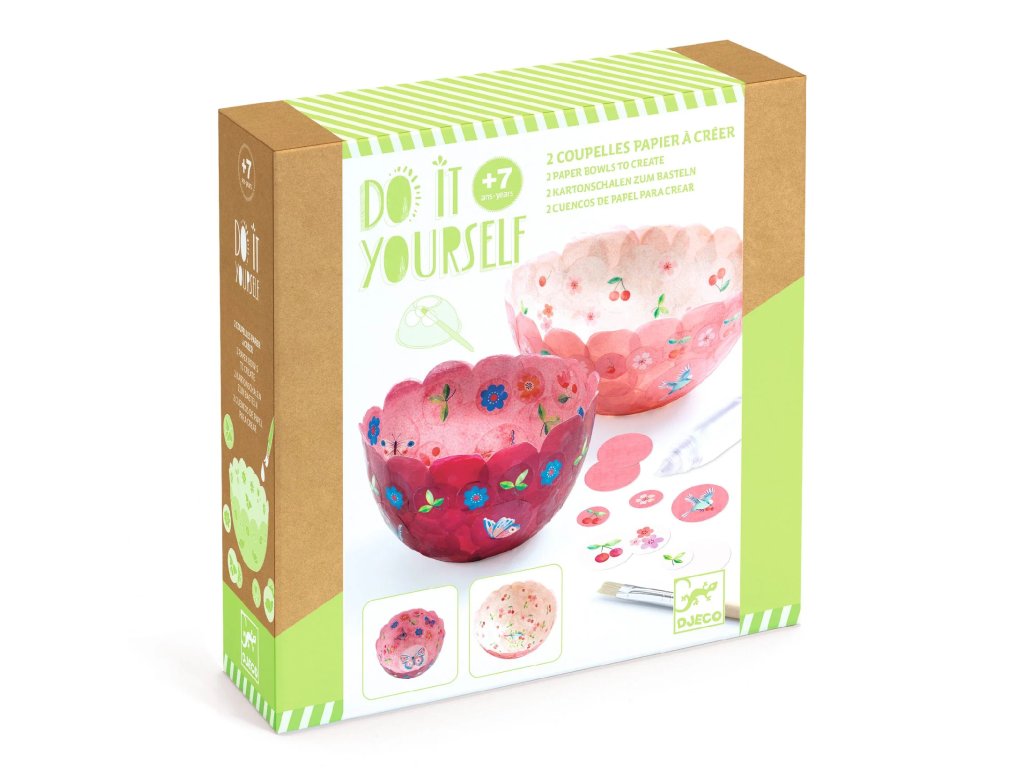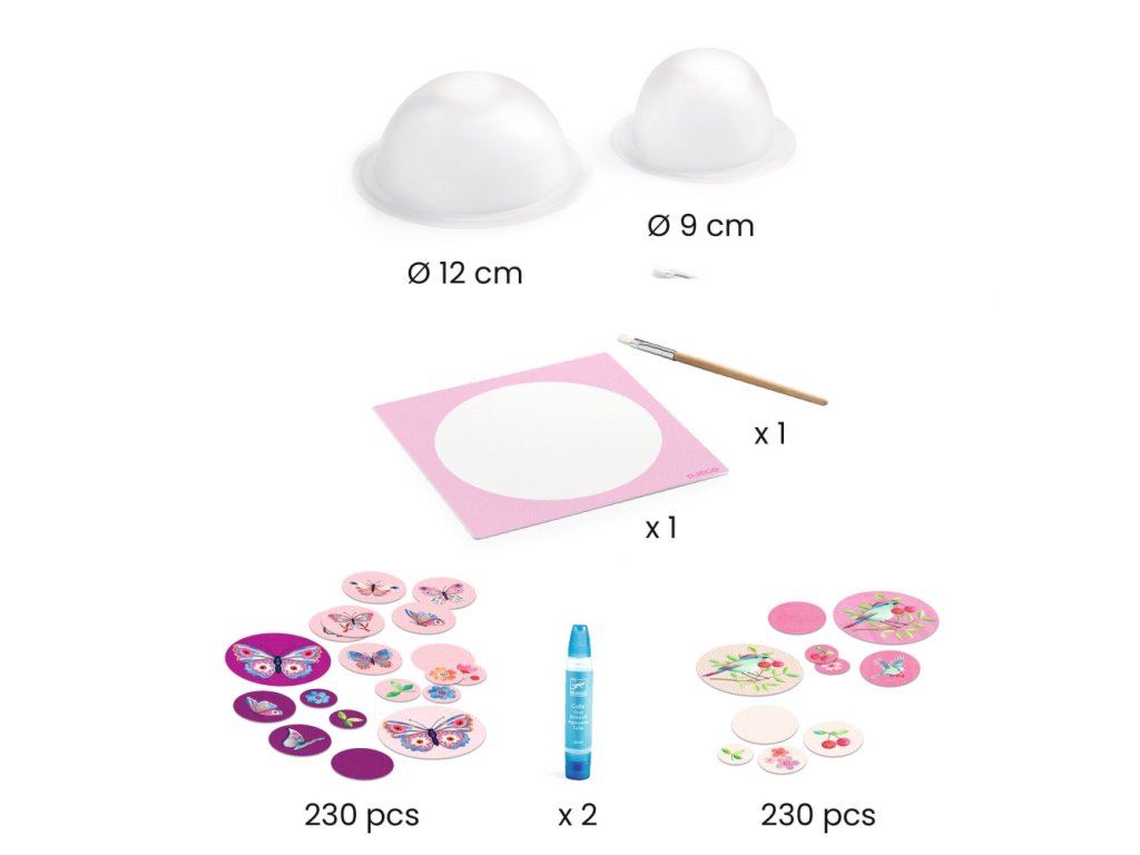 Kreatívna sada na zhotovenie 2 papierových misiek, menšej a väčšej. Dieťa nalepí farebné aj ilustrované papierové medailóniky na formy a nechá ich zaschnúť. Priesvitné lepidlo si môže vytlačiť na plastovú paletku a natierať ho štetcom. Miskové formy sú priehľadné, vďaka čomu má dieťa stále prehľad, ako misky vyzerajú (dôležité najmä pri aplikácii ilustrovaných medailónikov). Po zaschnutí lepidla (aspoň 48 hodín) sa môžu misky odobrať z foriem.Dizajn: Marie Desbons.Kolekcia DIY - Vytvor si sám má blízko k úžitkovému umeniu a umožňuje deťom zhotoviť umelecké výrobky, ktoré si môžu nielen hrdo vystaviť, ale ich aj používať.Obsah: 2 priehľadné misky (o 9 x 5.5 cm / o 12 x 6 cm), 2 tuby priesvitného lepidla, 1 plastová paletka, 1 štetec, 4 vrecká farebných aj ilustrovaných papierových medailónikov, 1 obrázkový návod.Rozmery misiek: 9 (priemer) a 12 (priemer) cm.Dodatočné parametre