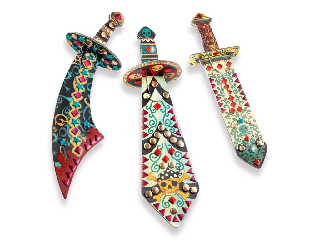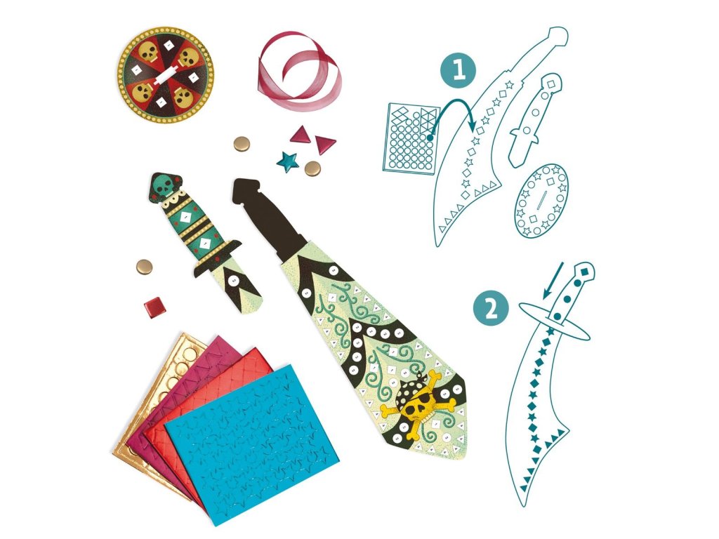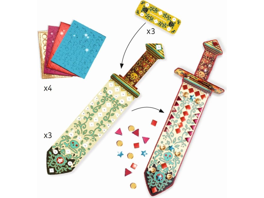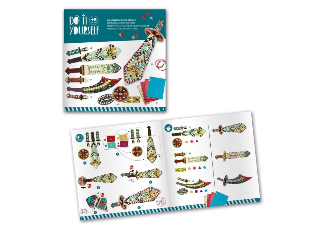 DIY Vyrob si sám Pirátske mečeStaň sa pravým pirátom! Vyrob si vlastné trblietavé mečeS touto kreatívnou sadou sa každý malý pirát môže stať majiteľom troch jedinečných mečov – dvoch rovnakých a jedného zakriveného. Meče sú vyrobené z pevného kartónu, predkreslené a ilustrované, s bielymi plôškami, ktoré čakajú na samolepiace mozaikové dieliky. Týmto spôsobom si každý meč deti ozdobia podľa vlastnej fantázie a vytvoria z neho skutočný poklad pirátskeho kapitána.Najprv si deti poskladajú meče: čepeľ a rukoväť tvoriace jeden kus sa spájajú priečkou, ktorá slúži ako ochrana ruky. Potom prichádza na rad zábava – nalepovanie mozaikových dielikov s metalickým leskom, ktoré dodajú mečom realistický vzhľad a trblietavý efekt, akoby boli z drahého kovu. Hotové meče majú dĺžku 37 cm, takže sú bezpečné na hranie, ale zároveň pôsobia ako ozajstné pirátske zbrane – ideálne na dobrodružné hry, tematické oslavy alebo divoké pirátske bitky doma či v záhrade. Sada je výnimočná nielen pre zábavu, ale aj pre rozvoj jemnej motoriky, koordinácie oko–ruka a koncentrácie. Deti sa naučia trpezlivosti a precíznosti pri skladaní a zdobení mečov a zároveň si vytvoria unikátne, vlastnoručne vyrobené doplnky, ktoré sa stanú súčasťou ich dobrodružného sveta.Obsah sady: 3 x čepeľ a rukoväť z pevného kartónu (2 rovné, 1 zakrivený) 3 x priečka slúžiaca ako ochrana ruky 4 hárky samolepiacich mozaikových dielikov s metalickým leskomS touto sadou deti zažijú hodiny kreatívnej zábavy, naučia sa trpezlivosti, jemnej motorike a predstavivosti a navyše získajú trojicu jedinečných pirátskych mečov, s ktorými môžu prežiť svoje vlastné dobrodružstvá. Každý meč je unikátny, plný farieb a metalického lesku, a zaručene sa stane obľúbeným doplnkom každej malej pirátskej posádky.Dodatočné parametre