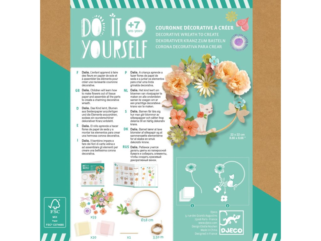DIY Vytvor si sám Kvetinový veniec DaliaDekorácia, ktorá rozžiari každý interiérObjavte čaro vlastnoručne vyrobenej dekorácie s touto nádhernou kreatívnou sadou na výrobu kvetinového venca Dalia. Je ako stvorená pre všetkých milovníkov tvorenia, nežných detailov a prírodného štýlu. Vďaka premyslenému obsahu si doma jednoducho vytvoríte elegantný veniec, ktorý sa stane jemným doplnkom vášho interiéru – či už ho zavesíte na dvere, stenu alebo položíte na poličku ako dizajnový akcent. V sade nájdete všetko, čo potrebujete: bambusový krúžok, kvalitný hodvábny papier v harmonických farbách, preddierované ilustrované šablóny kvetov a prírodnú rafiovú šnúru. Kombináciou týchto materiálov a jednoduchého postupu si krok za krokom vytvoríte jemné kvety, ktorých vrstvenie zabezpečí nádherný 3D efekt. Celý proces je zároveň relaxačný a intuitívny – ideálny pre začiatočníkov, ale aj pre tých, ktorí chcú rozvíjať svoje tvorivé zručnosti.Súčasťou balenia sú aj prehľadné pokyny doplnené kreatívnymi tipmi, ktoré vám ukážu, ako správne tvarovať papier, kombinovať farby a aranžovať kvety tak, aby váš výsledný veniec pôsobil profesionálne a harmonicky. Veľkým plusom tejto sady je aj jej ekologický charakter – bambusová konštrukcia, prírodné vlákna a kvalitné materiály šetrné k životnému prostrediu robia z venca nielen krásnu, ale aj zodpovednú dekoráciu. Hotový veniec Dalia bude pôsobiť moderne, jemne a prirodzene. Je dokonalý ako celoročná ozdoba, ale aj ako originálny handmade darček pre niekoho, kto ocení krásu ručnej práce.Dodatočné parametre