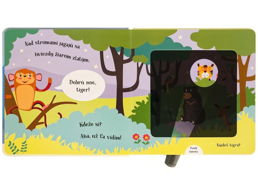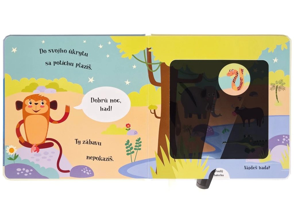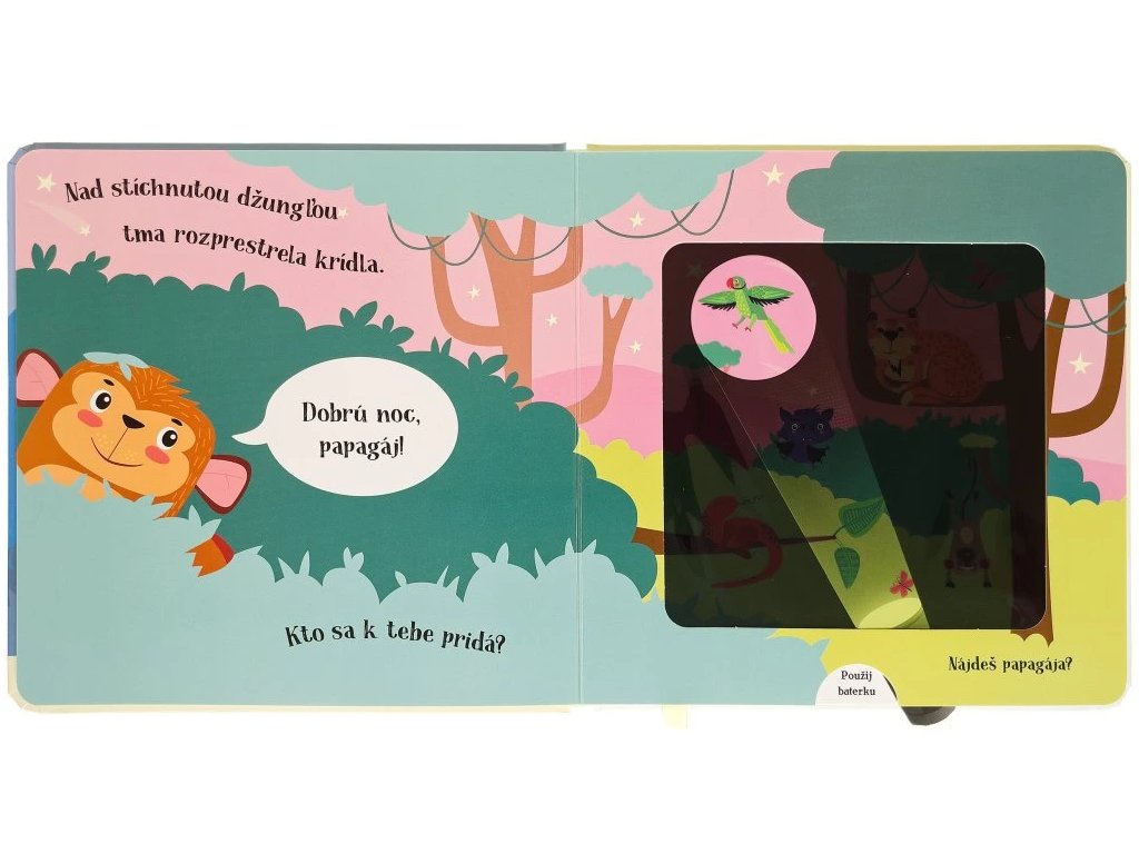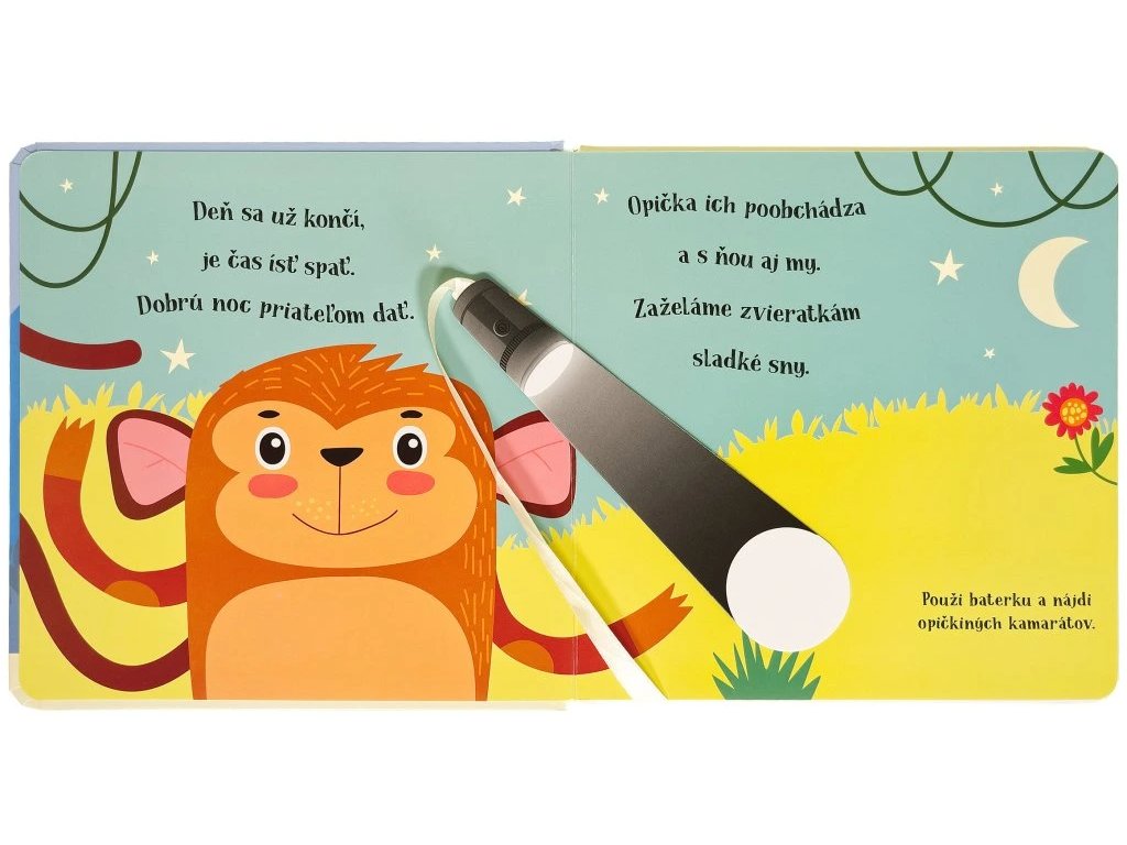 Dobrú noc, opička! Kúzelné čítanie na dobrú noc pre deti Malá opička už sa chystá spať, ale najprv musí dať dobrú noc všetkým svojim zvieracím kamarátom. Pomôžeš jej nájsť ich?Kniha s kúzelnou baterkou Pomôž opičke pomocou kúzelnej baterky nájsť všetkých jej zvieracích kamarátov, ukrytých v knižke. Čítanie vo veršoch, ideálne do postieľok. Vsuň kúzelnú baterku medzi stránky a zisti, kto sa ukrýva v každej ilustrácii zobrazujúcej noc. Text vo veršoch učí deti vnímať prirodzený rytmus reči. Šikovne vyrobené okienka umožňujú deťom hľadať schované zvieratká pomocou priloženej kartónovej pomôcky v tvare svietidla. Ponúknite dieťaťu pred spaním nejakú upokojujúcu aktivitu. Táto knižka je na to priam stvorená.Dodatočné parametre