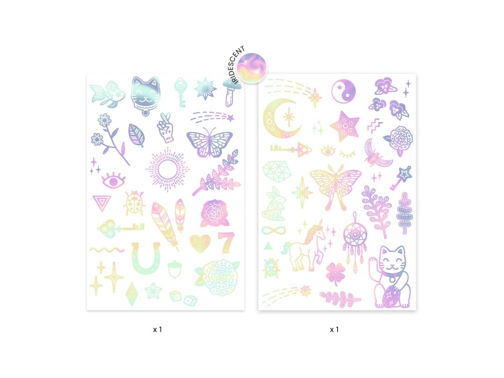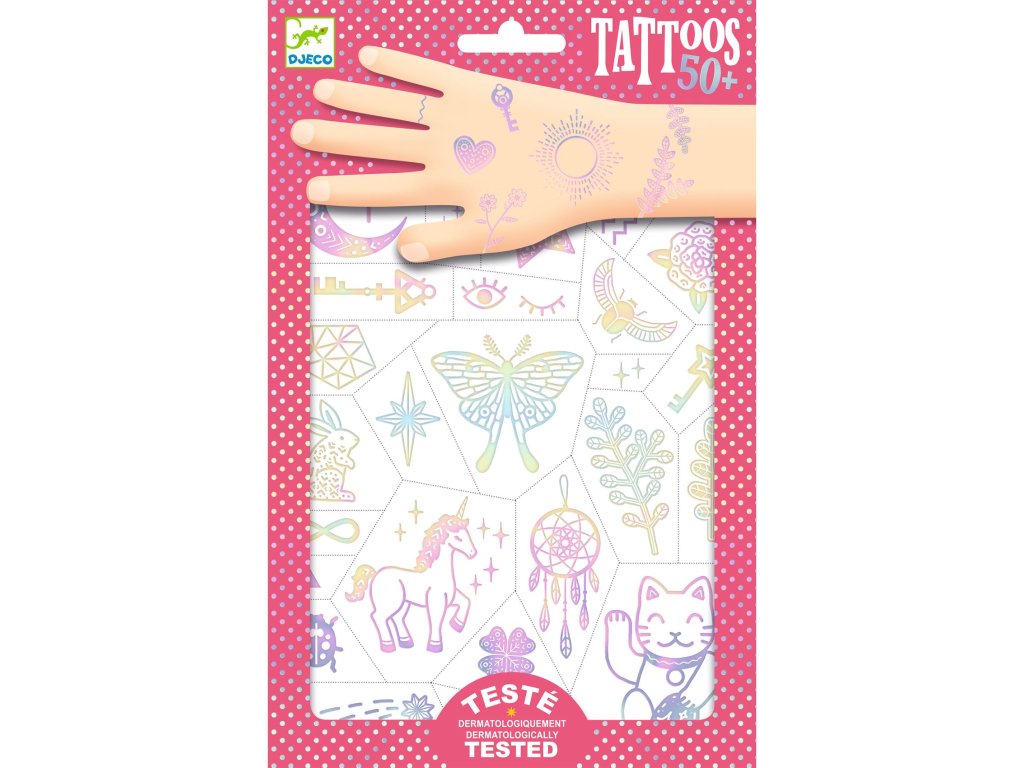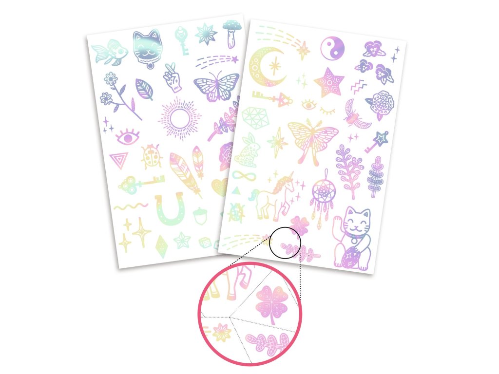 Dočasné tetovačky Amulety Malé amulety na kožu: trblietavé dočasné tetovačky, ktoré zvládneš nalepiť za minútkuDočasné tetovačky Amulety sú jemné detské tetovačky s irizujúcim (trblietavým) efektom. Motívy sú predseknuté, takže si dieťa vyberie obrázok, odstrihne ho, priloží na kožu, navlhčí a po chvíľke je hotovo. Tetovačky sú dermatologicky testované a výborne sa hodia na oslavy, prázdniny aj „len tak“ pre radosť.Rýchly prehľad odporúčaný vek: od 3 rokov čo deti získajú: 2 hárky tetovačiek + návod výhoda: irizujúci lesk, predseknuté motívyAko sa používajú Vystrihni vybraný motív a odstráň ochrannú fóliu. Prilož tetovačku na kožu (obrázkom nadol). Navlhči papierik a jemne pritlač. Po pár sekundách papier zlož – hotovo!Obsah balenia 2× hárok dočasných tetovačiek 1× návodTechnické parametre vek: od 3 rokov typ: dočasné tetovačky (aplikácia vodou) bezpečnosť: dermatologicky testovanéDodatočné parametre