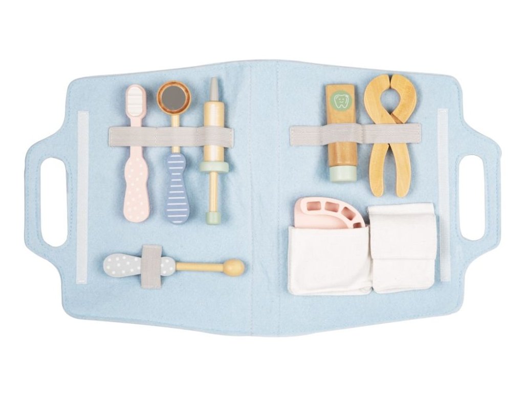 Značka eliNeli prináša do detského sveta moderný dizajn v spojení s moderným európskym štýlom inšpirovaným nemeckou kvalitou a dizajnom. Prioritou pri výrobe sú prírodné materiály, prírodné drevo, čím podporuje udržateľnosť a bezpečnosť hračiek. Nové výrobky prechádzajú prísnymi bezpečnostnými testami TÜV Rheinland, čo zaisťuje bezpečnú hru deťom a pokoj rodičom. S eliNeli sa deti učia, tvoria a rastú v bezpečnom a podnetnom prostredí, ktoré nielen spĺňa, ale prekonáva ich očakávania. Doktorský kufrík (brašna) Zubár v sebe skrýva sadu drevených potrieb pre malých zubárov. V praktickej a jednoducho prenosnej brašne deti nájdu ďasná s bielymi zúbkami, ale aj s pár zúbkov, ktoré navštívil červík. Je načase vžiť sa do role naozajstného zubára a zúbky vyliečiť. Najskôr je potreba zúbky poriadne prezrieť pomocou zrkadla, nasledovať bude injekcia, ktorá ďasná znecitliví a teraz sa vaše dieťatko môže pustiť do vŕtania a trhania pokazených zubov. Drevená hračka skvele poslúži aj rodičom na názornú ukážku, ako sa správne stará o zúbky, ako si zúbky správne čistiť a na ukážku, ako to dopadá, keď sa zúbky nečistia alebo čistia nesprávne. Drevená hračka sada pre zubárov navyše zbaví deti obáv z návštev vlastného zubára. Môžu sa na preventívnu prehliadku zahrať vo svojej izbičke a ďalšia návšteva potom bude jednou zo zábavných hier. Prečo vybrať túto doktorskú sadu pre deti: Prírodný materiál - eliNeli kladie dôraz na výrobu z dreva a prírodných materiálov, čím zaisťuje ekologickú šetrnosť a bezpečnosť hračiek. Zubár - doktorský kufrík s potrebami pre malých zubárov. Neutrálne farby - vďaka kombinácii prírodného dreva a neutrálnym farbám je sada Zubár krásnym darčekom pre dievčatká aj chlapcov. Zábavná hra - s lekárskym kufríkom pre zubárov sa deti môžu zahrať na naozajstných zubárov. Pomocou zrkadla môžu prezrieť zúbky zo všetkých strán, ošetriť boľavé ďasná, pokazené zúbky vyvŕtať alebo rovno vytrhnúť. Učebná pomôcka - pomocou drevenej sady Zubár môžete deťom názorne predviesť, ako sa správne čistia zúbky a ako to dopadá, keď sa ústna hygiena zanedbá. Návšteva zubára bez obáv - s detským setom pre zubárov sa deti môžu vžiť do role svojho zubára alebo zubárky a vyskúšať si ich prácu na vlastnej koži. Pri ďalšej návšteve zubára si deti spomenú na zábavnú domácu hru. Nácvik návštevy zubára - s pomocou sady pre zubárov môžete vášmu dieťatku názorne predviesť, čo ho bude čakať pri návšteve zubára. Deti tak budú na preventívne vyšetrenie aj ošetrenie zúbkov pripravené a nebudú mať z návštevy zubára strach. Vysoké bezpečnostné štandardy - hračka prešla prísnymi nemeckými bezpečnostnými testami TÜV Rheinland, čo zaručuje maximálnu bezpečnosť pre vaše deti. Hračka bezpečná pre deti - vyrobená z prírodných materiálov, natretá bezpečnými, netoxickými, vodou riediteľnými farbami. Technické parametre: Rozmer: 23 x 5 x 28,7 cm. Rozmer balenia: 23 x 5 28,7 cm. Hmotnosť: cca 450 g. Materiál: Jalovcové drevo, bukové drevo, MDF, látka. Certifikáty a normy: CE, 2009/48/ES, TÜV Rheinland, EN 71-1, 2 a 3. Odporúčaný vek: od 3 rokov, 36m+. Viac o produktoch eliNeli nájdete na: https://www.elineli.eu/sk/. Často kladené otázky: Je hračka bezpečná pre deti? Doktorská sada Zubár eliNeli je testovaná, vhodná a bezpečná pre deti a vydrží vašim deťom dlho. Hračka prešla prísnymi bezpečnostnými testami TÜV Rheinland. Spĺňa požiadavky smernice o bezpečnosti hračiek 2009/48/ES a normy o nezávadnosti a bezpečnosti hračiek EN 71-1, 2, 3, kedy sa testujú mechanické a fyzikálne vlastnosti, horľavosť aj migrácia určitých látok. Lekársky kufrík Zubár otestoval a Certifikát o zhode (Osvedčenie o zhode - CE) udelil technický a skúšobný ústav. So sadou pre malých zubárov od eliNeli máte istotu, že je pre vaše deti vhodná a bezpečná, je testovaná, na náter sú použité netoxické, zdravotne nezávadné laky a farby.Dodatočné parametre