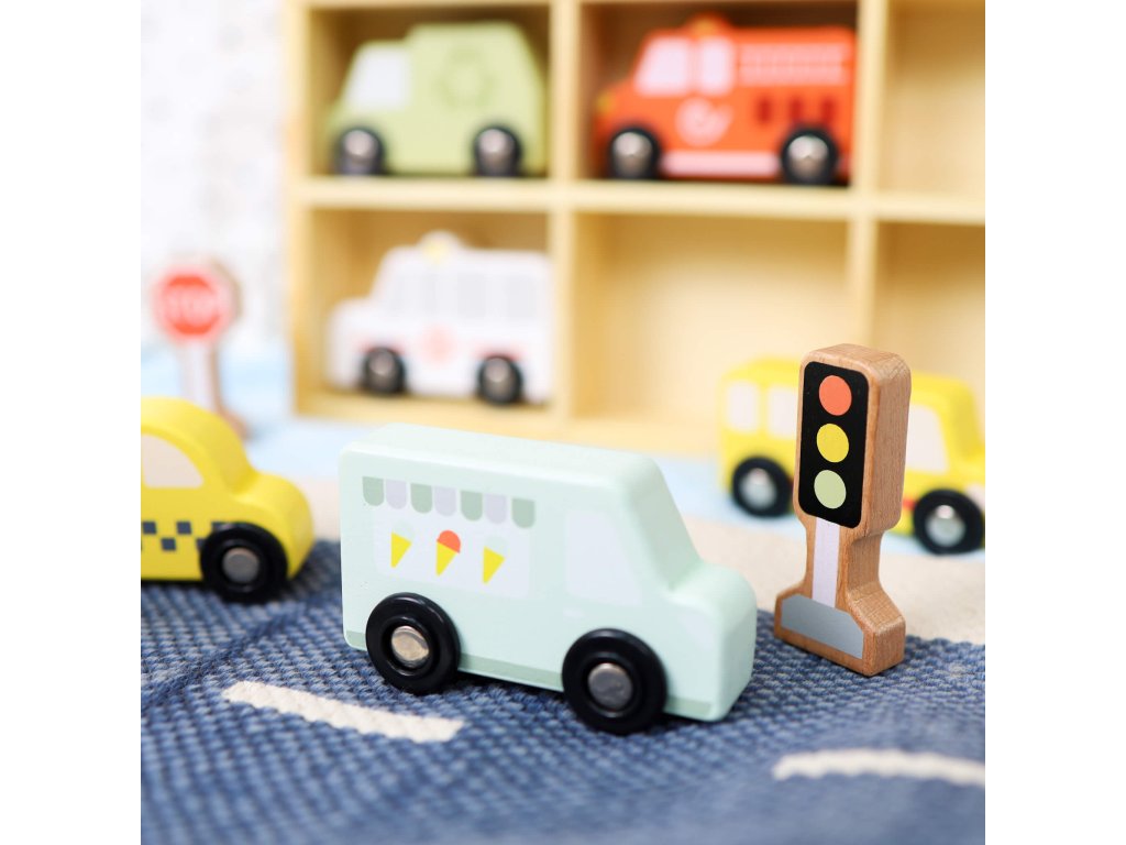 Dopravné prostriedky a značky Pastel 12 ks Sada pre milovníkov autíčok Drevená sada na hranie s dopravnými prostriedkami a dopravným značením od Tooky Toy deti zamestná na celé hodiny. Obsahuje 8 vozidiel (auto, taxi, sanitku, hasičské auto, smetiarske auto, školský autobus, zmrzlinárske auto a policajné auto), 3 dopravné značky a 1 vitrínku na hranie a vystavenie autíčok. Vozidlá sú tiež vhodné ako autíčka na vláčikodráhu!Herný set podporuje rozvoj detí Deti si počas hrania s autíčkami rozvíjajú jemnú motoriku, kreativitu, vymýšľajú vlastné príbehy, navrhujú vlastné scény. Pri hraní s viacerými deťmi si tiež rozvíjajú svoje komunikačné a sociálne schopnosti. Celá sada je vyrobená z dreva z udržateľného lesníctva. Farby sú netoxické. Značka Tooky Toy si dáva záležať na bezpečnosti, eco friendly výrobe a didaktickom rozmere svojich hračiek.Dodatočné parametre
