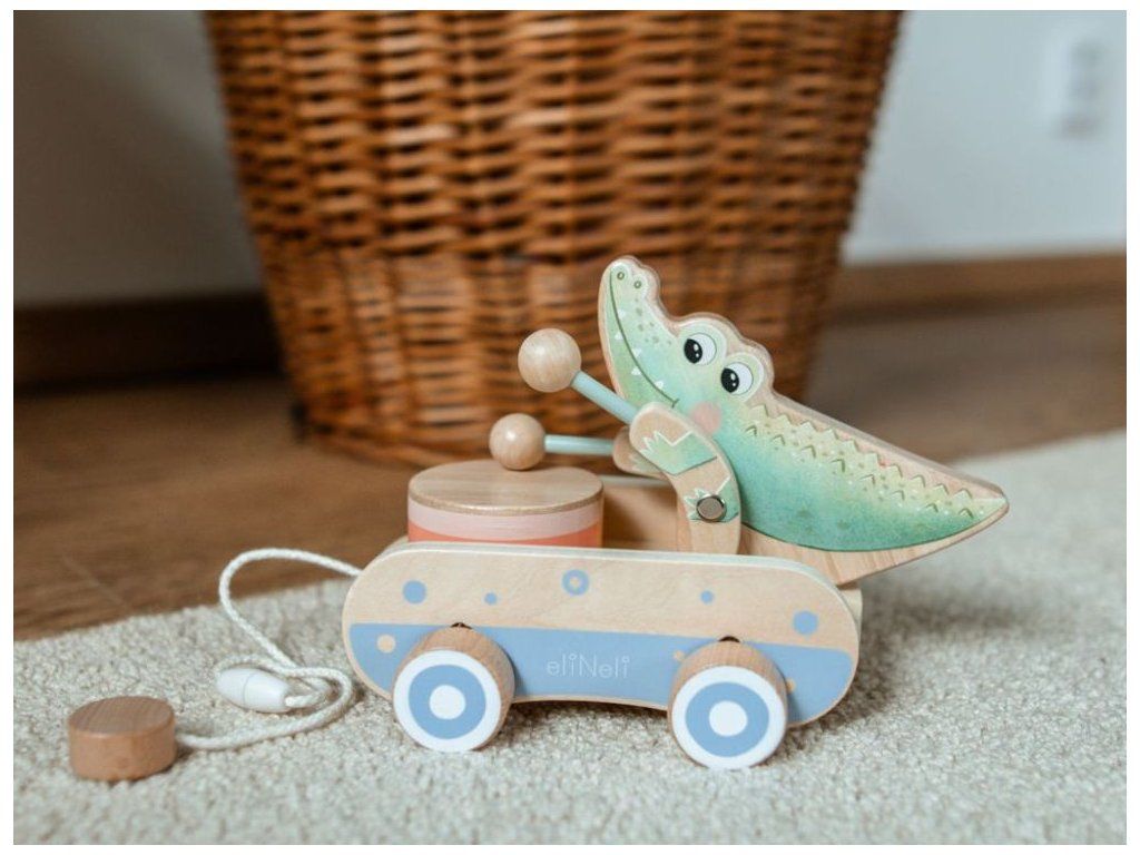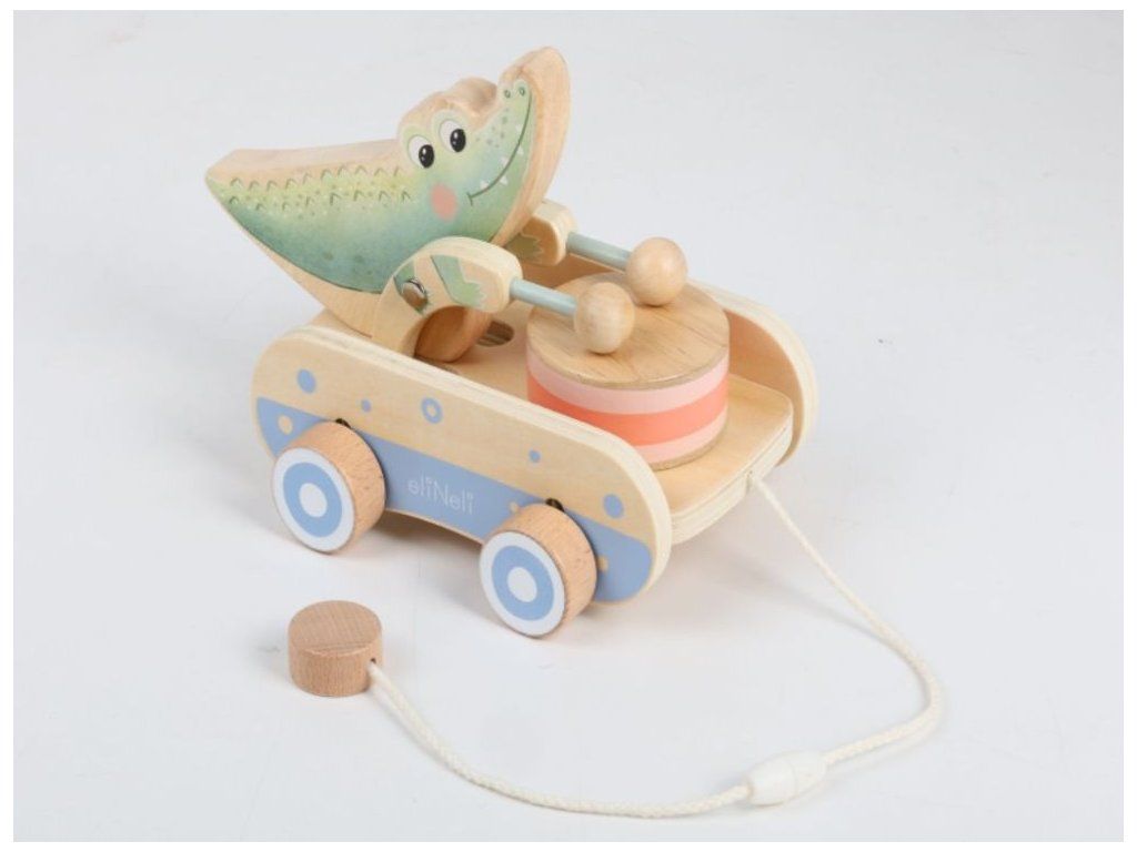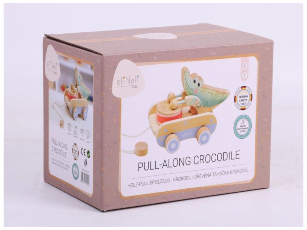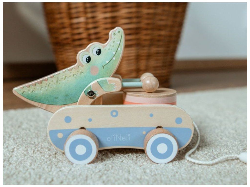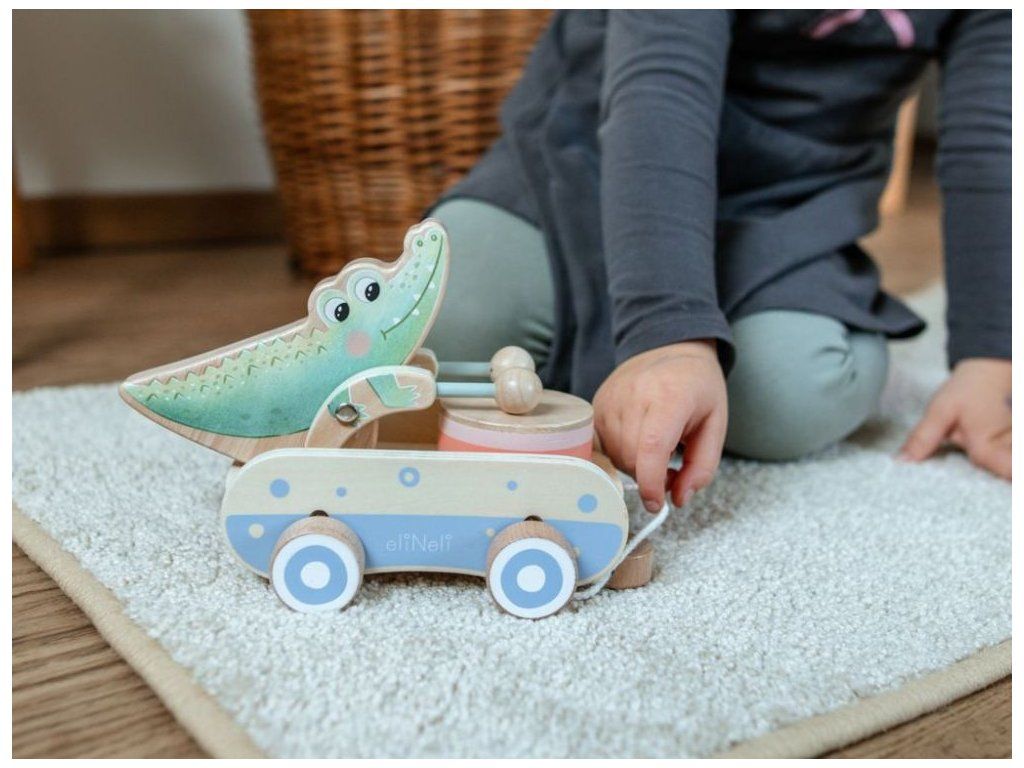 Roztomilá ťahacia hračka pre chlapcov aj dievčatká Drevená ťahacia hračka v podobe roztomilého krokodílieho kamaráta bude obľúbeným spoločníkom detí pri prvých krôčikoch. Už pri pohybe po kolienkach bude krokodíl deti nadšene povzbudzovať v ďalších pokusoch. Pri pohybe sa jeho ručičky s paličkami rozozniejú o bubienok a vytvárajú veselý rytmus, ktorý podnecuje zvedavosť a prirodzene rozvíja hudobné cítenie. Ťahací krokodíl podporuje rozvoj motorických schopností, rovnováhy a koordinácie, zatiaľ čo deti motivuje k aktívnemu pohybu a objavovaniu okolitého sveta. Je to verný priateľ, ktorý sa stane nielen obľúbeným spoločníkom na prechádzkach po byte, ale aj krásnym doplnkom do detskej izbičky, ktorý v sebe spája funkčnosť, hravosť a kúzlo tradičnej drevenej hračky. Ťahacia šnúrka je opatrená chytrou bezpečnostnou spojkou, ktorá sa pri silnejšom zatiahnutí sama rozpojí. Deti sa tak môžu hrať úplne bezpečne, bez rizika zachytenia alebo poranenia. Vďaka jemnému pastelovému prevedeniu pôsobí hračka veľmi príjemne a hodí sa pre dievčatká aj pre chlapčekov. Kvalitné drevené spracovanie zaisťuje odolnosť aj bezpečnosť pri každodennom hraní, hladký povrch je navyše príjemný a šetrný k detským ručičkám. Technické parametre: Rozmery: 14,5 x 14 x 20,8 cm (výška x šírka x dĺžka). Rozmery balenia: 15 x 14,5 x 21,5 cm (výška x šírka x dĺžka). Materiál: kaučuk, preglejka, bukové drevo, brezové drevo. Odporúčaný vek: od 12 mesiacov, 12m+. Značka eliNeli prináša do detského sveta moderný dizajn v spojení s moderným európskym štýlom inšpirovaným nemeckou kvalitou a dizajnom. Prioritou pri výrobe sú prírodné materiály, prírodné drevo, čím podporuje udržateľnosť a bezpečnosť hračiek. Nové výrobky prechádzajú prísnymi bezpečnostnými testami TÜV Rheinland, čo zaisťuje bezpečnú hru deťom a pokoj rodičom. Niektoré z produktov eliNeli sú navrhnuté s ohľadom na reálne potreby detí a rešpektujú ich rozvojové fáze podľa montessori metodiky. S eliNeli sa deti učia, tvoria a rastú v bezpečnom a podnetnom prostredí, ktoré nielen spĺňa, ale prekonáva ich očakávania. Viac o produktoch eliNeli nájdete na: https://www.elineli.eu/sk/.