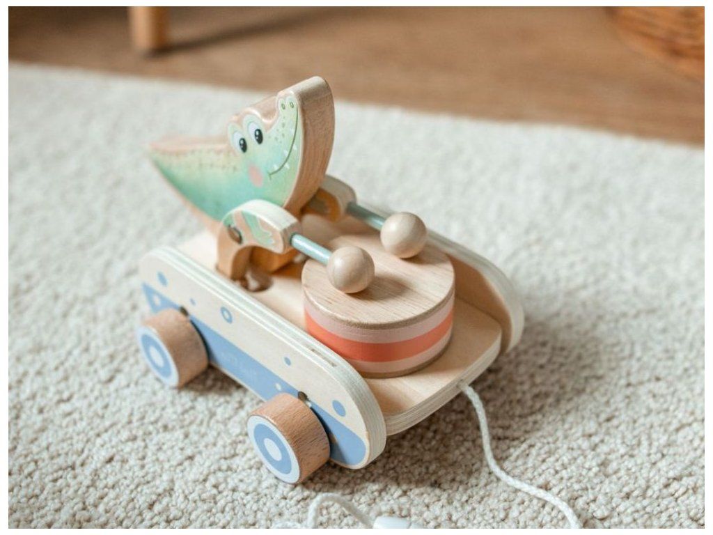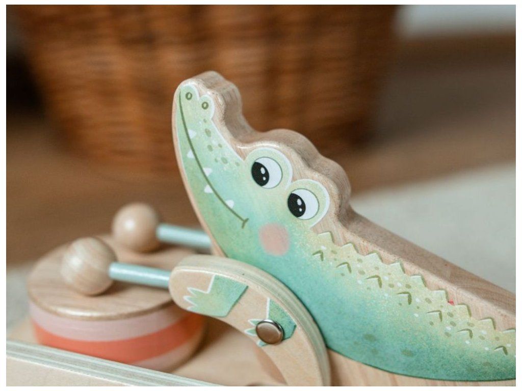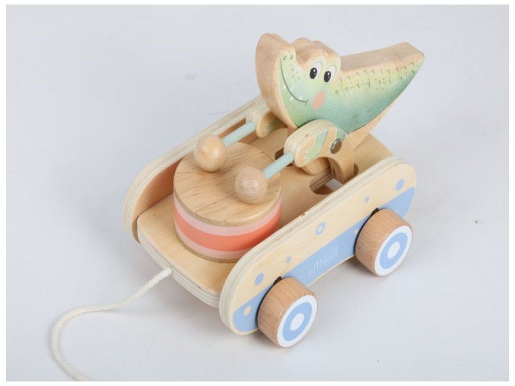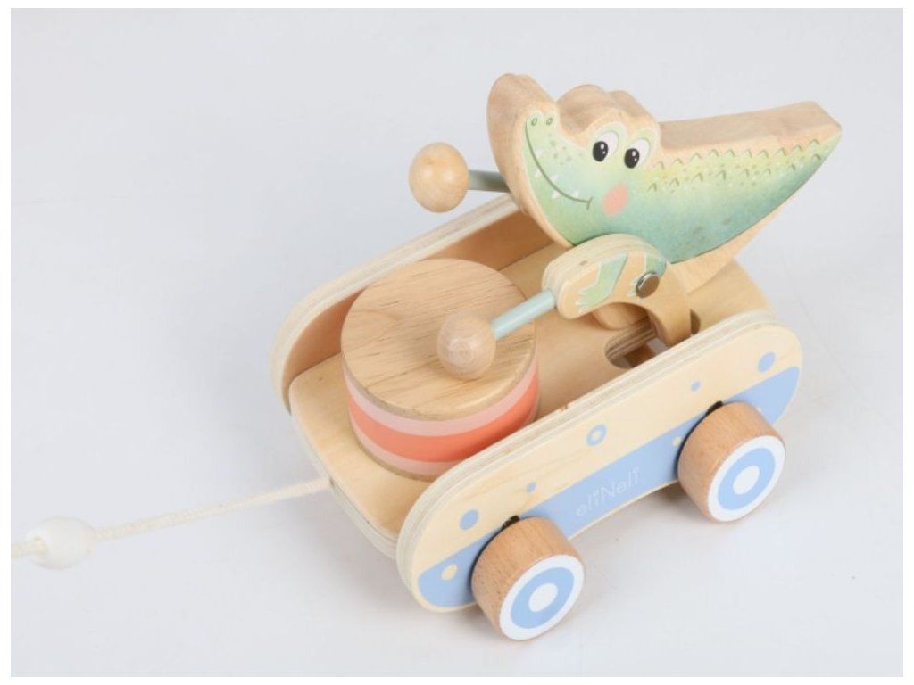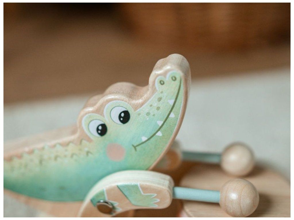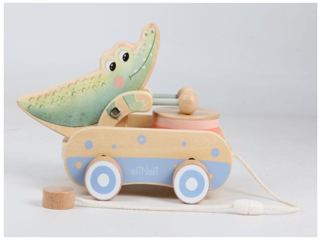 Roztomilá ťahacia hračka pre chlapcov aj dievčatká Drevená ťahacia hračka v podobe roztomilého krokodílieho kamaráta bude obľúbeným spoločníkom detí pri prvých krôčikoch. Už pri pohybe po kolienkach bude krokodíl deti nadšene povzbudzovať v ďalších pokusoch. Pri pohybe sa jeho ručičky s paličkami rozozniejú o bubienok a vytvárajú veselý rytmus, ktorý podnecuje zvedavosť a prirodzene rozvíja hudobné cítenie. Ťahací krokodíl podporuje rozvoj motorických schopností, rovnováhy a koordinácie, zatiaľ čo deti motivuje k aktívnemu pohybu a objavovaniu okolitého sveta. Je to verný priateľ, ktorý sa stane nielen obľúbeným spoločníkom na prechádzkach po byte, ale aj krásnym doplnkom do detskej izbičky, ktorý v sebe spája funkčnosť, hravosť a kúzlo tradičnej drevenej hračky. Ťahacia šnúrka je opatrená chytrou bezpečnostnou spojkou, ktorá sa pri silnejšom zatiahnutí sama rozpojí. Deti sa tak môžu hrať úplne bezpečne, bez rizika zachytenia alebo poranenia. Vďaka jemnému pastelovému prevedeniu pôsobí hračka veľmi príjemne a hodí sa pre dievčatká aj pre chlapčekov. Kvalitné drevené spracovanie zaisťuje odolnosť aj bezpečnosť pri každodennom hraní, hladký povrch je navyše príjemný a šetrný k detským ručičkám. Technické parametre: Rozmery: 14,5 x 14 x 20,8 cm (výška x šírka x dĺžka). Rozmery balenia: 15 x 14,5 x 21,5 cm (výška x šírka x dĺžka). Materiál: kaučuk, preglejka, bukové drevo, brezové drevo. Odporúčaný vek: od 12 mesiacov, 12m+. Značka eliNeli prináša do detského sveta moderný dizajn v spojení s moderným európskym štýlom inšpirovaným nemeckou kvalitou a dizajnom. Prioritou pri výrobe sú prírodné materiály, prírodné drevo, čím podporuje udržateľnosť a bezpečnosť hračiek. Nové výrobky prechádzajú prísnymi bezpečnostnými testami TÜV Rheinland, čo zaisťuje bezpečnú hru deťom a pokoj rodičom. Niektoré z produktov eliNeli sú navrhnuté s ohľadom na reálne potreby detí a rešpektujú ich rozvojové fáze podľa montessori metodiky. S eliNeli sa deti učia, tvoria a rastú v bezpečnom a podnetnom prostredí, ktoré nielen spĺňa, ale prekonáva ich očakávania. Viac o produktoch eliNeli nájdete na: https://www.elineli.eu/sk/.
