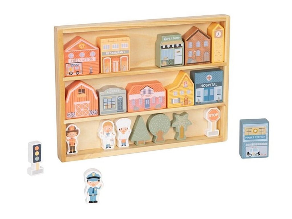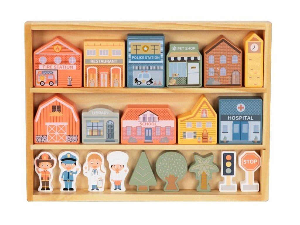 Drevené kocky - mesto Drevené kocky patria medzi najobľúbenejšie drevené hračky. S kockami môžu deti popustiť uzdu svojej fantázii, hrať sa a stavať cesty, domčeky aj celé mestá. S drevenými kockami mesto vybudujú deti úžasné mesto s nemocnicou, policajnú a hasičskú stanicu, so školou, knižnicou, obchodíkmi, obytnými domami a večne zelenými stromami raz dva. Na dodržiavanie poriadku dohliadne postavička policajta, o chorých sa postará pán doktor a pre prípad požiara v meste nechýba ani ďalší hrdina - hasič. Drevené kocky krásne uložené v praktickej krabičke si deti jednoducho prenesú na miesto, kde sa s nimi chcú hrať, môžu si ich zobrať so sebou na návštevu, na víkend k babičke aj na dovolenku. Technické parametre: Obsah balenia: 20 drevených kociek (domčeky, postavičky, stromy a dopravné značky). Rozmer balenia: 30 x 22 cm. Materiál: MDF, preglejka. Certifikáty: CE, 2009/48/ES, EN 71-1, EN 71-2 a EN 71-3. Odporúčaný vek: od 3 rokov.Dodatočné parametre