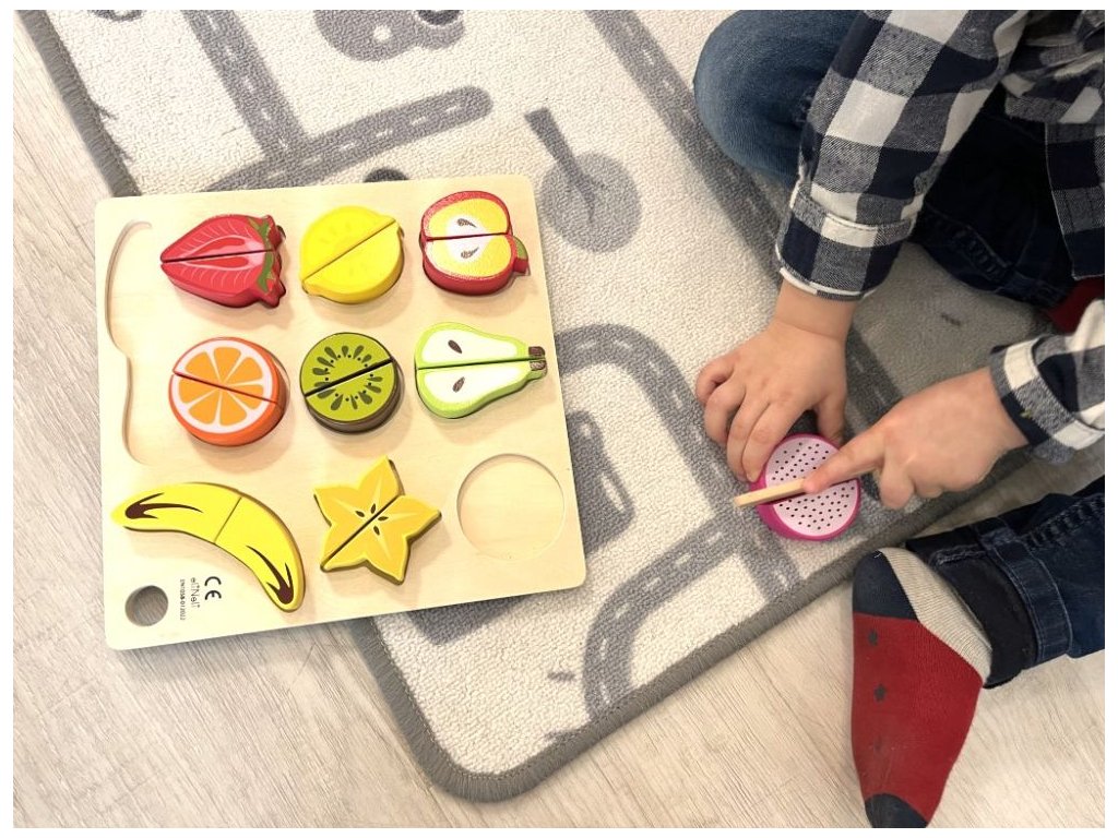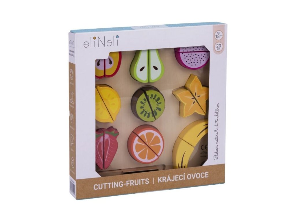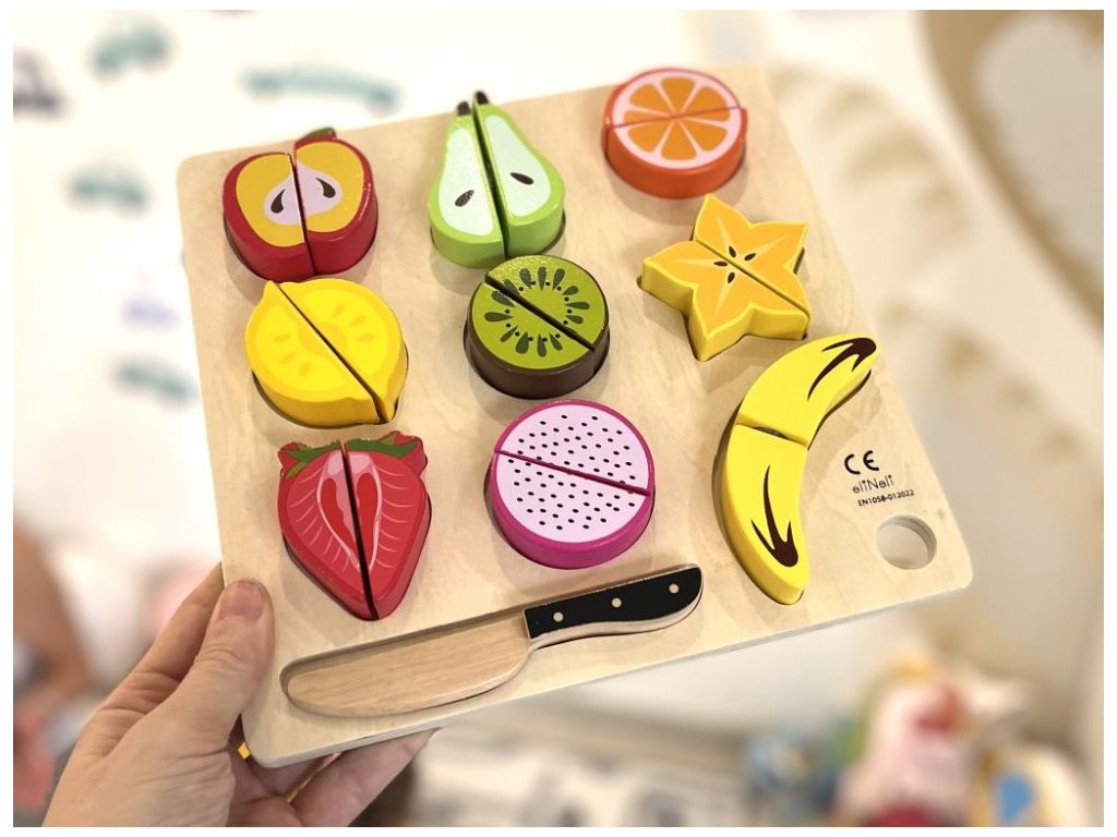 eliNeli je česká značka drevených hračiek a nábytku s jedinečným farebným designom a so zahraničnou výrobou. Produkty eliNeli rozvíjajú kreativitu a pohybový potenciál detí, skvele zapadnú do interiéru a vracajú sa k tradičnému materiálu – k drevu. Unikátne na značke je designová kombinácia prírodných a neskoro letných až jesenných farieb, ktoré sa hodia do minimalistického scandi interiéru, a ktoré inde nenájdete. To všetko za veľmi dostupné ceny. Drevené ovocie je skvelým doplnkom do detských kuchyniek i obchodíkov. S krájacím ovocím sa deti môžu pustiť do varenia, prípravy raňajok alebo desiaty pre svoje obľúbené hračky, kamarátov aj rodičov. Deväť druhov ovocia, ktoré deti poznajú zo záhradky, z domova alebo z obchodu, je rozdelených na polovice, ktoré pri sebe drží len suchý zips. Stačí vziať drevený nožík do rúčky a v správnom mieste ovocia rozkrojiť. Súčasťou balenia je krásna krájacia doštička (doštička) aj drevený nôž. Krájacie ovocie je obľúbenou detskou hračkou, vďaka ktorej si deti môžu vyskúšať krájanie nožom bezpečným, detským, spôsobom. Prečo vybrať toto drevené ovocie: Kvalitná výroba - vyrobené z prírodného dreva. Krájacie - každé ovocie sa skladá z dvoch polovičiek spojených pomocou suchého zipsu. Súčasťou balenia je drevený nôž, pomocou ktorého deti ovocie ľahko rozkroja na polovice. Krásne farby - krásne farby a vybrané druhy ovocia dodávajú drevenej hračke lákavý vzhľad. 9 druhov ovocia - v sade deti nájdu 9 druhov ovocia, domáce aj exotické. Ovocie s príslušenstvom - balenie obsahuje nielen ovocie, ale aj doštičku (doštičku) na krájanie a drevený nôž. Hračka i vzdelávacia pomôcka - pri krájaní deti zdokonalia motorické zručnosti, koordináciu očí a rúk, manuálnu zručnosť, učia sa držať kuchynský nôž a zaobchádzať s ním, učia sa farbičky, druhy ovocia a pokojne si môžu precvičiť aj počty. Bezpečná hračka pre deti - ovocie aj drevené príslušenstvo je natreté bezpečnými, netoxickými, vodou riediteľnými farbami. Technické parametre: Rozmery: 24,5 x 24,5 x 3,5 cm. Materiál: borievkové drevo, preglejka, MDF. Certifikáty: CE, 2009/48/ES, EN 71-1, EN 71-2 a EN 71-3. Doporučený vek: od 1,5 roku, 18m+. Viac o produktoch eliNeli nájdete na: https://www.elineli.eu/sk/. Často kladené otázky: Je hračka bezpečná pre deti? Drevené ovocie eliNeli je testované, vhodné a bezpečné pre deti a vydrží vašim deťom dlho. Spĺňa požiadavky smernice o bezpečnosti hračiek 2009/48/ES a normy o nezávadnosti a bezpečnosti hračiek EN 71-1, 2, 3, kedy sa testujú mechanické a fyzikálne vlastnosti, horľavosť i migrácia určitých látok. Krájacie ovocie otestoval a Certifikát o zhode (Osvedčenie o zhode - CE) udelil technický a skúšobný ústav. U dreveného ovocia na krájanie od eliNeli máte istotu, že je pre vaše deti vhodná a bezpečná, je testovaná, na náter sú požité netoxické, zdravotne nezávadné laky a farby.Dodatočné parametre
