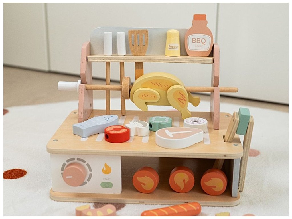 Drevený gril s bohatým príslušenstvom umožní deťom grilovať a organizovať Barbecue slávnosti po celý rok, v každom počasí, pokojne aj v detskej izbe. Napriek tomu, že sú súčasťou grilu plamienky, nemusíte mať z hračky žiadne obavy, tento ohník je drevený a nepáli. Rôzne druhy masa a potravín môžu deti pripravovať viacerými spôsobmi - grilovať na rošte, opekať alebo pripraviť špízy. Fantázii sa medze nekladú a možno vás váš malý kuchárik prekvapí, aký vie byť kreatívny. Súčasťou grilu je aj rôzne grilovacie náradie a dochucovadlá. Pri hre s dreveným grilom si deti vyskúšajú grilovanie bezpečným spôsobom, zdokonalia motorické schopnosti, manuálnu zručnosť, rozvíjajú fantáziu a kreativitu, komunikačné schopnosti, hrajú role. Prečo vybrať tento drevený gril: Prírodný materiál - eliNeli kladie dôraz na výrobu z dreva a prírodných materiálov, čím zaisťuje ekologickú šetrnosť a bezpečnosť hračiek. Vysoké bezpečnostné štandardy - hračka prešla prísnymi nemeckými bezpečnostnými testami TÜV Rheinland, čo zaručuje maximálnu bezpečnosť pre vaše deti. Edukatívna hračka - drevená BBQ sada umožní deťom vyskúšať si prípravu pokrmov na grile bezpečným detským spôsobom. Hra aj zdokonaľovanie schopností - pri hre s grilom (BBQ sadou) deti napodobňujú dospelácke činnosti a to je veľká zábava, zdokonaľujú motorické schopnosti, manuálnu zručnosť, rozvíjajú svoju fantáziu a kreativitu. Neutrálne farby - vďaka kombinácii prírodného dreva s pastelovými farbami je gril krásnym darčekom pre dievčatká aj chlapcov. Do kuchynky - drevený gril by nemal chýbať v žiadnej detskej kuchynke alebo záhradnom domčeku. Jedine tak deti môžu organizovať Barbecue slávnosti, kedykoľvek dostanú chuť na nejakú dobrotu z grilu. Hračka bezpečná pre deti - vyrobená prevažne z prírodných materiálov, natretá bezpečnými, netoxickými, vodou riediteľnými farbami. Technické parametre: Rozmer: 30 x 20 x 24,5 cm. Rozmer balenia: 34,5 x 32,5 x 23 cm. Počet dielov v balení: 24. Hmotnosť: 1,35 kg. Materiál: drevo Schima, preglejka, MDF. Certifikáty a normy: CE, 2009/48/ES, TÜV Rheinland, EN 71-1, 2 a 3. Odporúčaný vek: od 3 rokov, 36m+. Upozornenie: Súčasťou setu sú drevené potraviny, ktoré sú hračkou a nie sú určené na konzumáciu. Značka eliNeli prináša do detského sveta moderný dizajn v spojení s moderným európskym štýlom inšpirovaným nemeckou kvalitou a dizajnom. Prioritou pri výrobe sú prírodné materiály, prírodné drevo, čím podporuje udržateľnosť a bezpečnosť hračiek. Nové výrobky prechádzajú prísnymi bezpečnostnými testami TÜV Rheinland, čo zaisťuje bezpečnú hru deťom a pokoj rodičom. S eliNeli sa deti učia, tvoria a rastú v bezpečnom a podnetnom prostredí, ktoré nielen spĺňa, ale prekonáva ich očakávania. Viac o produktoch eliNeli nájdete na: https://www.elineli.eu/sk/. Pozrite si bohaté príslušenstvo parádneho detského grilu: Často kladené otázky: Je hračka bezpečná pre deti? Drevený gril eliNeli je testovaný, vhodný a bezpečný pre deti a vydrží vašim deťom dlho. Hračka prešla prísnymi bezpečnostnými testami TÜV Rheinland. Spĺňa požiadavky smernice o bezpečnosti hračiek 2009/48/ES a normy o nezávadnosti a bezpečnosti hračiek EN 71-1, 2, 3, kedy sa testujú mechanické a fyzikálne vlastnosti, horľavosť aj migrácia určitých látok. Detský drevený gril (BBQ sadu) otestoval a Certifikát o zhode (Osvedčenie o zhode - CE) udelil technický a skúšobný ústav. Pri drevenom grile od eliNeli máte istotu, že je pre vaše deti vhodný a bezpečný, je testovaný, na náter sú použité netoxické, zdravotne nezávadné laky a farby.Dodatočné parametre