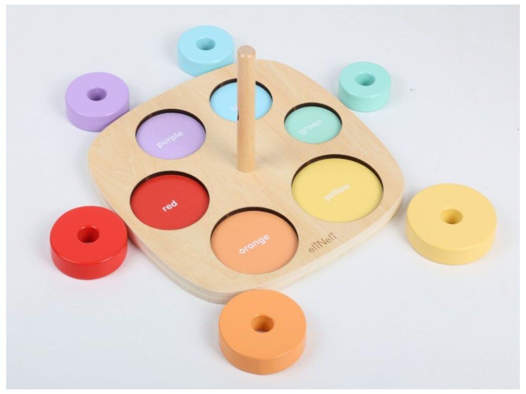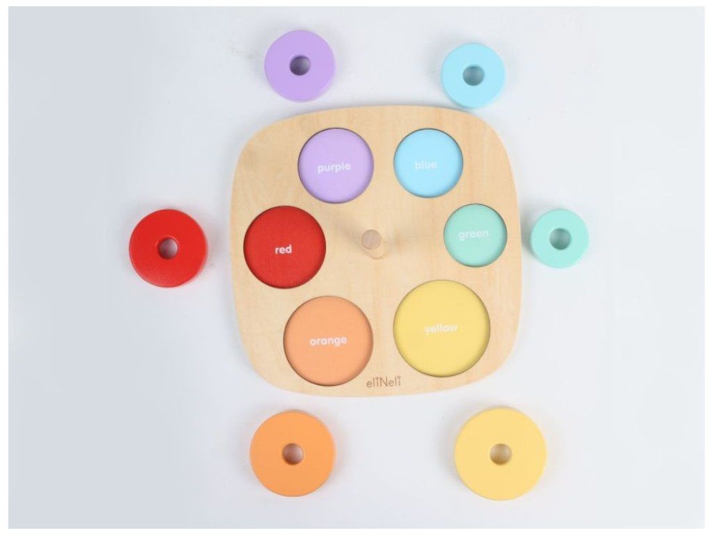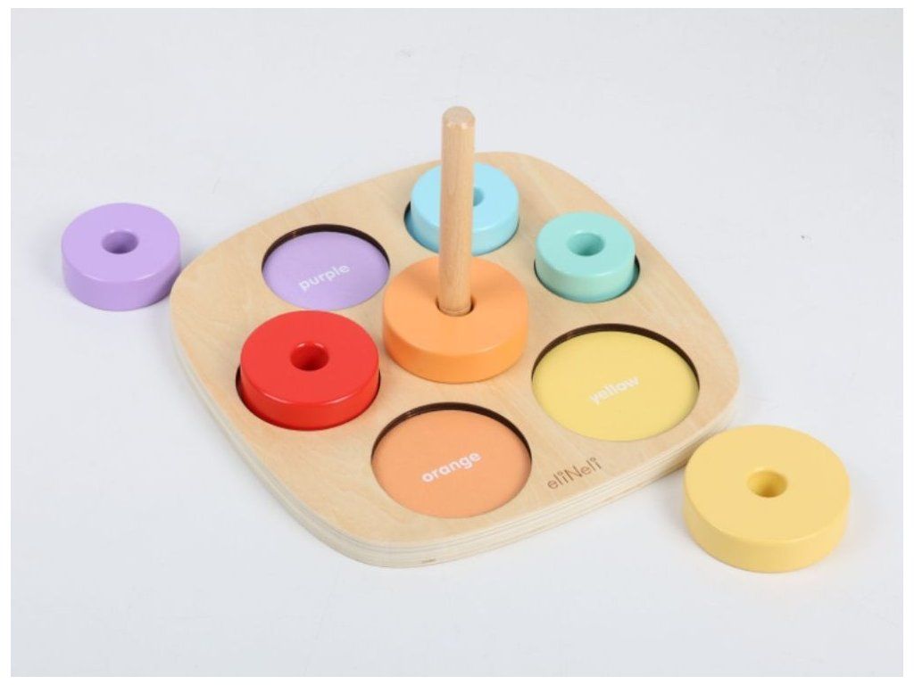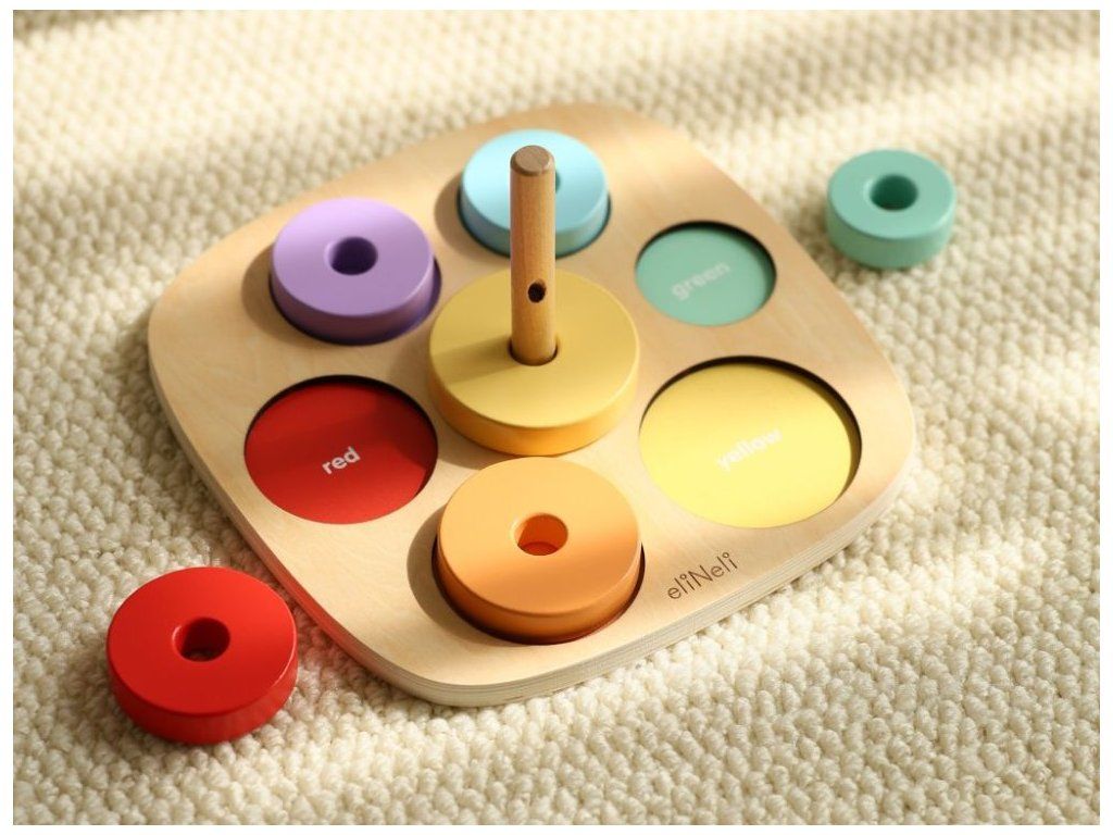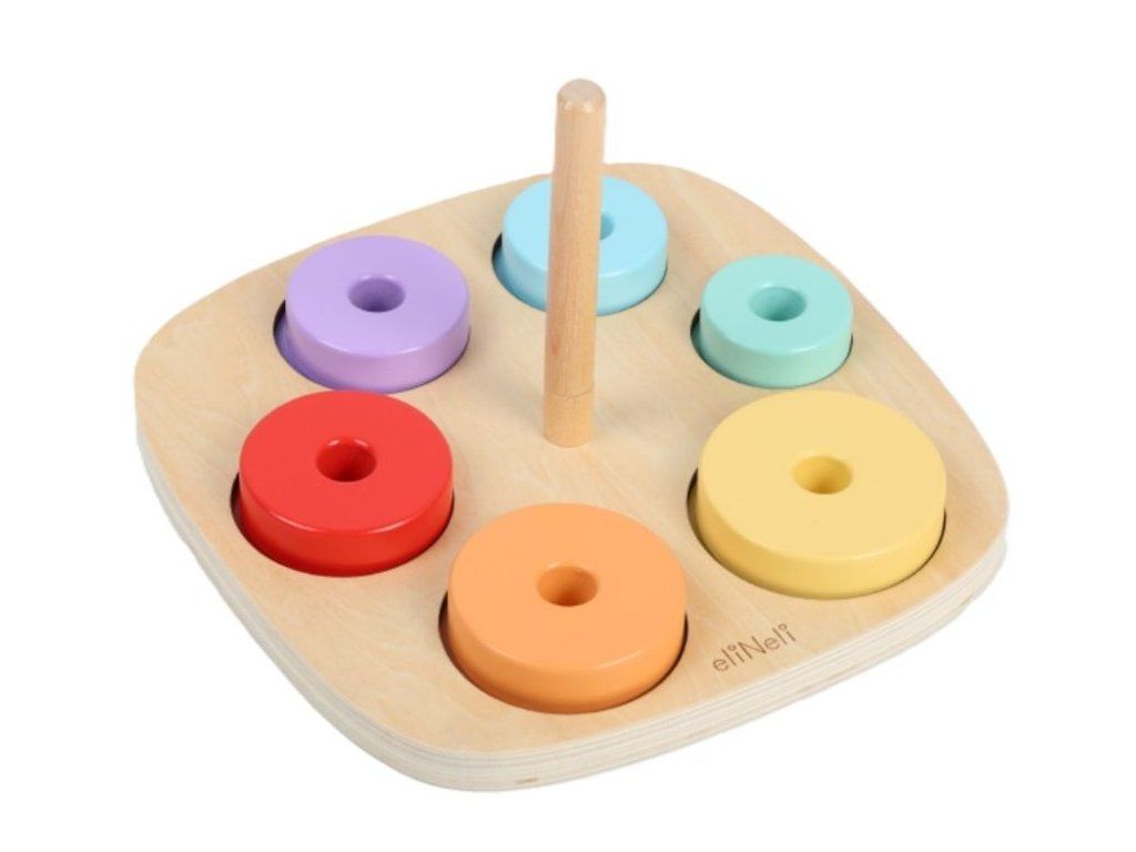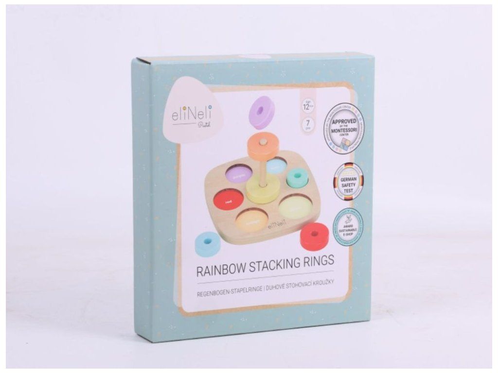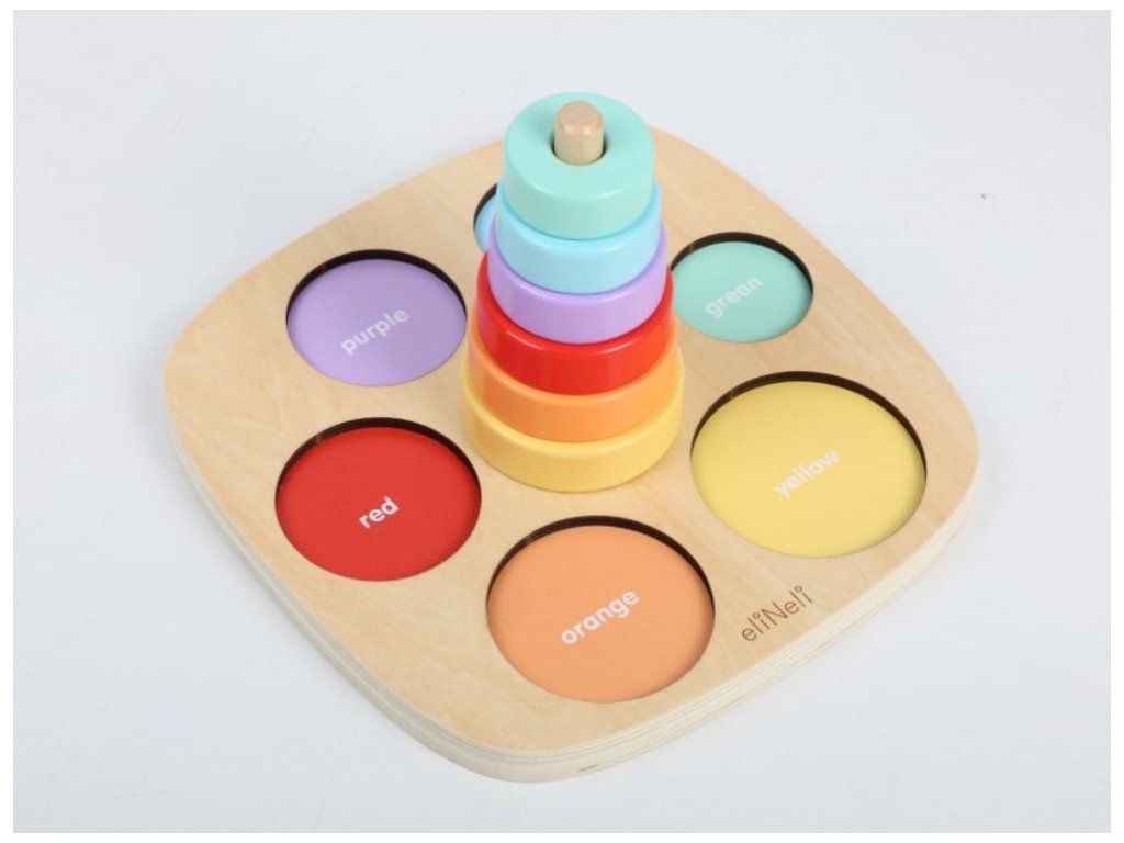 Motorická hračka na učenie farieb Drevená vkladačka a nasadzovacia hra v jednom je ideálnou pomôckou na zábavné učenie a rozvoj detských schopností. Deti si hrou osvoja farby a naučia sa rozoznať rôzne veľkosti. Pri navliekaní krúžkov môžu začať s prvými počtami a hravou formou rozvíjajú jemnú motoriku aj logické myslenie. Nájdu tu aj prvé anglické slovíčka (názvy farieb), ktoré sa jednoducho naučia pri spoločnej hre. Kvalitné drevené prevedenie so zaoblenými hranami zaisťuje bezpečnosť a odolnosť. Vďaka viacerým hracím možnostiam sa Montessori hračka určite stane každodenným zábavným aj náučným spoločníkom na dlhú dobu. Technické parametre: Rozmery: 11,5 x 22 x 22 cm (výška x šírka x dĺžka). Rozmery balenia: 4,5 x 22,5 x 22,5 cm (výška x šírka x dĺžka). Materiál: preglejka, MDF, brezové drevo. Odporúčaný vek: od 12 mesiacov, 12m+. Značka eliNeli prináša do detského sveta moderný dizajn v spojení s moderným európskym štýlom inšpirovaným nemeckou kvalitou a dizajnom. Prioritou pri výrobe sú prírodné materiály, prírodné drevo, čím podporuje udržateľnosť a bezpečnosť hračiek. Nové výrobky prechádzajú prísnymi bezpečnostnými testami TÜV Rheinland, čo zaisťuje bezpečnú hru deťom a pokoj rodičom. Niektoré z produktov eliNeli sú navrhnuté s ohľadom na reálne potreby detí a rešpektujú ich rozvojové fáze podľa montessori metodiky. S eliNeli sa deti učia, tvoria a rastú v bezpečnom a podnetnom prostredí, ktoré nielen spĺňa, ale prekonáva ich očakávania. Viac o produktoch eliNeli nájdete na: https://www.elineli.eu/sk/.Dodatočné parametre