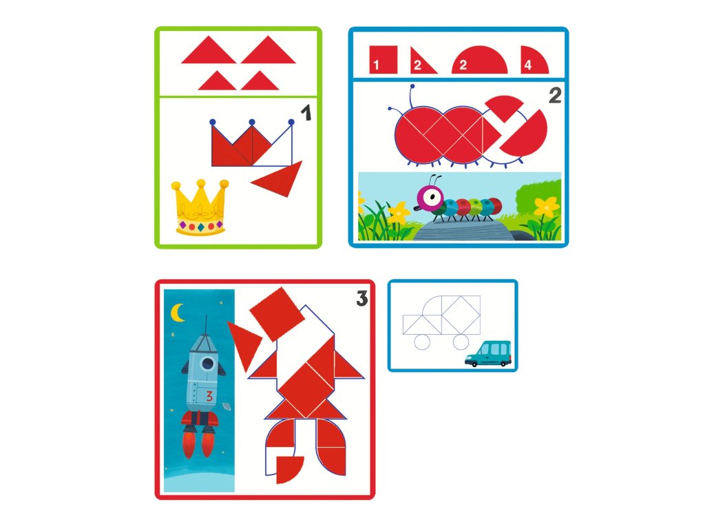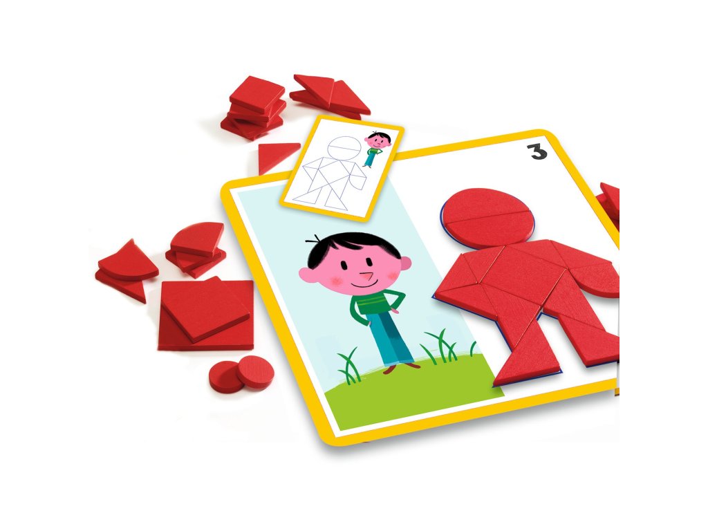 Eduludo: Tvary – Obrázkový tangramLogická hra pre deti na skladanie obrázkov z geometrických tvarovEduludo – Tvary: obrázkový tangram od značky Djeco je edukačná logická hra, ktorá deti učí pracovať s geometrickými tvarmi a skladať z nich obrázky podľa predlohy. Dieťa prikladá farebné dieliky na podložku tak, aby presne vyplnilo siluetu obrázka – bez prekrývania a medzier. Hra ponúka postupne náročnejšie úlohy, vďaka čomu sa deti učia premýšľať, skúšať riešenia a rozvíjať priestorové vnímanie. Tangram je ideálny pre pokojné sústredenie doma aj ako edukačná pomôcka v škôlke.Čo si dieťa pri hre rozvíjapriestorové a logické myslenierozpoznávanie tvarovschopnosť riešiť problémysústredenie a trpezlivosťjemnú motorikuPrečo si vybrať Eduludo – obrázkový tangram od Djecoučenie tvarov hravou a vizuálnou formouúlohy s rastúcou náročnosťoukvalitné spracovanie typické pre Djecoideálne pre samostatnú hruvhodné pre deti od 3 rokovObsah balenia36 drevených geometrických tvarov24 predlohových obrázkovDodatočné parametre