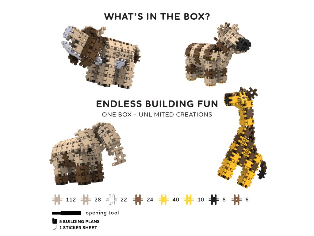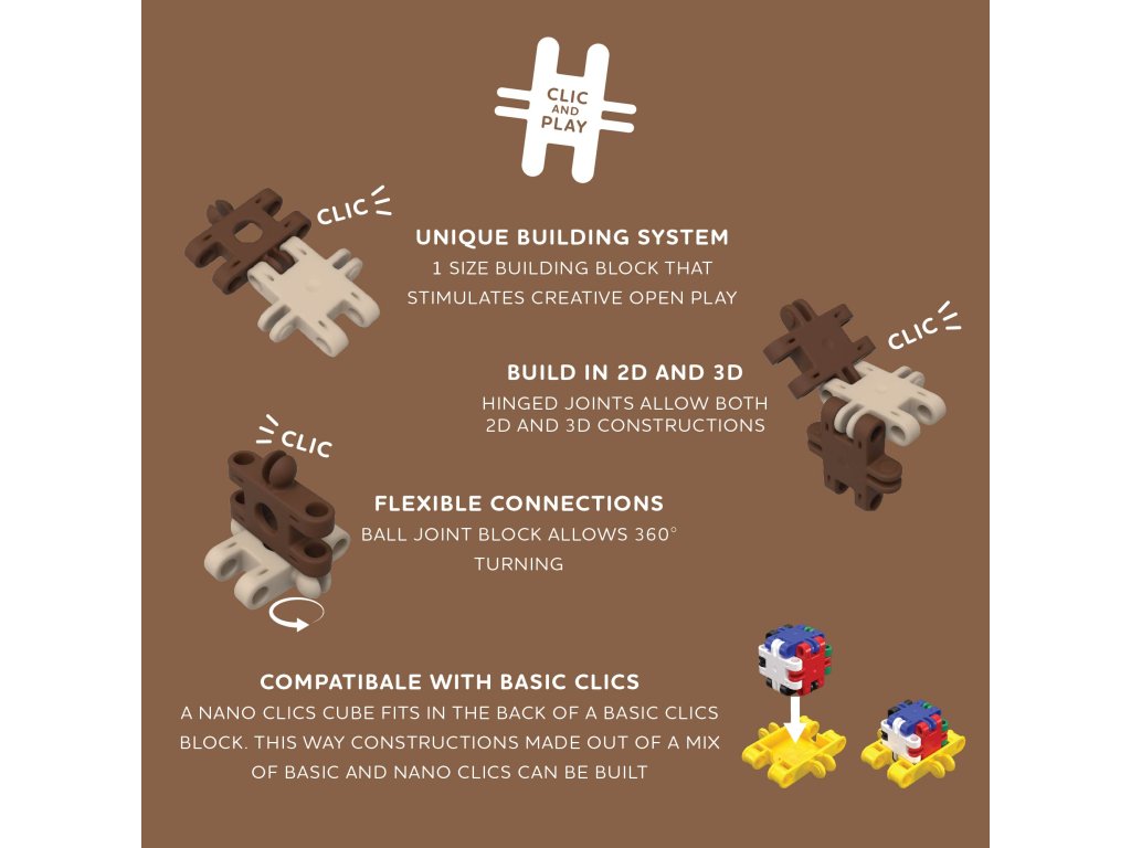 Ekologická stavebnica Nano Clics Divočina 250 ks Vytvorte si žirafu, zebru či nosorožca s ekologickou stavebnicou Ekologická stavebnica Nano Clics Divočina je skvelou voľbou pre všetkých malých staviteľov. Táto 250-dielna farebná stavebnica ponúka všetko, čo dieťa potrebuje na vytvorenie rôznych úžasných výtvorov, ako je levík, žirafa, zebra či nosorožec. Dieliky sú menšie, čo umožňuje vytvárať detailnejšie 2D a 3D stavby. Súčasťou balenia je aj hárok nálepiek a podrobné stavebné plány, ktoré pomôžu deťom postaviť minimálne 5 realistických figúrok. Vďaka novému dizajnu blokov s otvorom v strede je možné vytvoriť ešte prepracovanejšie stavby a deti si užijú hodiny plné kreatívnej zábavy.Bezpečné stavanie a rozvoj detských zručností v jednom Nano Clics sú vyrobené z odolného, netoxického plastu, ktorý sa jednoducho čistí, utretím vlhkou handričkou. Táto stavebnica nie je len skvelou zábavou, ale aj bezpečnou hračkou, ktorá podporuje detskú kreativitu a rozvíja motorické zručnosti. Výrobok je určený pre deti staršie ako 8 rokov, pričom ponúka široké možnosti rozšírenia, vďaka ďalším stavebniciam Nano Clics.Dodatočné parametre