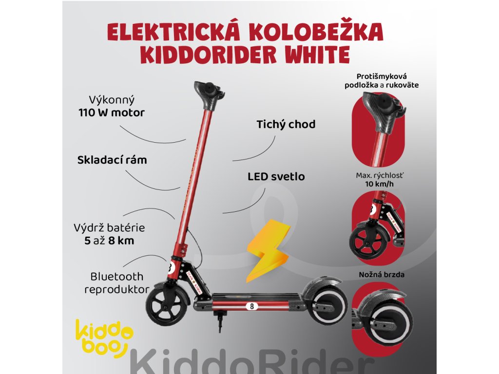 Elektrická kolobežka KiddoRacer Red Elektrická kolobežka pre deti s moderným dizajnom Hľadáš ideálny spôsob, ako dieťa zabaviť, rozhýbať a zároveň mu dopriať bezpečný dopravný prostriedok? Kiddoboo KiddoRacer Red je detská elektrická kolobežka, ktorá spája retro dizajn, funkčnosť a bezpečnosť v jednom. Vďaka kompaktnému prevedeniu a intuitívnemu ovládaniu je vhodná pre deti už od 6 rokov – a zaručene z nej nebudú chcieť zliezť.Plynulá jazda s výkonom, ktorý zvládne detský svet Výkonný 110 W motor – ideálny na mestské chodníky či rodinné výletyMaximálna rýchlosť 10 km/h – dostatočne rýchla na zábavu, no bezpečnáVýdrž batérie až 8 km – optimálna vzdialenosť pre detské výletyBezpečnosť a pohodlie pre deti aj rodičov Protišmyková podložka a rukoväte – pre stabilitu počas celej jazdyNožná brzda – jednoduché a spoľahlivé zastavenieSkladací rám – ľahké prenášanie a uskladnenieDizajn, ktorý deti milujú Retro červený vzhľad, ktorý pôsobí štýlovoLED svetlo pre zvýšenie viditeľnosti Tichý chod, ktorý neruší a zvyšuje komfort jazdyKiddoboo elektrická kolobežka KiddoRacer Red je skvelý darček pre aktívne deti, ktoré milujú pohyb. Zábava, sloboda a bezpečnosť sa stretávajú v tejto elektrickej kolobežke navrhnutej s dôrazom na potreby mladých jazdcov. Tu nájdete návodDodatočné parametre