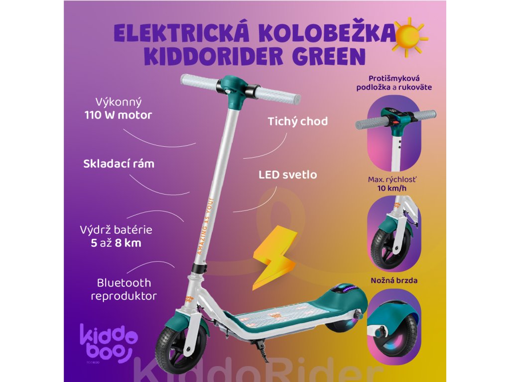 Elektrická kolobežka KiddoRider Green Elektrická kolobežka pre deti s moderným dizajnom Hľadáš ideálny spôsob, ako dieťa zabaviť, rozhýbať a zároveň mu dopriať bezpečný dopravný prostriedok? Kiddoboo KiddoRider Green je detská elektrická kolobežka, ktorá spája moderný dizajn, funkčnosť, radosť zo zvuku a bezpečnosť v jednom. Vďaka kompaktnému prevedeniu a intuitívnemu ovládaniu je vhodná pre deti už od 6 rokov – a zaručene z nej nebudú chcieť zliezť.Plynulá jazda s výkonom, ktorý zvládne detský svet Výkonný 110 W motor – ideálny na mestské chodníky či rodinné výletyMaximálna rýchlosť 10 km/h – dostatočne rýchla na zábavu, no bezpečnáVýdrž batérie až 8 km – optimálna vzdialenosť pre detské výletyBluetooth reproduktor - extra funkcia pre milovníkov hudbyBezpečnosť a pohodlie pre deti aj rodičov Protišmyková podložka a rukoväte – pre stabilitu počas celej jazdyNožná brzda – jednoduché a spoľahlivé zastavenieSkladací rám – ľahké prenášanie a uskladnenieDizajn, ktorý deti milujú Minimalistický bielo-zelený vzhľad, ktorý pôsobí moderne a neutrálneLED svetlá pre zvýšenie viditeľnosti a štýluTichý chod, ktorý neruší a zvyšuje komfort jazdyKiddoboo elektrická kolobežka KiddoRider Green je skvelý darček pre aktívne deti, ktoré milujú pohyb. Zábava, sloboda a bezpečnosť sa stretávajú v tejto elektrickej kolobežke navrhnutej s dôrazom na potreby mladých jazdcov. Tu nájdete návodDodatočné parametre