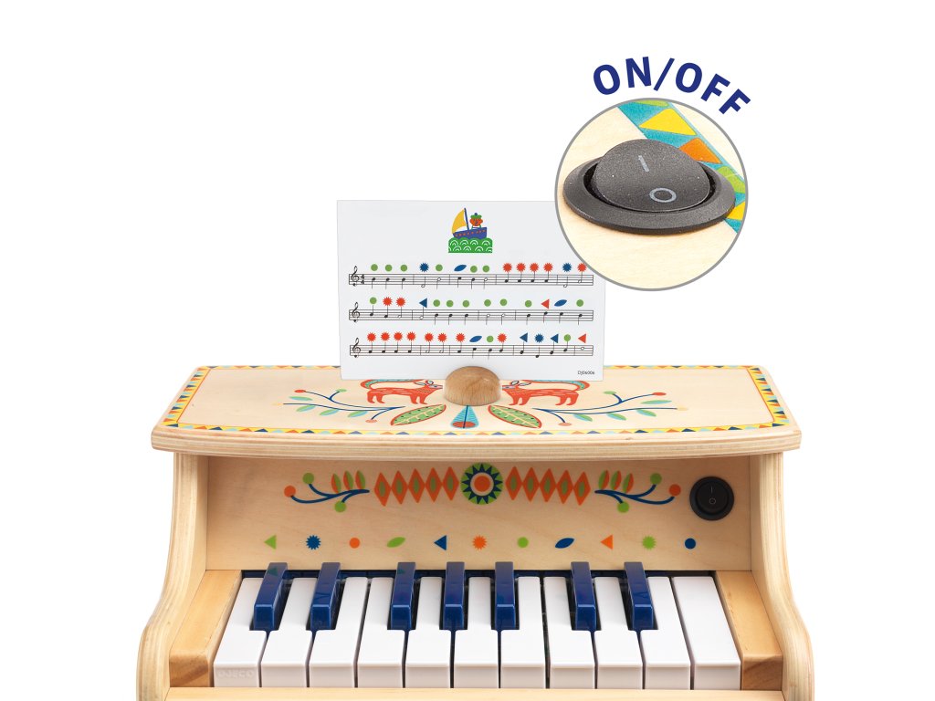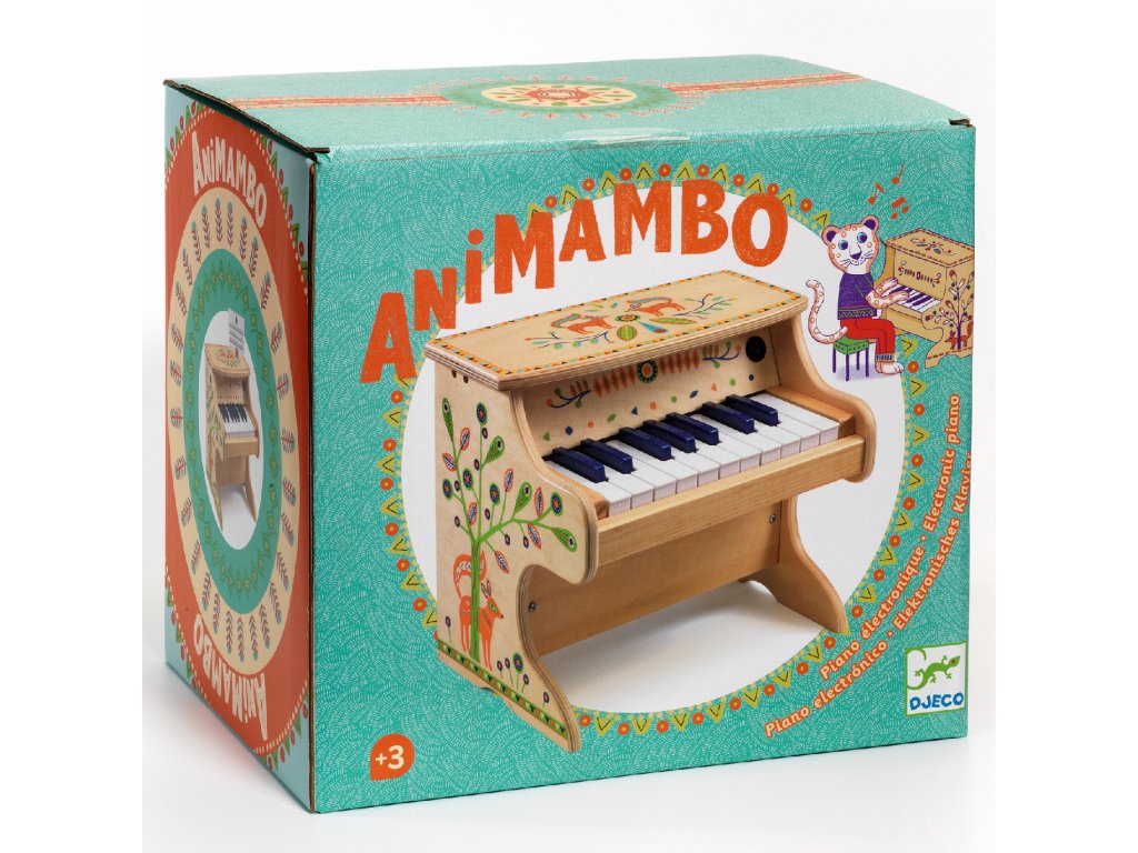 Elektronické piáno Animambo 18 kláves Prvé elektronické piáno: 18 kláves a značky, vďaka ktorým sa hrá ľahšieElektronické piáno Animambo 18 kláves je krásne ilustrované stolové piáno, na ktorom si deti zahrajú prvé melódie a rytmy. Klávesy majú značky, ktoré zodpovedajú notovým kartám – hranie je tak pre deti prehľadné.Piáno funguje na batérie a je ideálne na domáce muzicírovanie aj ako darček.Rýchly prehľad odporúčaný vek: od 3 rokov rozvíja: hudobné cítenie, rytmus, koordináciu oko–ruka, sústredenie v balení: piáno, stojanček, notové kartyPrečo si to deti zamilujú 18 kláves v detskej veľkosti – pohodlné hranie značky na klávesoch pomáhajú hrať podľa predlohy dieťa môže skúšať aj vlastné melódie pevné drevené spracovanie a krásne ilustrácie AnimamboObsah balenia 1× elektronické piáno 1× malý stojanček notová karta/kartyTechnické parametre materiál: drevo, plast počet kláves: 18 napájanie: 4× AA (nie sú súčasťou) rozmery: 33 × 24,7 × 28 cmDodatočné parametre