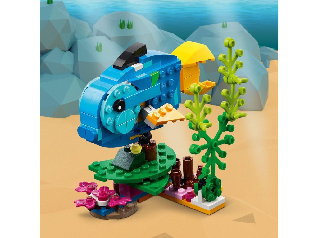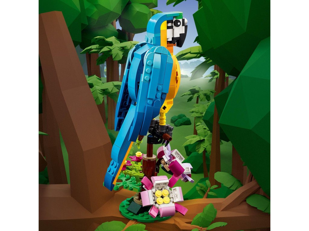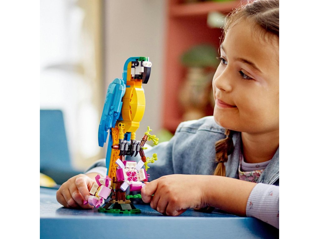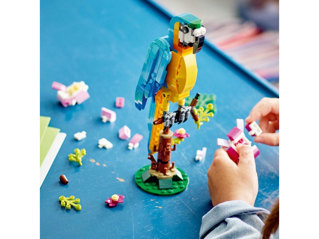 Malí stavitelia a milovníci zvierat od 7 rokov sa teraz môžu vydať na cestu do dažďového pralesa, kde sa môžu tešiť na príbehy plné akcie s touto stavebnicou LEGO® Creator 3 v 1 Exotický papagáj (31136). Obsahuje farebného papagája, ktorý pri sedení na konári dokáže plne otáčať telíčko a hýbať krídlami aj chvostom. 3 modely v 1 na rozprúdenie tvorivej zábavy Vďaka tejto fantastickej stavebnici LEGO 3 v 1 si deti teraz môžu postaviť až tri rôzne exotické zvieratá. Na výber majú pestrofarebného papagája sediaceho na konári, hravú rybu, ktorá pláva na dne mora, a šantivú žabku, ktorá hýbe nohami. Zábavný digitálny zážitok pre fanúšikov LEGO Stiahnite si appku LEGO Builder a vstúpte do sveta staviteľskej zábavy, v ktorom si deti môžu svoje modely približovať a otáčať v 3D prostredí, ukladať stavebnice a sledovať postup stavania.Dodatočné parametre