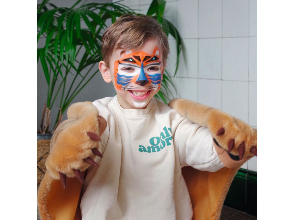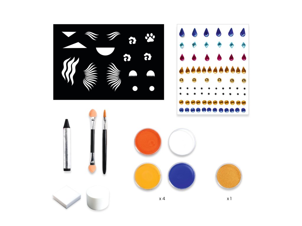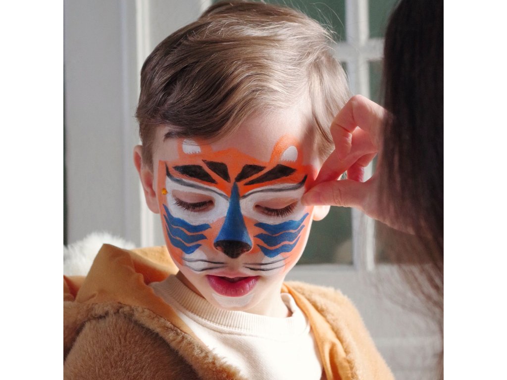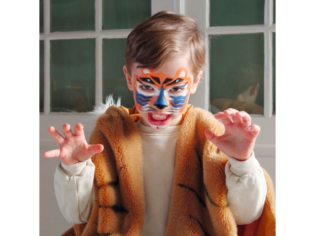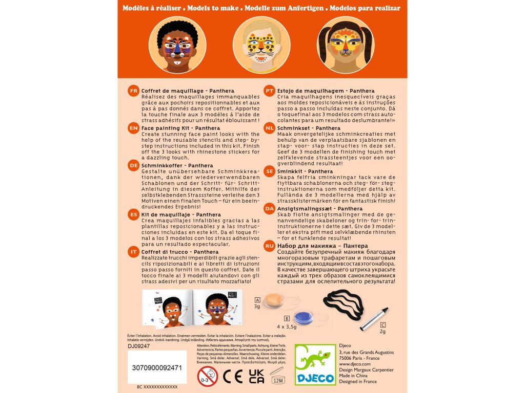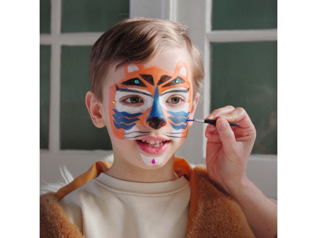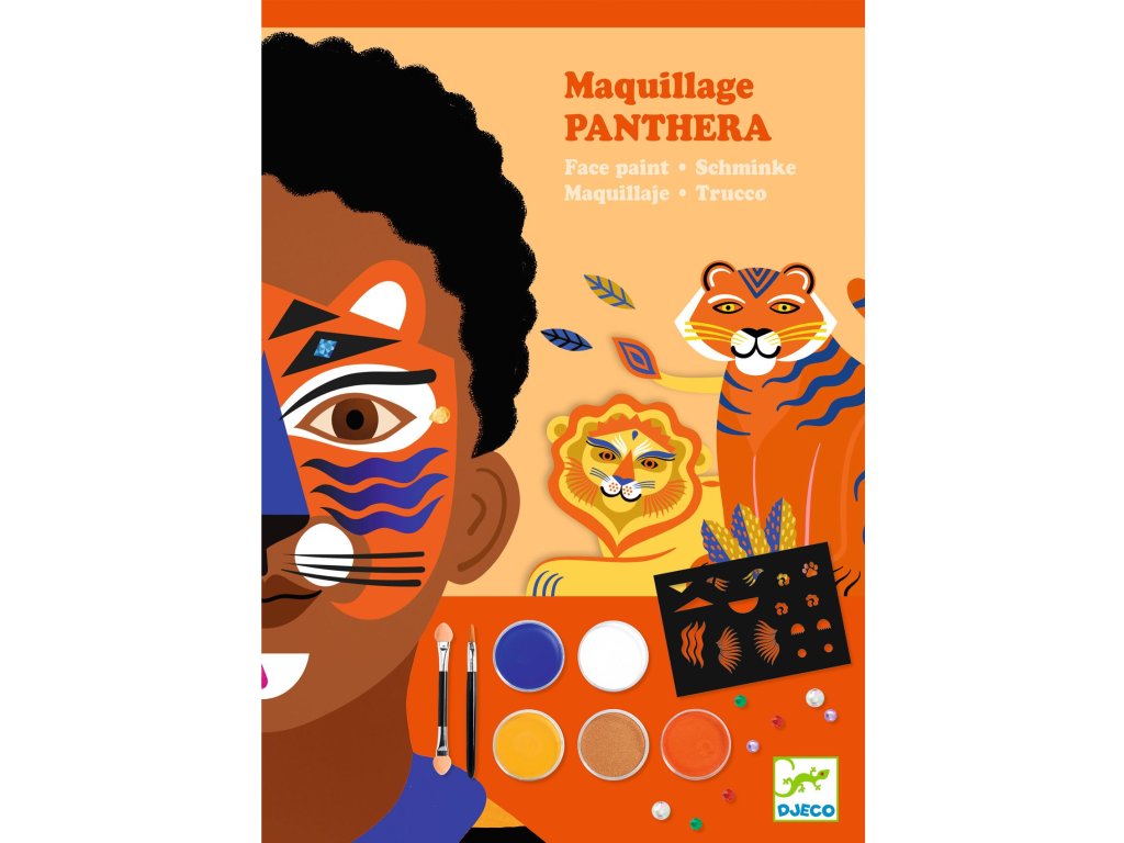 Farby na tvár Panter Staň sa šelmou za pár minút: panter, tiger či leopard s perličkami a šablónamiFarby na tvár – Panter sú sada na detské líčenie, ktorá pomôže vytvoriť výraznú premenu aj bez skúseností.Vďaka šablónam na pokožku jednoducho spravíš škvrny, pruhy či detaily, perleťový/metalický prvok dodá lesk a samolepiace perličky a kamienky urobia finálny „wow“ efekt.Rýchly prehľad odporúčaný vek: 4 – 7 rokov 3 hotové predlohy: v návode nájdeš postupy na 3 zvieracie looky jednoduchá aplikácia: hubkou na plochy, štetcom na detaily, šablónou na vzory extra efekt: metalický tieň + perličky a kamienky materiál balenia: papier/kartón s certifikáciou FSCObsah balenia 4 farby na tvár 1 metalický tieň na oči 1 ceruzka 1 štetec 2 hubky 1 obojstranný aplikátor/tieňovací štetec 1 hárok šablón na pokožku cca 40 samolepiacich perličiek a kamienkov 1 návod krok za krokom (predlohy na 3 looky)Ako to funguje Vyber si look z návodu a priprav farby, hubku alebo štetec. Prilož šablónu na pokožku a jemne nanes farbu (hubkou/štetcom). Detaily dokresli ceruzkou a pridaj metalický lesk tieňom. Na záver nalep perličky a kamienky – hotovo, šelma je na svete.Pre koho je na karneval, oslavy, fotenie a rolové hry pre deti, ktoré milujú divoké zvieratá a výrazné masky ako aktivita, ktorú zvládnete rýchlo aj domaDodatočné parametre