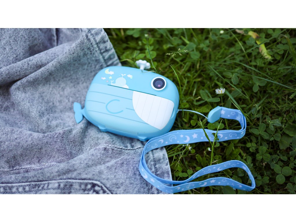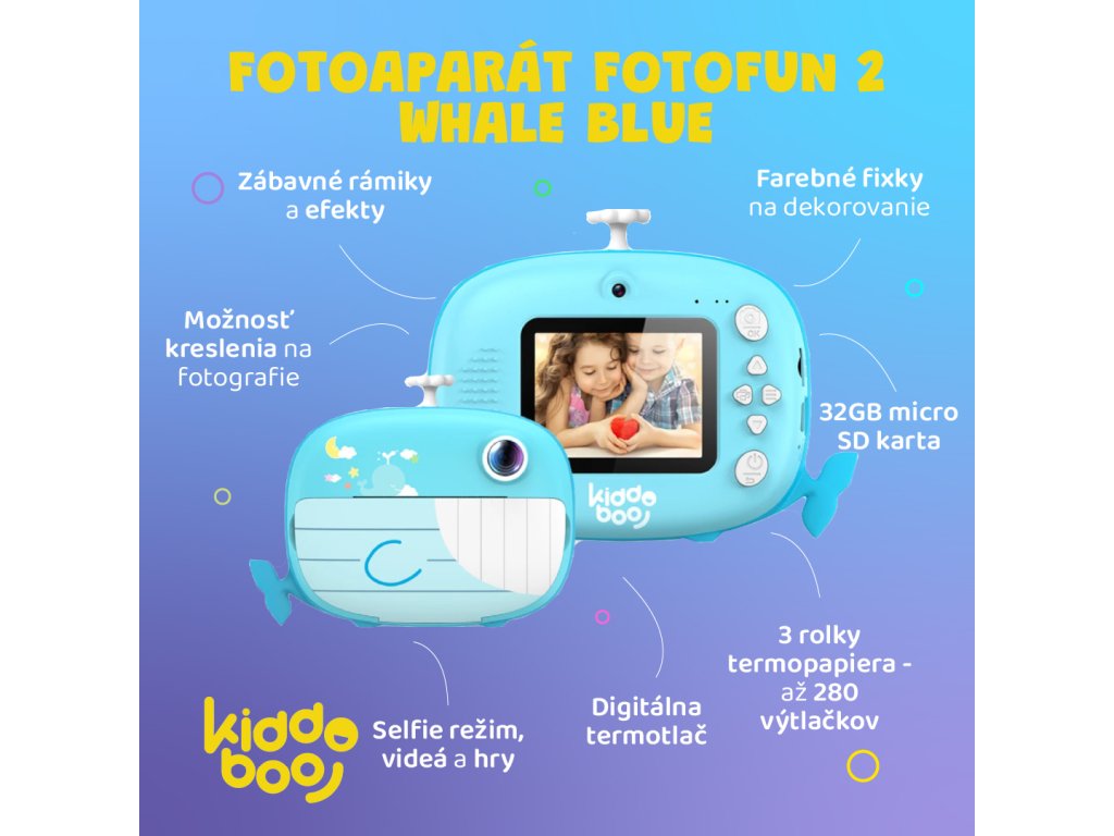 Fotoaparát FotoFun 2 Whale Blue Foťák plný hviezdnych momentov Hľadáte ideálny darček pre zvedavé dieťa, ktoré miluje zábavu, kreslenie a objavovanie sveta? Detský fotoaparát Kiddoboo FotoFun 2 Whale Blue je presne to, čo hľadáte! Tento rozkošný kamarát ponúka nielen možnosť fotografovania a natáčania videí, ale aj okamžitú tlač fotografií – a to všetko v dizajne, ktorý si deti okamžite zamilujú. Tento detský instantný fotoaparát je ideálny spoločník na výlety, oslavy, prázdniny aj bežné dni plné objavovania. Premení každé dobrodružstvo na spomienku.Vytvor – Vytlač – Vyfarbi! Zábavné rámiky a efekty – predinštalované vo fotoaparáte pre originálne výtvoryMožnosť kreslenia na fotografie – v balení nájdete farebné fixkySelfie režim, videá a hry – zábava na každom krokuVšetko v jednom balení Detský fotoaparát FotoFun 2 Whale Blue3 rolky termo papiera (až 280 výtlačkov)Farebné fixky na dekorovanie32GB micro SD karta na ukladanie fotiek a videíBatéria s výdržou na dlhé hodiny hraniaZabudované mäkké ochranné puzdro a šnúrka na krkPrečo si vybrať Kiddoboo Fotoaparát FotoFun 2 Whale Blue? Rozvíja detskú kreativitu a motorikuPodporuje samostatnosť a zábavnú formu učeniaVhodný darček pre deti od 3 rokov Tu nájdete návodDodatočné parametre