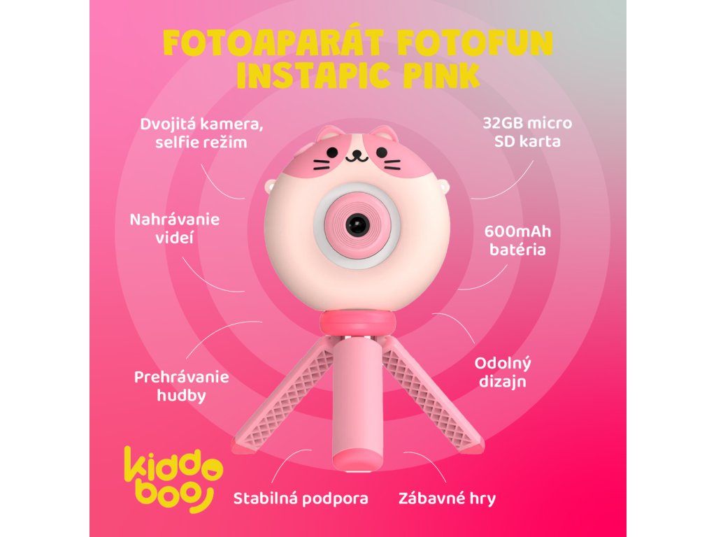 Fotoaparát FotoFun Instapic Pink Selfie? Video? Hudba? Hra? Instapic to vie všetko! Hľadáte ideálny darček pre dieťa, ktoré miluje fotenie, natáčanie videí a zábavu? S prednou a zadnou kamerou, možnosťou selfie, nahrávania videí a prehrávania hudby ponúka nekonečné možnosti kreativity a zábavy.Nová éra kreativity začína s Instapic: Dvojitá kamera – predná a zadná pre rôzne uhly záberovSelfie režim – jednoduché zachytenie seba saméhoNahrávanie videí – tvorba vlastných príbehov a vlogovPrehrávanie hudby – vstavaný reproduktor a hudobná knižnicaZábavné hry – predinštalované hry pre chvíle oddychuStabilná podpora – multifunkčný stojan slúži ako statív alebo selfie tyčKompletný balíček pre malých kreatívcov: Detský Kiddoboo fotoaparát FotoFun Instapic Pink32GB micro SD karta – dostatok miesta na fotografie a videá600mAh batéria – dlhá výdrž pre nepretržitú zábavuOdolný dizajn – navrhnutý pre detské ruky a aktívne používanieKiddoboo fotoaparát FotoFun Instapic Pink je viac než len fotoaparát – je to nástroj, ktorý podporuje kreativitu, sebavyjadrenie a zábavu. Ideálny pre deti, ktoré chcú objavovať svet fotografie a videa vlastným spôsobom.Fotoaparát je lokalizovaný v anglickom jazyku. Neobsahuje slovenčinu alebo češtinu. Tu nájdete návodDodatočné parametre