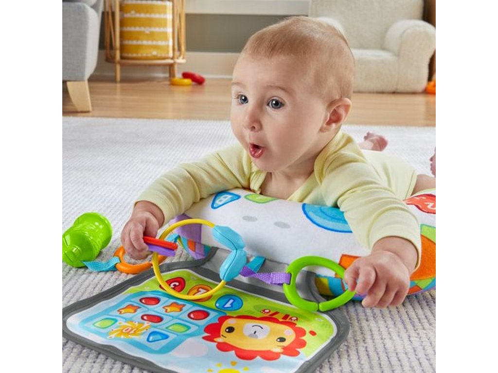 Vankúšik pod bruško pre najmenších hráčov od Fisher-Price® zaistí super zábavu pre čas na brušku. Tento mäkký vankúšik pomáha udržať pohodlie vášho bábätka pri hre (a hranie hier!) s pomocou šuštiacej obrazovky, klapacích dielikov na krúžku v tvare slúchadiel a hrkálky v tvare fľaštičky na pitie pripevnenými k vankúšiku. Váš maličký hráč si môže pri hraní na brušku posilňovať hrubú motoriku a potešiť svoje zmysly zábavnými zvukmi a štruktúrou materiálov.Dodatočné parametre