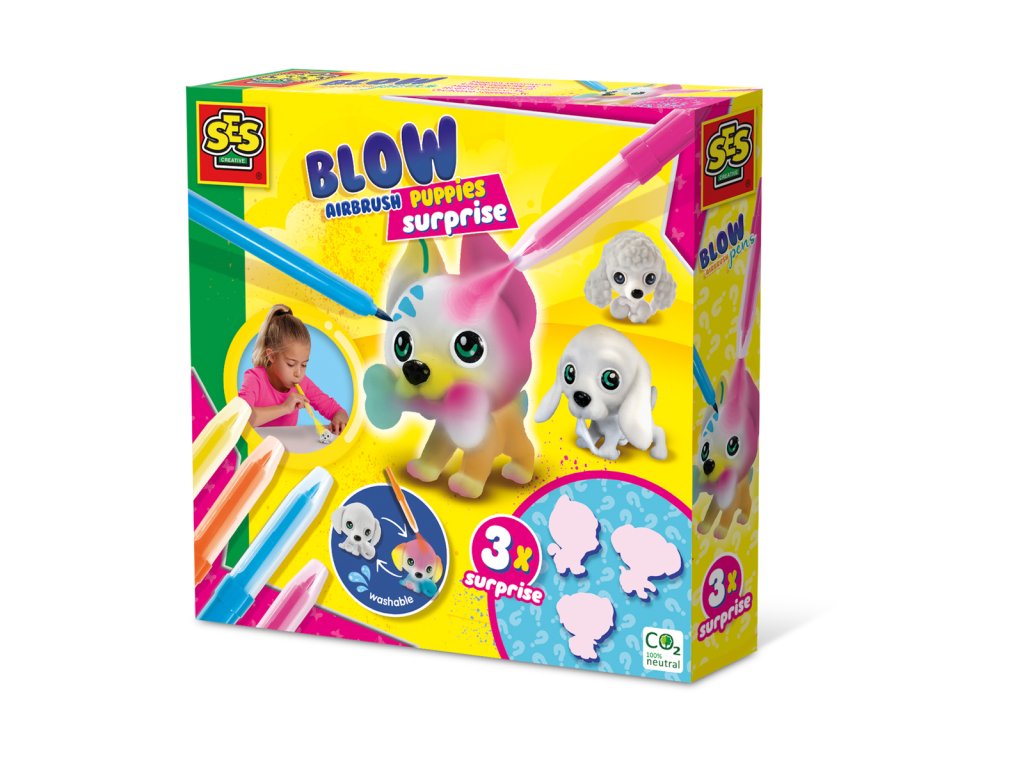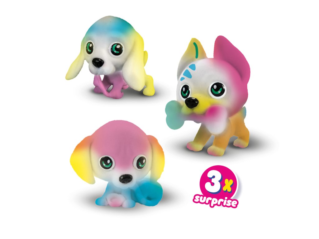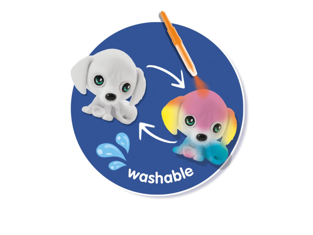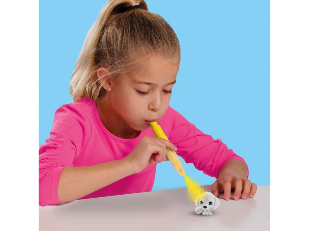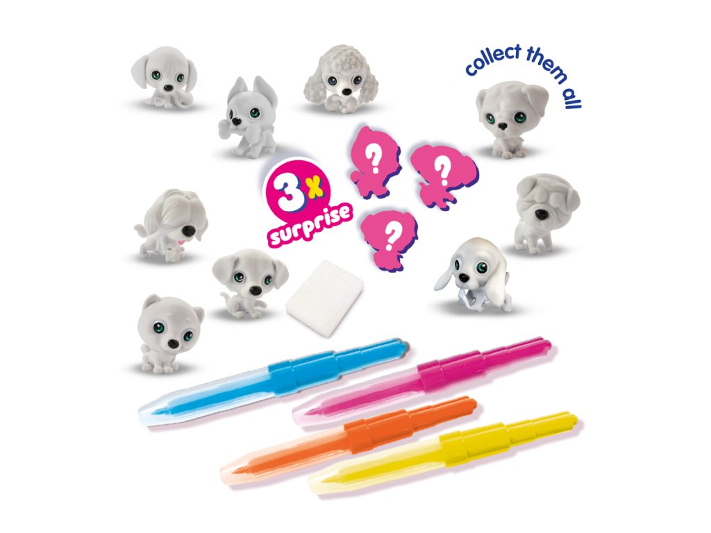 Kreatívna sada s fúkacími fixami – šteňatká 3x prekvapenie. Tri prekvapenia čakajú na svojich objaviteľov. Nájdite figúrku šteňatka s jemnou bielou srsťou. Sada obsahuje 4 x farebné fúkacie fixy s ktorými môžete každému šteňatku dať veselé farby, bodky alebo pruhy. Hotovo? Omyte ich docista pod tečúcou vodou a šteňatká budú pripravené na opätovné tvorenie. Nazbierajte všetkých 9 šteňatiek z kolekcie. Obsah balenia: 3 x figúrka šteňatka, 4 x fúkacia fixa – oranžová, žltá, ružová a modrá, špongia. Balené v krabičke. Rozmery balenia: 20 x 20 x 4 cm. Vek: 5+Dodatočné parametre