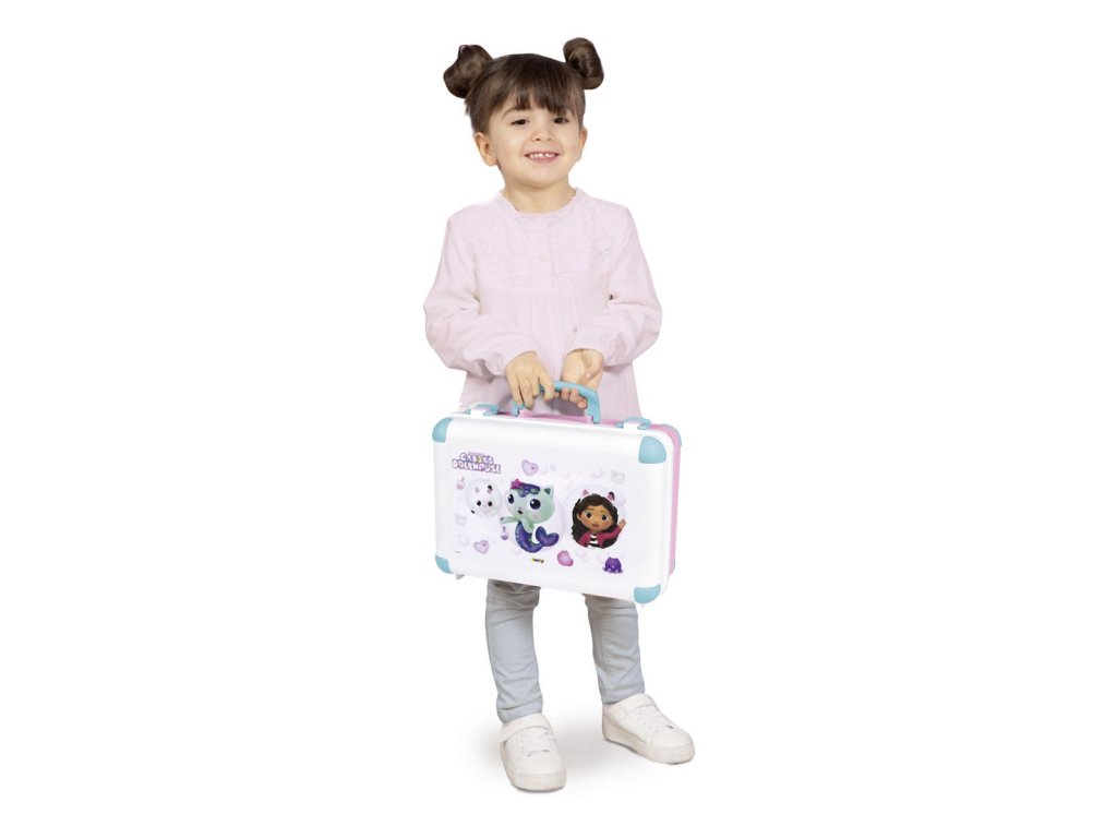 Kozmetický kufrík v dizajne Gabby´s Dollhouse je naplnený všetkým, čo je potrebné pre skvelé mobilné wellness, či už ide o účes, nechtový salón alebo make-up. Všetkých 15 doplnkov (atrapy kozmetiky na hranie) nájdete vo vnútri kufríka s rukoväťou, ktorý možno vziať kamkoľvek: 2 laky na nechty, 2 rúže, paleta očných tieňov, riasenka, štetec, spona, hrebeň, náhrdelník, náramok, 2 prstene, nádobka na krém a 2 krabičky. Vďaka možnosti zamknutia sa na ceste z kufríka nič nestratí. Navyše má zrkadlo a tajnú priehradku. Police vo vnútri je možné sklopiť, na vytvorenie priestoru pre ďalšiu kozmetiku. Rozmery produktu (D׊×V): 35,5 × 28,6 × 28,5 cm.Dodatočné parametre