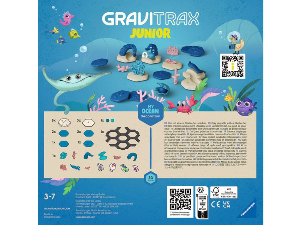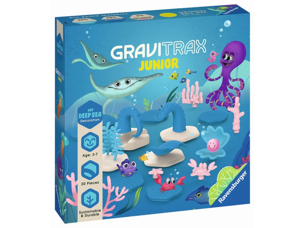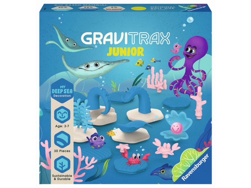 GraviTrax Junior je interaktívny systém guľôčkovej dráhy pre deti od 3 rokov. Tí najmenší si stavajú svoje vlastné svety z guľôčkových dráh, ktoré je možné podľa ľubovôle zdobiť a vytvárať tak jednotlivé tematické svety. Deti si tak pri kreatívnom stavaní užijú mnoho zábavy. Rozšírenie Oceán obsahuje rôzne dekoračné prvky a zvieratká z podmorského prostredia. Deti si tak môžu v rámci GraviTrax dráhy vystavať svoj vlastný podmorský svet a zažiť svet oceánu zblízka. Všetky stavebné a dekoračné súčasti sú vyrobené z dreveného bioplastu.Dodatočné parametre