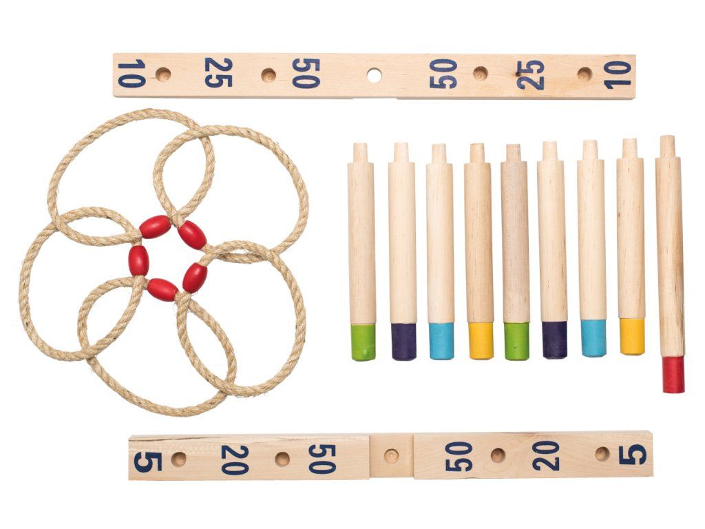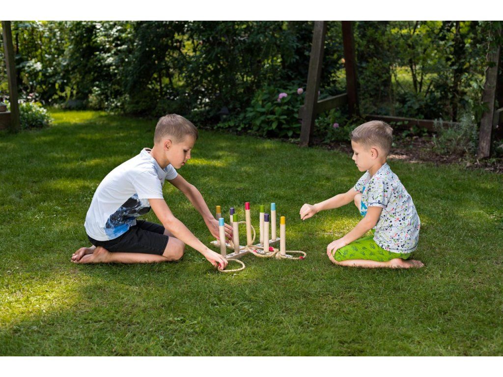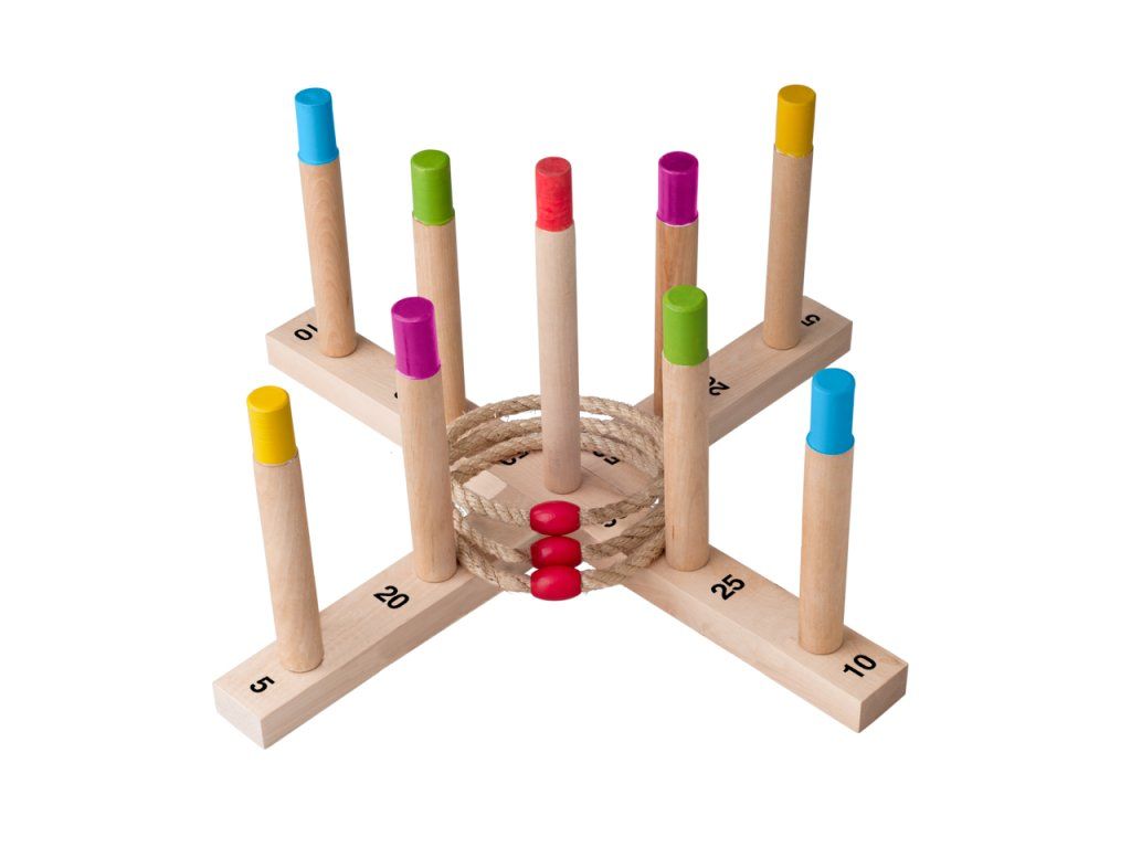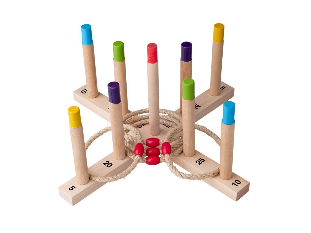 Zábavný spôsob, ako trénovať obratnosť. Cieľom je hádzať 5 pletených povrazových krúžkov na drevený kríž s tyčkami a získať čo najviac bodov.| Vek: 3+ | Rozmer: 49 x 49 cmDodatočné parametre