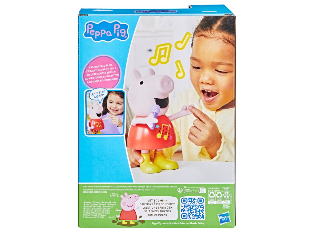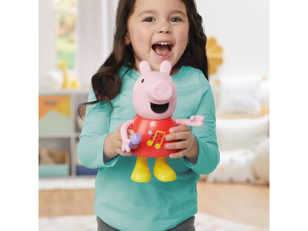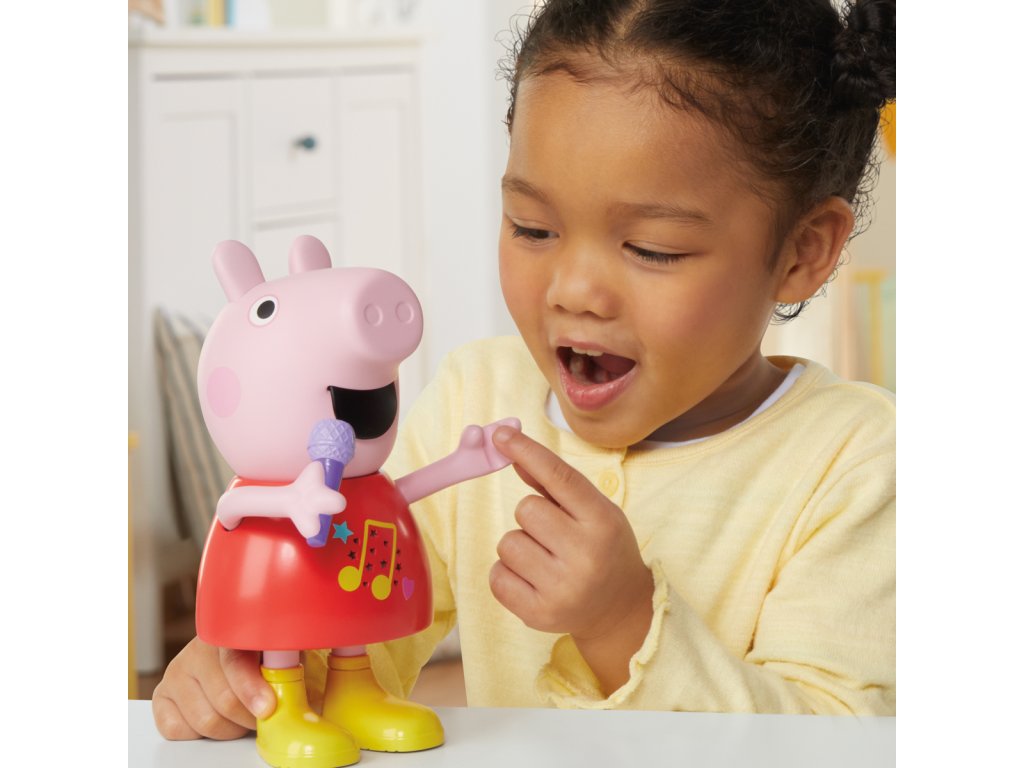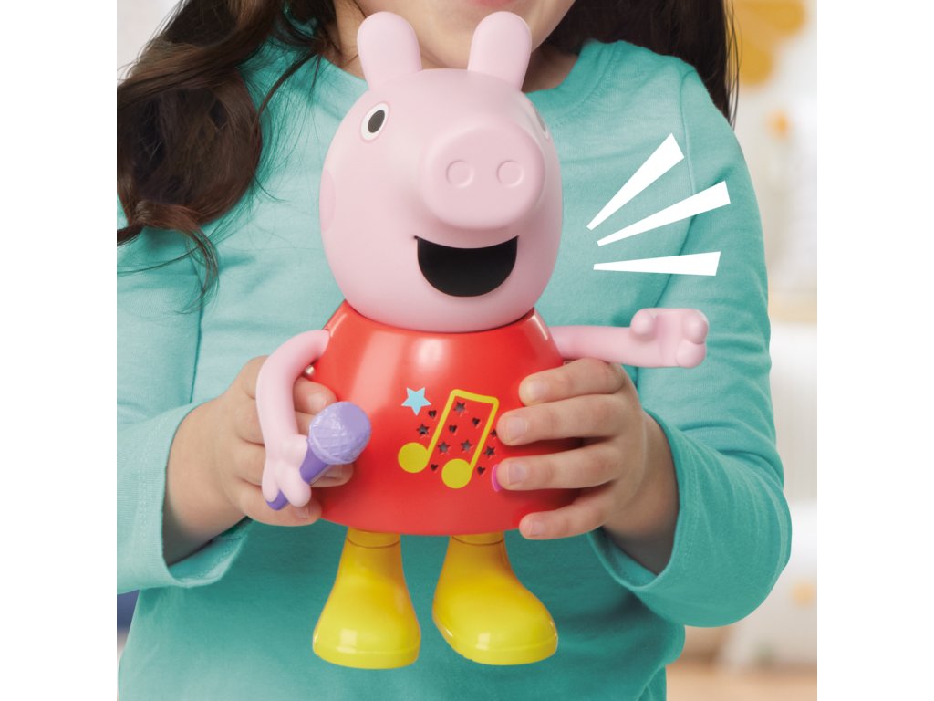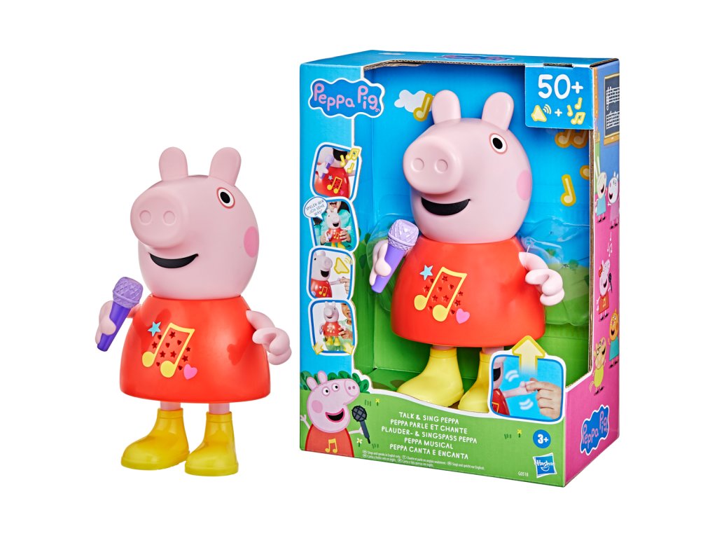 Mluvící a zpívající prasátko Peppa Pig. Díky více než 50 frázím, písním a zvukovým efektům bude hra s mluvícím a zpívajícím prasátkem Peppa tak zábavná. Tato super roztomilá hračka pro dívky a chlapce mluví, hraje a zpívá čtyři písničky, výměna režimů je stejně snadná jako pohyb jejího mikrofonu nahoru nebo dolů. Děti mohou pohybovat její paží, aby se její ústa pohybovala a slyšely ji mluvit nebo zpívat. Malé prasátko dokáže předstírat, že skáče do blátivých louží, aby předvedlo šplouchající zvukové efekty. Prasátko mluví a zpívá pouze v angličtině. Popis a varování jsou v českém jazyce. Funguje na baterie 2x AAA, které jsou součástí výrobku. Výška prasátka: 20 cm. Rozměry balení: 25,4 x 17,8 x 10,2 cm. Věk: 3+Dodatočné parametre