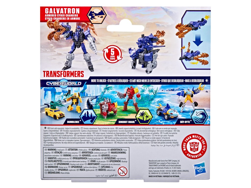 Transformers Cyberworld - Armored Cyber Changers vám přináší známé tváře a nové bojové strategie! Posilte se svými oblíbenými Autoboty a Decepticony, zatímco bojují o galaktickou nadvládu. Akční figurka Galvatron se snadno promění z robota na alternativní mód draka v 5 krocích. Přeměna v 5 krocích je dostatečně jednoduchá, aby ji děti zvládly samy. V režimu robota je figurka vysoká přibližně 10 cm a je polohovatelná. Součástí figurky je blaster, který má dva úžasné režimy a lze jej připevnit k figurce v režimu robota i draka. Vyrobeno z kvalitního plastu. Rozměry balení: 18,1 x 17,7 x 4,9 cm. Věk: 6+Dodatočné parametre