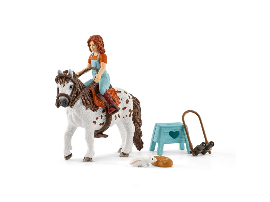 Osmiletá Mia nemá z ničeho strach, ani z koní. Jednoho se dne odhodlala jet na tak velkém koni, jako jezdí její starší sestra Hannah. Ačkoliv Mia a její tříletá Shetlandská pony kobylka Spotty vypadá tak sladce, umí být pěkně vychytralá. Figurky Schleich jsou modelovány v nejjemnějších detailech a povzbuzují děti k hraní a učení. Figurka Mia může jezdit na koni a má pohyblivé ruce. Sada obsahuje: 1x figurka Mia, 1x shetlandská pony, 1x sedlo, 1x třmeny, 1x uzda, 1x stolička, 1x dalekohled, 1x pečivo, 1x myška. Rozměr: 15 x 5,5 x 11,5 cm. Nevhodné pro děti do 3 let. Doporučený věk: 5-12.Dodatočné parametre
