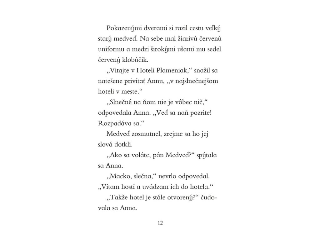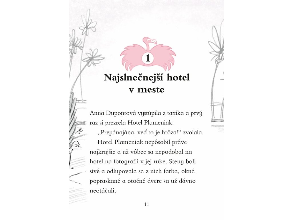 Hotel Plameniak 1 Dobrodružný príbeh o záchrane chátrajúceho hotela, priateľstve a zvieracích hosťochAnna je novou majiteľkou Hotela Plameniak. Kedysi veľkolepý hotel však chátra a dievčatko čaká náročná úloha. S pomocou svojich zamestnancov a priateľov – vrátnika pána Medveďa, recepčného lemura Lemyho či svetoznámej kuchárky Madam La Svinky – chce, aby sa tu každé zviera, malé i veľké, cítilo ako doma.Podarí sa Anne vrátiť hotelu dávny lesk a zašlú slávu?Dodatočné parametre