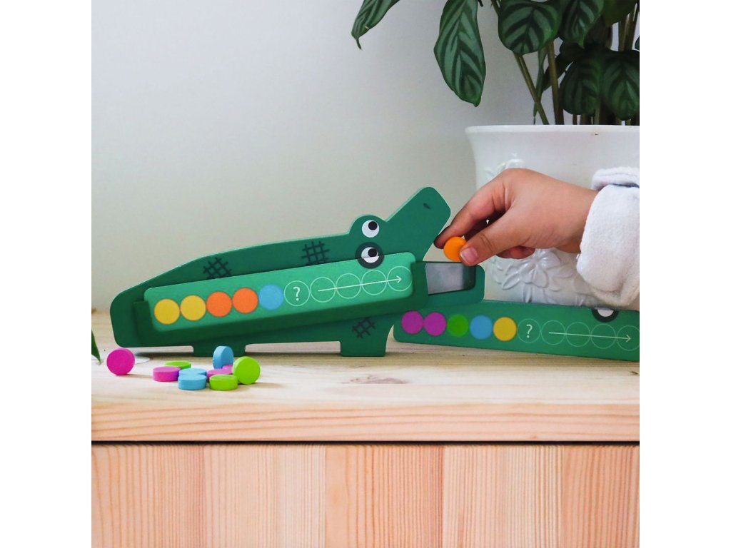 Hra CrococrocNakŕm hladného krokodíla – ale len v správnom poradí!Hra Crococroc je ideálna pre malých zvedavcov, ktorí milujú výzvy, farebné žetóny a hravé učenie. Úlohou detí je nakŕmiť dreveného krokodíla podľa presného poradia, ktoré určuje predlohová kartička. Stačí si vybrať zadanie, položiť kartičku na krokodílovo brucho a sledovať farebný rad. Potom krokodílovi „napcháte“ do papuľky drevené žetóny v správnom poradí. Keď je krokodíl nasýtený, deti si jednoducho otočením kartičky overia, či dokázali dodržať správnu postupnosť. Hravý princíp okamžite motivuje deti skúšať to znovu – s novými úlohami aj vyššou náročnosťou.Zábavná a edukatívna hra v jednomCrococroc je skvelou aktivitou na rozvoj: logického myslenia – dieťa musí sledovať poradie a plánovať ďalší krok, pamäti a pozornosti, porozumenia sekvenciám a vytváraniu správnych postupností, jemnej motoriky pri manipulácii so žetónmi, trpezlivosti a sústredenia – vlastností dôležitých pre predškolákov. Hra podporuje aj vizuálne vnímanie vďaka farebným kombináciám a jednoduchému grafickému spracovaniu.Perfektná hra na doma, do škôlky aj pre Montessori učenieCrococroc ponúka až 20 predlohových kartičiek s úlohami rôznej náročnosti, takže deti môžu postupne napredovať. Je to ideálna pomôcka pre: rané matematické a logické schopnosti, učenie sa správnych poriadkov (sekvencií), predškolskú prípravu, individuálnu aj skupinovú hru. Obsah balenia 1 drevený krokodíl 20 drevených farebných žetónov 20 kariet so zadanímDodatočné parametre